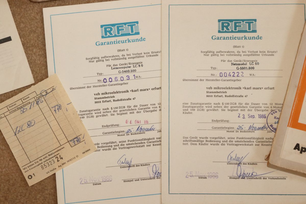{LC 80 SBC} Dank eines überaus großzügigen Spenders erreichte mich ein wahres Kleinod aus dem Jahr 1986: der DDR-Lerncomputer LC 80. Und nicht nur der Computer befand sich in den Paketen, sondern auch das komplette Zubehör, vom Netzteil über die Bücher, bis hin zu den Garantieurkunden und dem Kassenzettel! Vielen herzlichen Dank an Roland!
