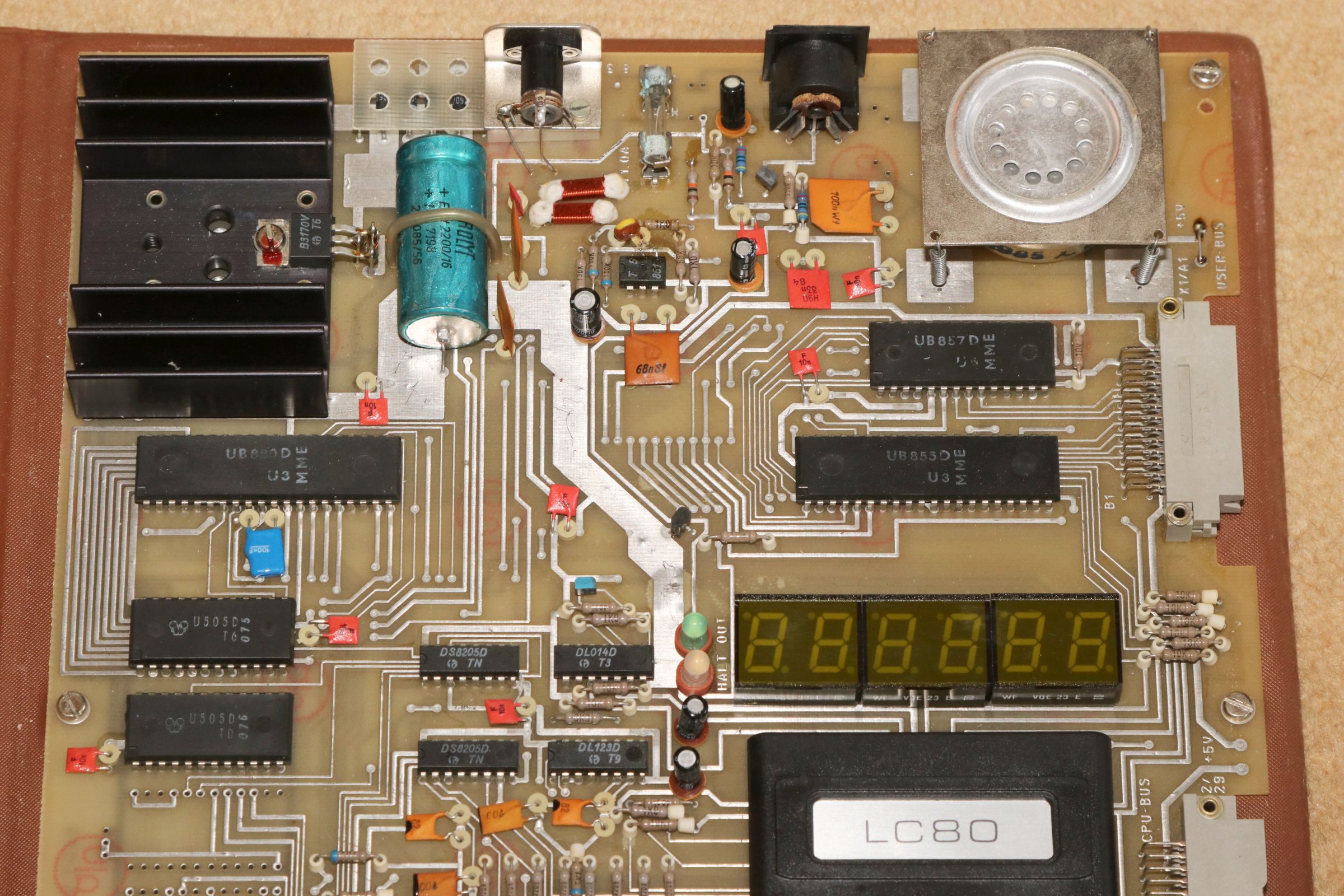770 Mark für ein SBC und ein Netzteil... Wenn ich recht informiert bin, so entsprach das 1986 fast einem durchschnittlichen Monatseinkommen... Die Komponenten befinden sich in geschmackvollen Holzfurnierimitat-Pappkartons... Jeder LC 80 besitzt seine eigene Seriennummer. Im Holzfurnierimitat-Pappkarton ist ein geschmackvoller Lederimitat-Plasteordner... ... in dem wiederum ein ... sag mal, wird das hier so ein russisches Holzpuppenspiel? Uff... da ist er ja: der LC 80. Tastatur (das Gehäuse dürfte von einem SR-1 stammen), Schnittstellenbaustein UB855D (Z80-PIO) und 4kByte RAM. In der oberen Hälfte finden sich die beiden Betriebssystem-ROMs U505D (Mask-ROM 1kx8) mit den Masken 075 und 076, sowie der Z80-Nachbau UB880D und ein weiterer PIO-Baustein, ein UB857D (Z80-CTC) und natürlich die Siebensegment-Anzeigen. Hier in sehr hoher Auflösung die gesamte Platine des LC 80: Die Tastatur ist erstaunlich angenehm zu bedienen und funktioniert trotz ihres Alters einwandfrei! Die Verarbeitung ist mustergültig, inklusive hunderter Plaste-Abstandshülsen. 1k RAM sind standardmäßig bestückt. Mein Exemplar ist auf wahnsinnige 4kB aufgebohrt. Das Display zeigt im Normalfall Adressen und Daten an - wie eigentlich alle SBCs aus dieser Zeit. Alles, was ein Hardcore-Coder braucht. Erstaunlich: auch diese Sicherung oxydiert hier so vor sich hin, genau wie beim KC 85/3. Vielleicht hatte es bei der Fertigung korrosive Reste nach der Vernickelung gegeben... Ein besonderes Kleinod: das Transformatornetzteil mit eingebauter Schuko-Steckdose. Da hat mal wer sinnvoll mitgedacht! Wo nicht viel drin ist, kann auch nicht viel kaputt gehen. Und mutig wie ich bin, hab ich das Gerät gleich mal eingesteckt. Es hat nach all den Jahren auf Anhieb funktioniert! {LC 80 SBC Startvideo} Und wer sich noch einen schönen Ohrwurm einhandeln möchte, der kann sich jetzt dieses kurze Video vom Rechnerstart ansehen und anhören! "Popcorn" von "Hot Butter" aus dem Jahr 1972... |