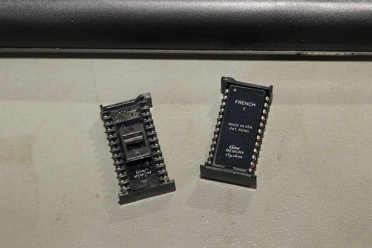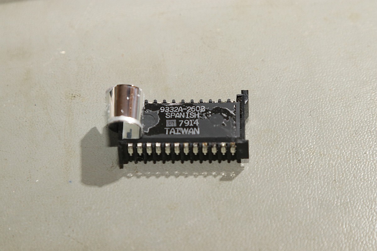 Ein Blick unter die Plastikfolie zeigt: stinknormale maskenprogrammierte PROMs der Serie 9332A - also 2kByte Speicherplatz für eine Sprache. Das dürfte den Wortschatz sehr übersichtlich halten! Aber das Konzept ist schlau!