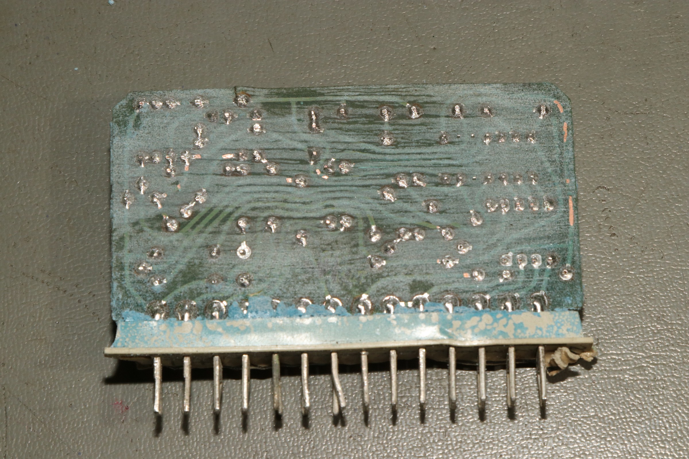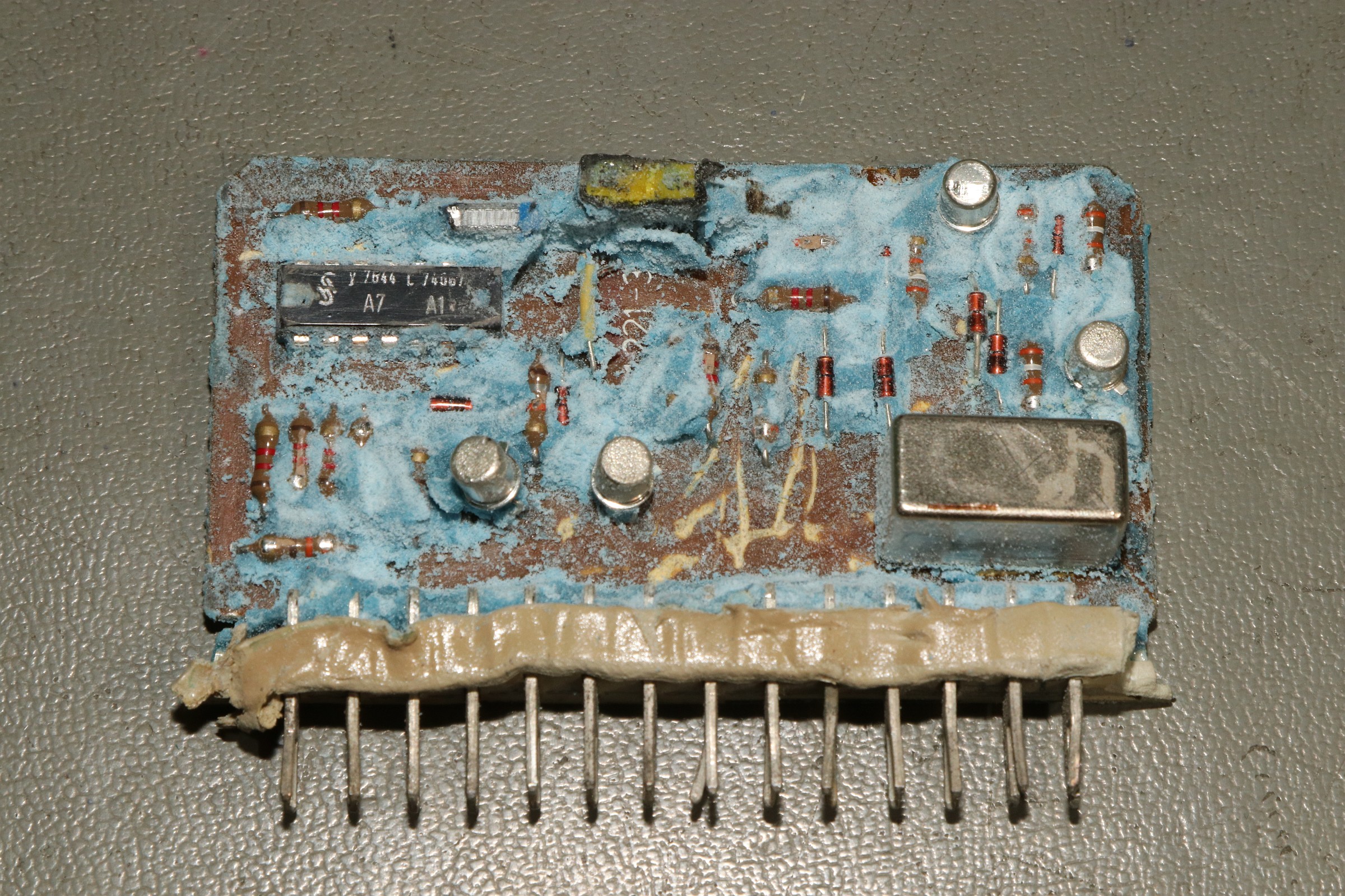 Eine Stunde, 250°C und eine Schraubenzieherklinge später: jetzt bin ich zufrieden. Hier ist minimale Technik versenkt, ein Flipflop vermutlich, etwas Hühnerfutter für die Ansteuerung und ein Relais für den Ausgang... Das Teuerste am ganzen Modul war vermutlich die Vergussmasse. Selbst die Leiterplatte ist nur einseitig und aus Hartpapier. Was ist ein 74067? Hier hat Siemens vermutlich Standard-ICs einfach anders beschriftet.