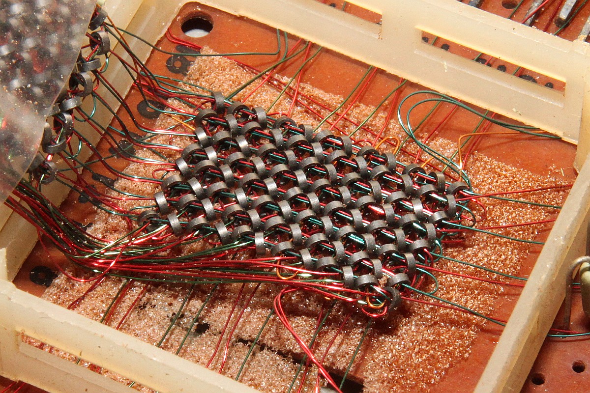 {Der Kernspeicher} Die PCB hat schon harte Zeiten mitgemacht, einige Teile fehlen, die Platine ist zerbrochen - egal, der Kernspeicher ist noch in einem Stück!