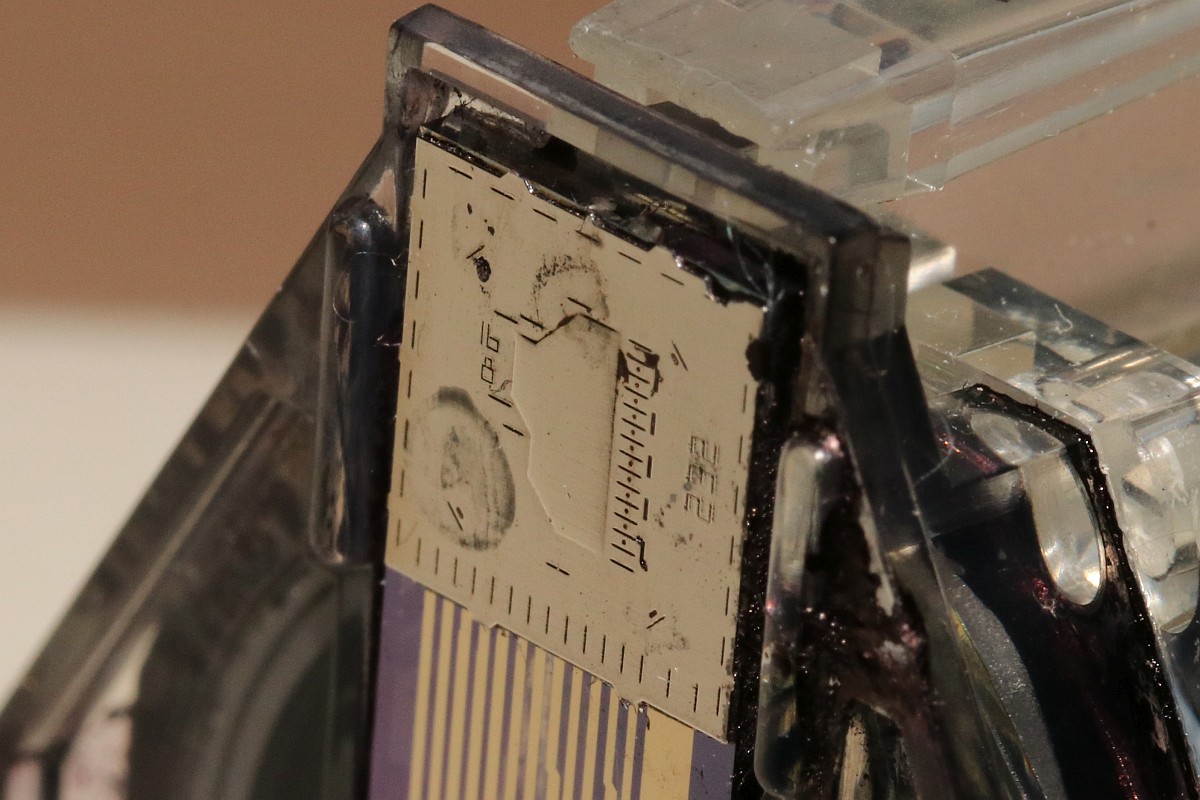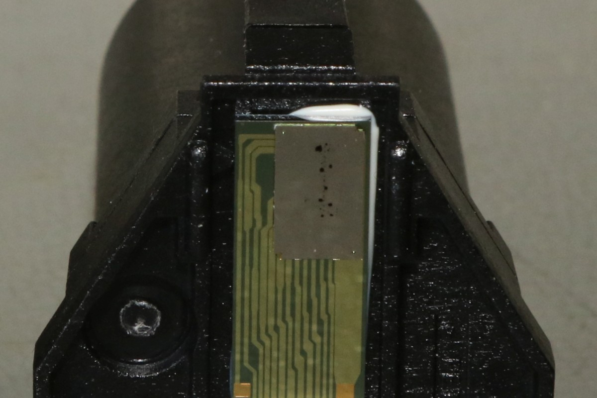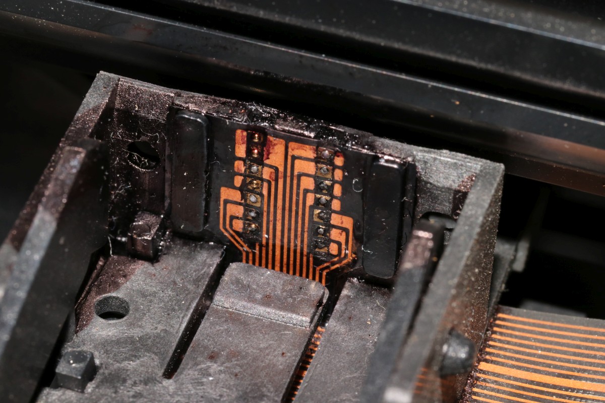 {HP2225AB Thinkjet Tintenstrahldrucker} Ein schöner alter Tintenstrahldrucker ist mir zugelaufen - einer der Ersten! HP2225AB Thinkjet mit HPIB-Anschluss... das wäre doch was für meinen HP-85... Auf der Rückseite gibt es viel zu sehen: Spannungsversorgung, HPIB-Anschluss und HPIB-Adressschalter.. Die Tintenpatrone ist eine ganz alte... im durchsichtigen Gehäuse mit aufwändigem Düsenblech. Natürlich völlig vertrocknet! Und damit beginnt bei diesen Druckern eines der Probleme: die aussickernde Tinte verätzt und korrodiert die vergoldeten Kontakte auf der Flachbandleitung. Wenn es ganz schlimm kommt, dann sind sogar die Kupferleitungen durchkorrodiert... Nach gründlicher Reinigung mit Alkohol und Wattestäbchen sieht die Druckdüse ganz gut aus, man erkennt einiges: Unten die Anschlusskontakte und oben die Tintenkammer mit 12 Düsenlöchern. Die Kontakte auf der flexiblen Leiterplatte sind ganz schön mitgenommen - die Leiterbahnen sehen noch gut aus. Ich bin gespannt... Es gibt noch problemlos neue Tintenpatronen zu kaufen - das hätte ich nicht gedacht. Leider funktioniert beim Testausdruck genau eine Düse... Links die alte, rechts die neue Patrone - bei der Neuen hat man im Design der Düsenplatte ziemlich an Komplexität gespart. Die alte Bauform hat eine ausgeprägte Tintentasche unter den Düsenlöchern. Die neue Bauform ist einfach nur flach. Wenn man bei der alten Bauform die Platte entfernt, dann sieht man genau, wie diese Art des Tintenstrahlers funktioniert: Direkt unter jeder Düse liegt ein Widerstand - dieser wird unter Spannung gesetzt, heizt sich blitzschnell auf, die Tinte kocht an dieser Stelle und schleudert einen Tropfen der darüber liegenden kalten Tinte durch die Düse auf das Papier. Bevor ich weiter über die Wiederherstellung der Kontakte zur Patrone nachdenken konnte, gab das Netzteil ein lautes Zischen von sich und der Drucker bestach nicht nur durch interessante Technik, sondern auch durch penetranten Gestank.... Ich hasse Entstörkondensatoren - vor allem, wenn sie gekapselt eingebaut sind.. Keine Ahnung, was ich jetzt mit dem Ding mache - ich habe weder eine solche Entstörkombination zur Hand, noch ein Ersatz-Flachbandkabel... Dabei funktioniert der Rest noch so gut... Die Elektronik ist überschaubar! Zwei HP-Customs und 1820-3636 ist ein schnöder umgelabelter und programmierter 8048... Vielleicht fällt mir ja mal ein Spenderdrucker in die Finger... |