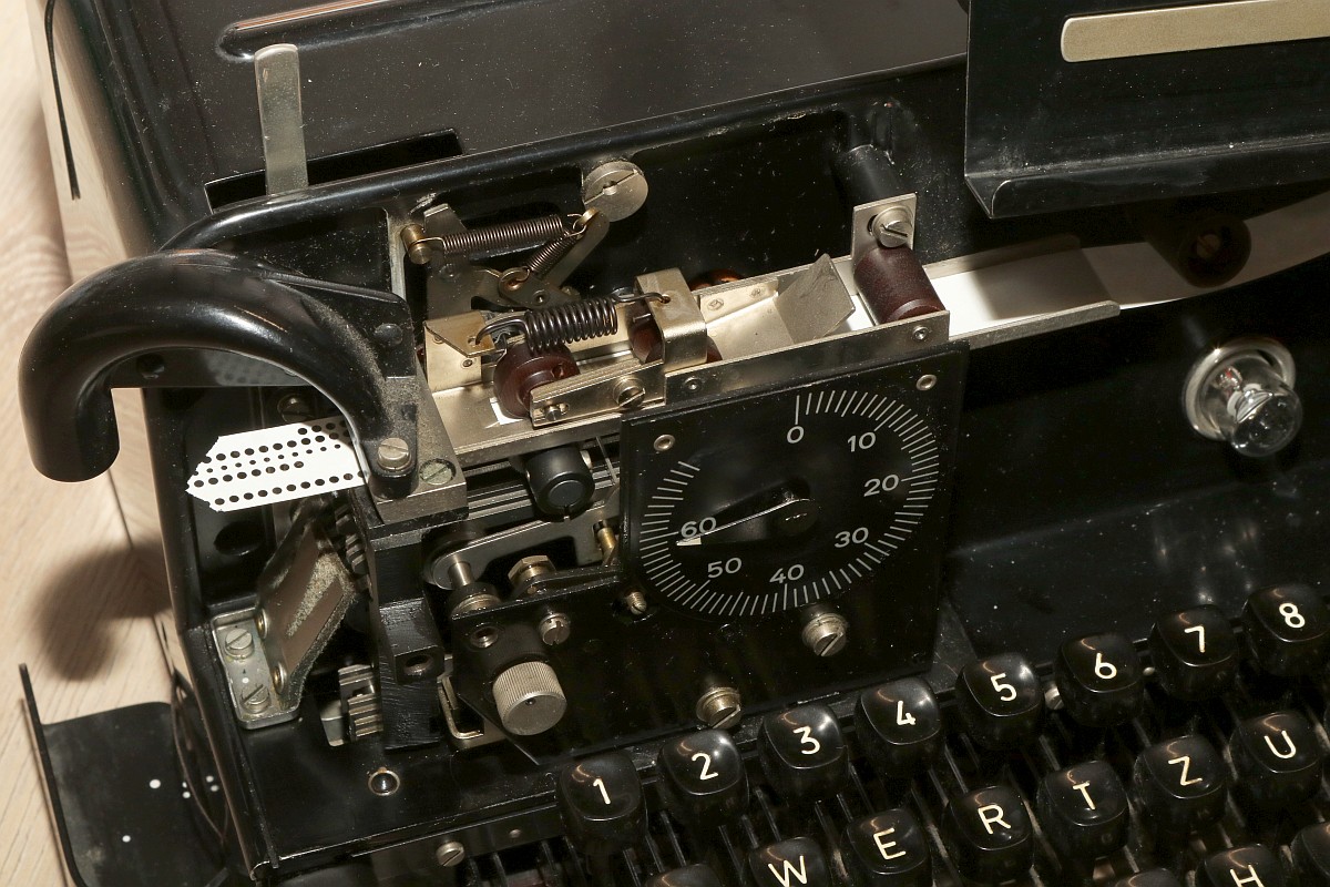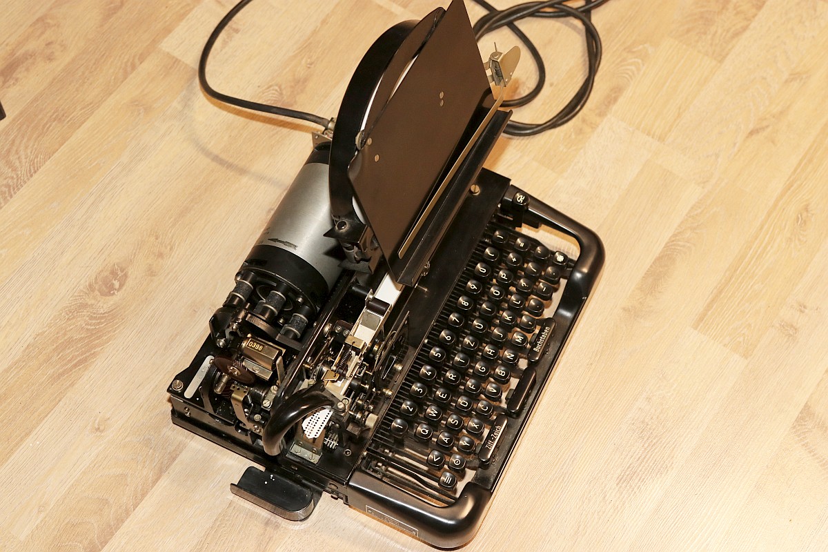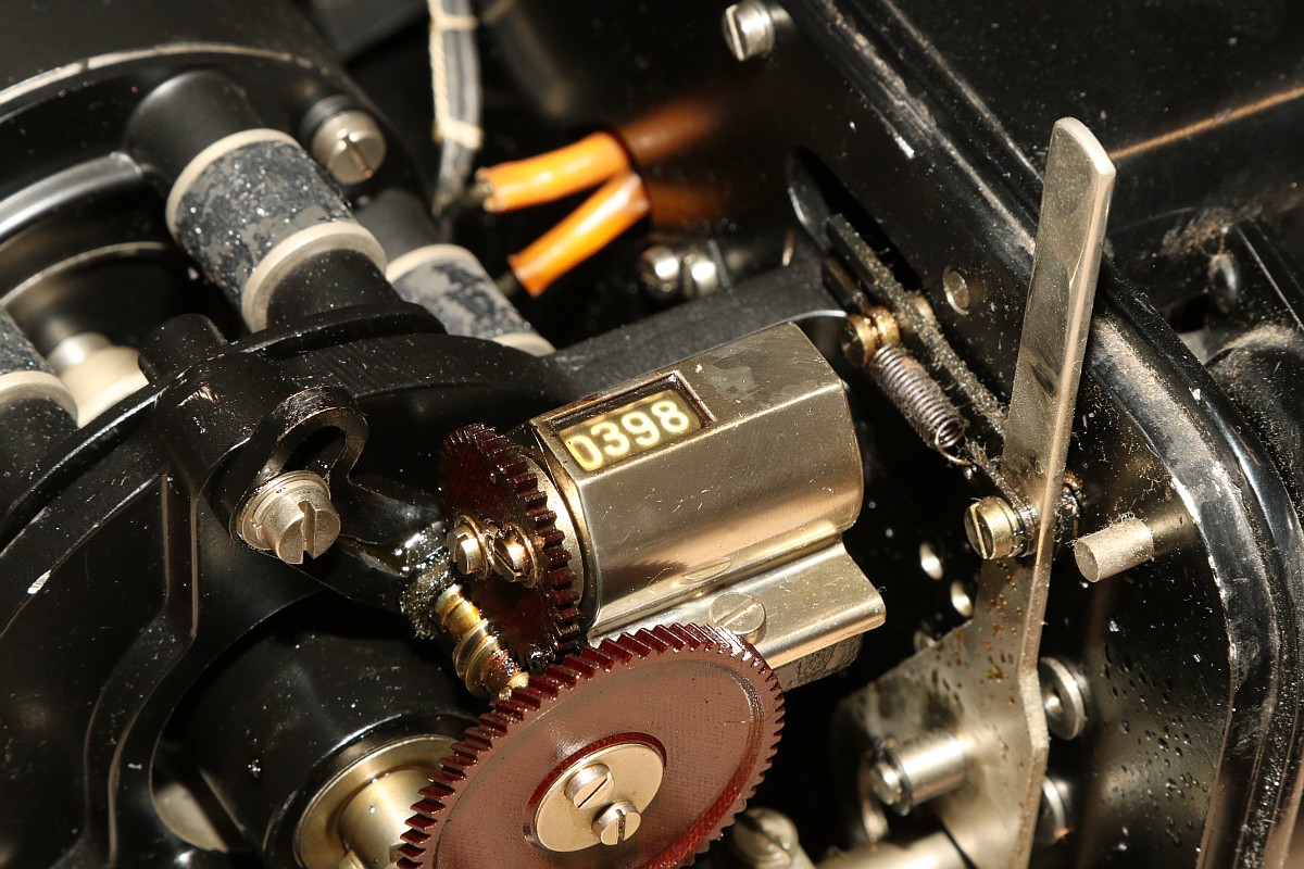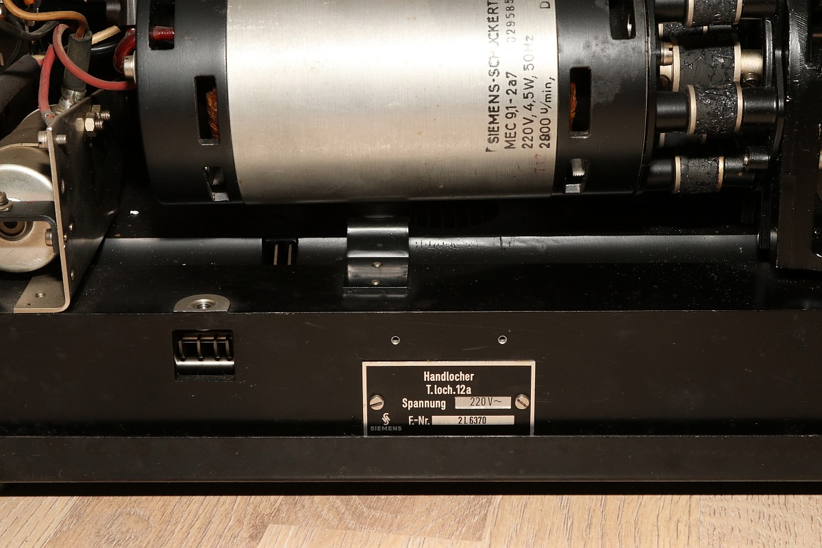 Der Konfettiauspuff hat etwas Futuristisches... Leider fehlt der durchsichtige Auffangbehälter, bei dem Zustand des Gerätes allerdings Jammern auf ganz hohem Niveau! Das Typenschild verrät auch das Herstelldatum: 1955... Das Magazin ist gut gefüllt - es kann gelocht werden. Der Locher ist auch für die Ewigkeit gebaut... Ein Schmankerl: der Zeichenzähler. Nach 60 Anschlägen geht die Glimmlampe an. Dann weiß mann: es ist Zeit für einen Wagenrücklauf!!! Klaviatur und Locher ohne Abdeckung: Die Rückenabdeckung wird praktischer Weise nur von einer Schraube gehalten. Sehr service- und dokumentationsfreundlich! Innen ist immer interessanter als Außen! Die elektrischen Kenndaten: Asynchronmotor mit Anlaufkondensator - Letzterer wird über den Zweifach-Netzschalter kurzzeitig zugeschaltet. Die Antriebsmechanik: 398 Betriebsstunden in 65 Jahren - nicht gerade viel! Aber das Gerät sieht ja auch noch aus wie Neu! Links die Zahnräder für die Mitnehmerwelle - rechts das Stanzwerk mit Ölfilz (unten), Codeschienen (mitte) und Lochstreifen (oben). Die beiden Schrauben auf der Mitnehmerwelle in der Mitte führten zum Ergebnis im letzten Bild. Die Schönheit in nackt: Ich hätte es wissen sollen... ein kleiner Schubs und die Mitnahmewelle drehte sich wieder. Der Finger im Laufweg wurde schlichtweg ignoriert. Ich nenne das Gerät jetzt nur noch A.loch.12a. |