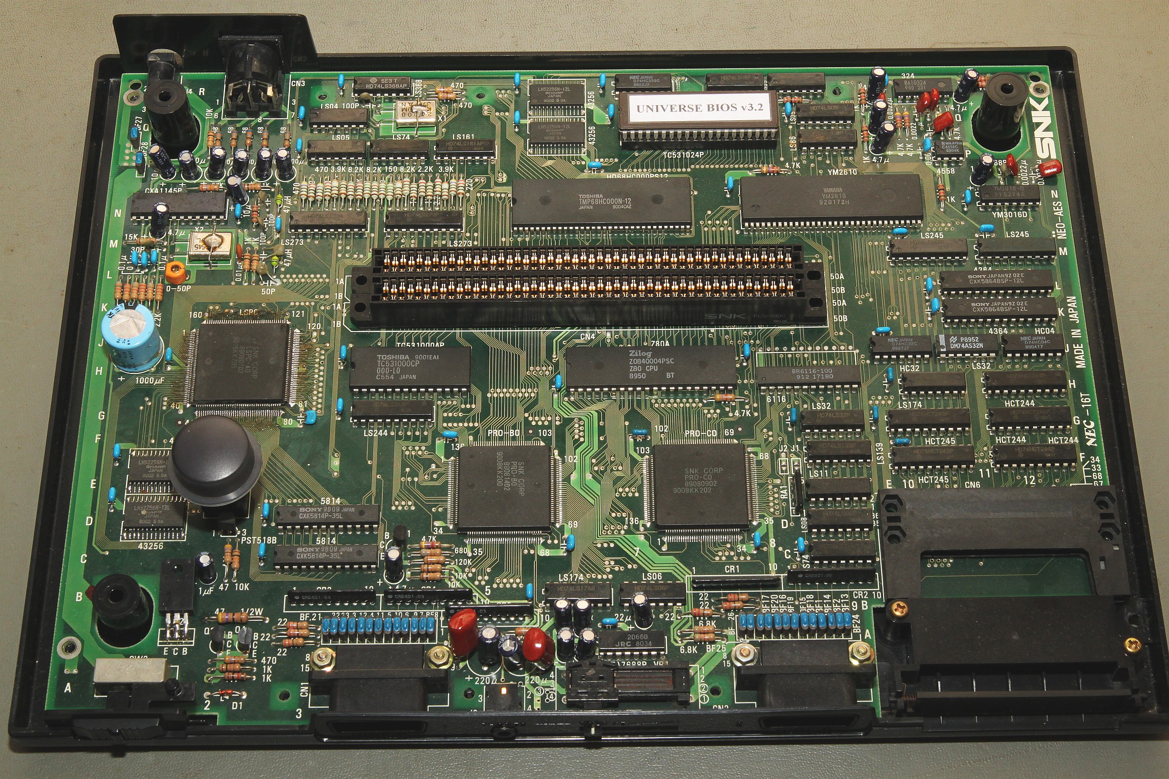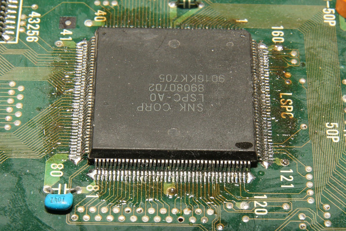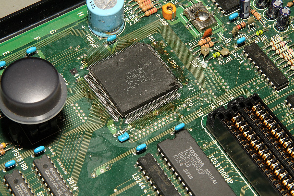 {NeoGeo AES Grafikfehler} Hübsche "Konsole" - mir leider viel zu teuer... Das Board - wie MVS, nur viel diskreter aufgebaut... Außerdem braucht es nur 5V. Vorsicht! Der Plusanschluss ist außen am Stecker auf Verpolschutz und irgendwelche Sicherheiten gegenüber Überspannungen hat man auf den ersten Blick offensichtlich vollständig verzichtet...! Hier hat schon wer rumgelötet... ...und die Beinchen krumm gemacht: atsächlich: Grafikfehler - mal mehr, mal weniger - alles ist ein wenig Berührungsempfindlich... Ich reinige die Kontakte - bringt nix. Auch ein erneutes Nachlöten des Custom bringt nichts,- die Signale sehen gut aus, nur die Spannungspegel sind recht niedrig... Ich messe mal nach: das Netzteil liefert 5,0V, davon kommen am IC gerade noch 4,6V an... Ein Nachregeln der Eingangsspannung auf 5,2V beseitigt sofort alle Grafikfehler! Offensichtlich benötigt die AES - wie manch andere Arcade-PCB eine ordentliche Portion Versorgungsspannung, um richtig zu funktionieren. Ich vermute, dass die Grafik-ROMs auf der Cartridge langsam schlapp werden, bei MVS hatte ich schon Cartridges mit defekten Grafik-ROMs... Aber egal, wenn es mit der richtigen Versorgung geht, dann gut. Hier noch mal die AES PCB in ihrer vollen Schönheit: |