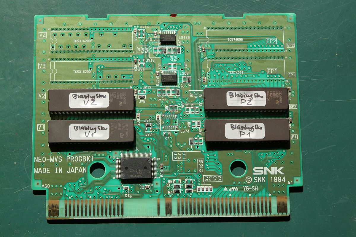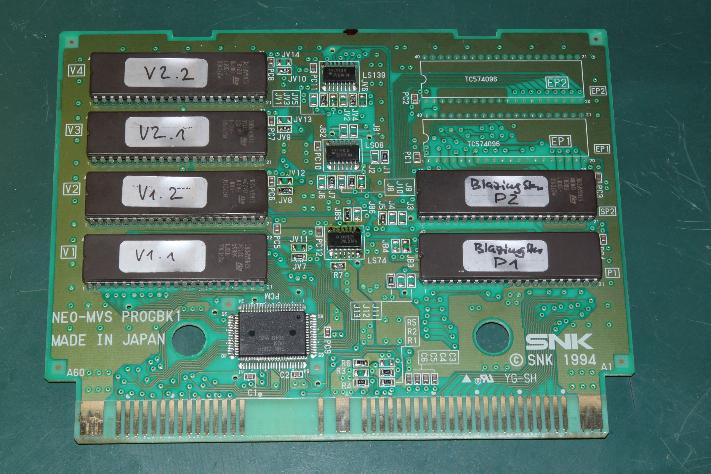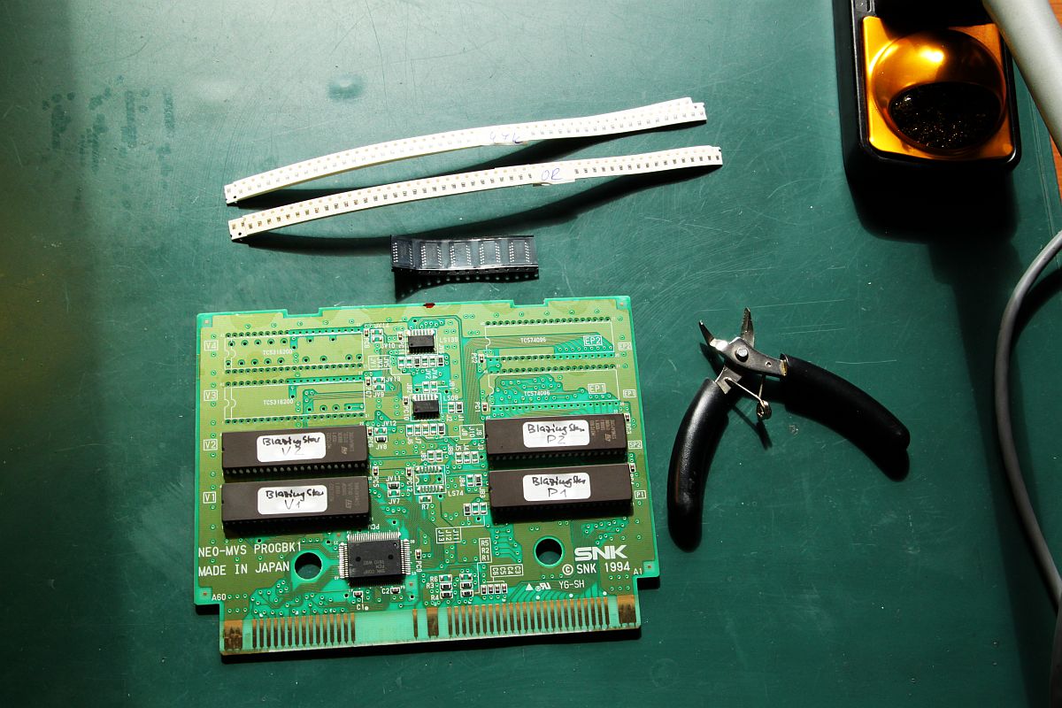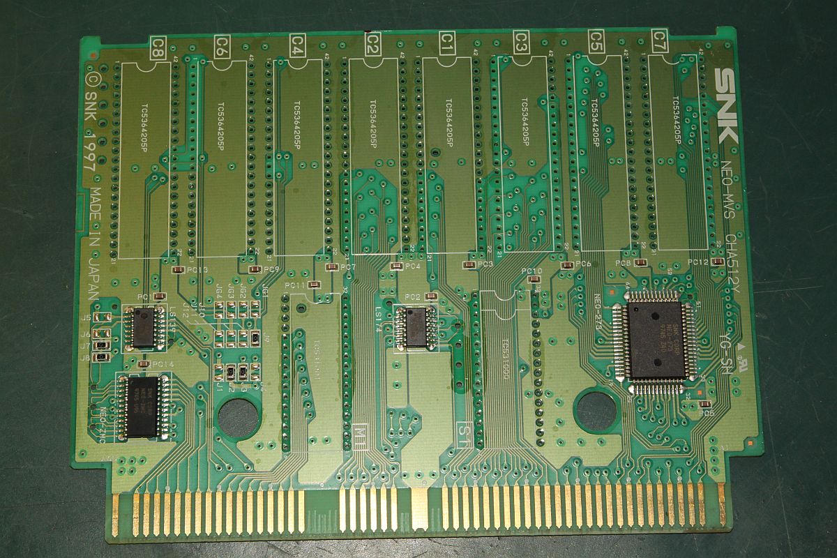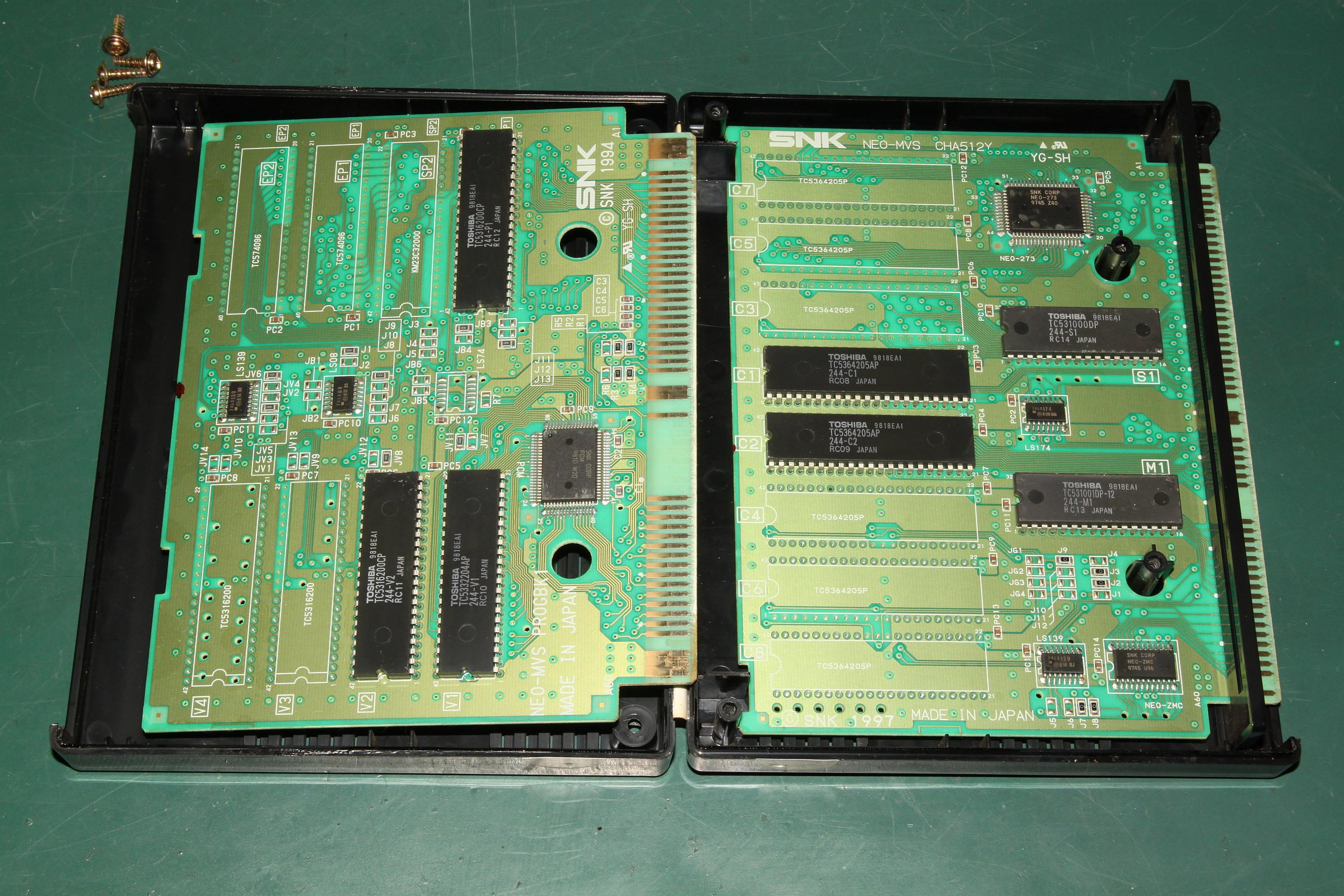 {NeoGeo Conversion Bericht} Schon lange wollte ich einige gute NeoGeo MVS Cartridges zum Spielen besitzen. Wer nicht Originale sammelt, der kann auch mit guten Conversions leben, dachte ich mir. Eine Conversion ist eine Original-Cartridge eines "Billigspiels", bei der die ROMs gegen die eines "guten" Spieles ausgetauscht wurden. NeoGeo-Cartridges bestehen aus zwei Platinen, eine PROG-PCB und eine CHAR-PCB. Von beiden Sorten gibt es mehrere Derivate, die unterschiedliche Speichergrößen, Memory-Banking-Mechanismen und sonstige Features aufweisen. Wenn man eine Cartridge konvertieren will, so muss man darauf achten, einen Spender mit den passenden Derivaten zu verwenden! (Hinweis: alle Bilder werden auf Klick hochauflösend!) {Links zum Thema NeoGeo Cartridges:} Die folgenden Links enthalten Inhalte, für die ich nicht verantwortlich bin, die aber gut zum Thema passen.