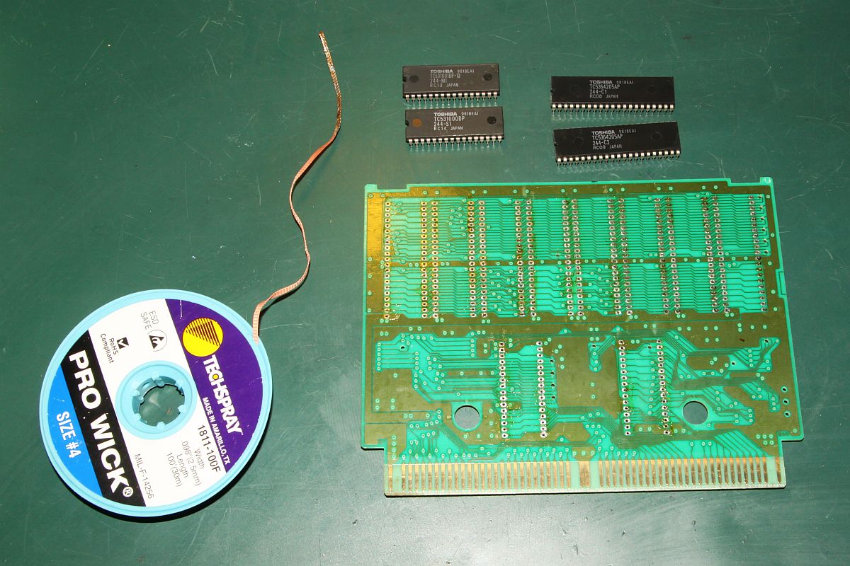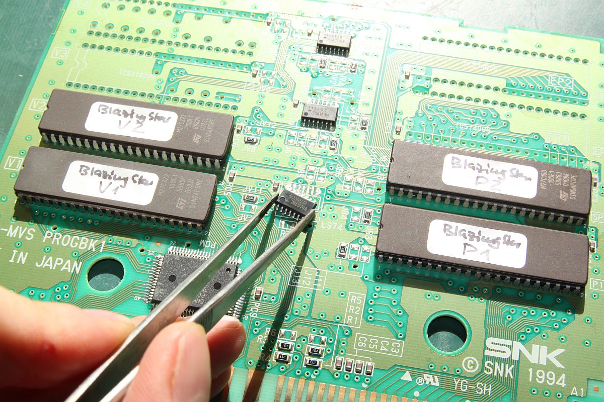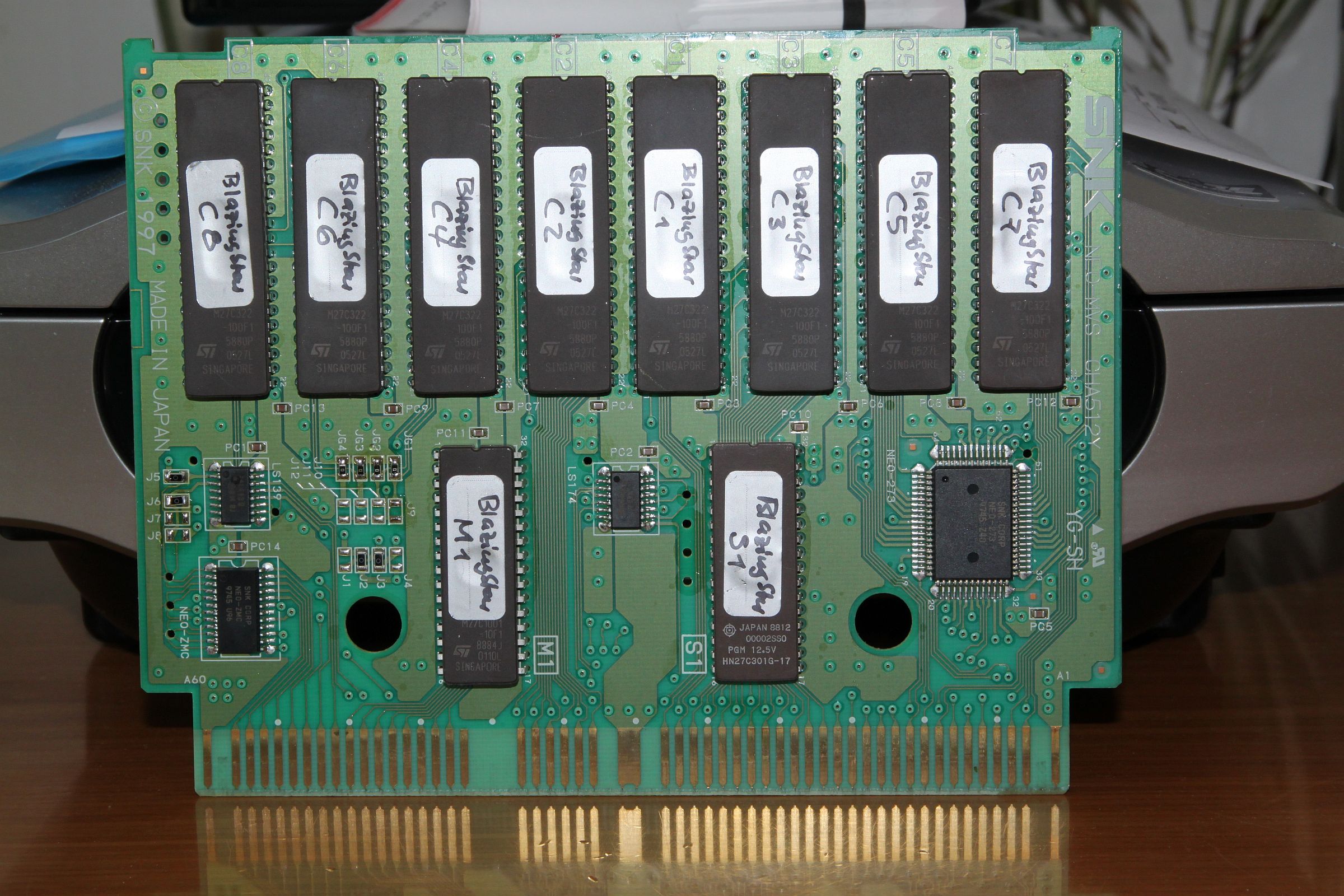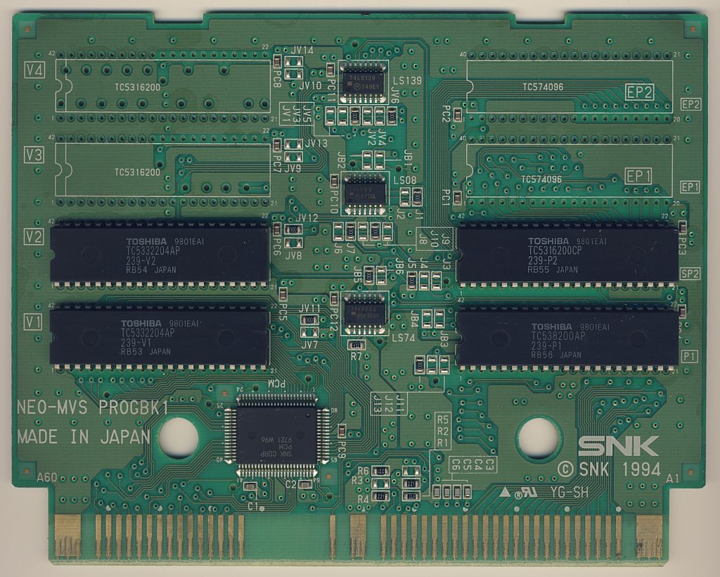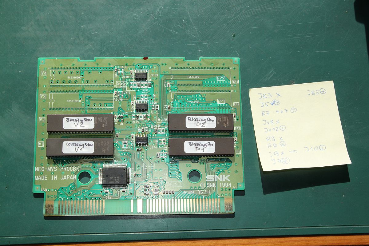 {NeoGeo Conversion Bericht} Schon lange wollte ich einige gute NeoGeo MVS Cartridges zum Spielen besitzen. Wer nicht Originale sammelt, der kann auch mit guten Conversions leben, dachte ich mir. Eine Conversion ist eine Original-Cartridge eines "Billigspiels", bei der die ROMs gegen die eines "guten" Spieles ausgetauscht wurden. NeoGeo-Cartridges bestehen aus zwei Platinen, eine PROG-PCB und eine CHAR-PCB. Von beiden Sorten gibt es mehrere Derivate, die unterschiedliche Speichergrößen, Memory-Banking-Mechanismen und sonstige Features aufweisen. Wenn man eine Cartridge konvertieren will, so muss man darauf achten, einen Spender mit den passenden Derivaten zu verwenden! (Hinweis: alle Bilder werden auf Klick hochauflösend!) {Links zum Thema NeoGeo Cartridges:} Die folgenden Links enthalten Inhalte, für die ich nicht verantwortlich bin, die aber gut zum Thema passen.