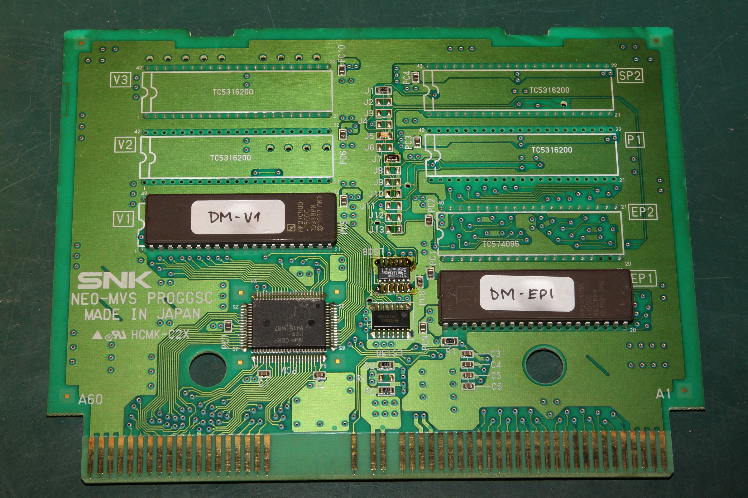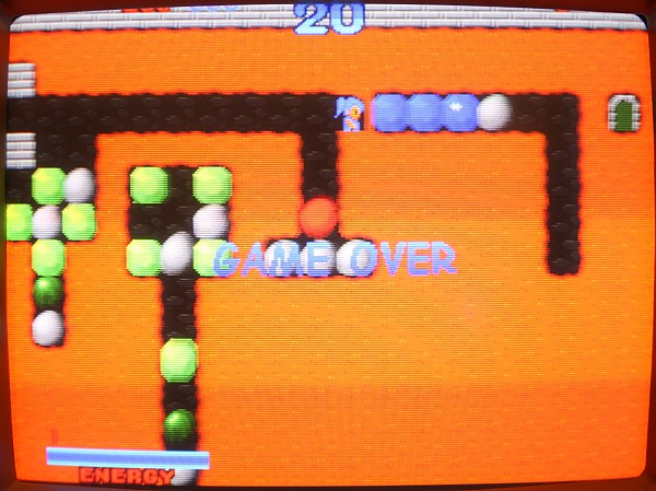 {Digger Man Conversion} Es gibt einige Games auf Neo Geo MVS, die sind hausgemacht, selten und sogar ganz witzig. Ich hab jetzt mal eines in Hardware gepresst: eine Kundenanfrage hat mich auf den Trichter gebracht. Im Netz ist nicht viel zu finden, nur ein Platinenfoto mit schwarz abgeklebten Chips, aber das ist ja schon mal hilfreich. Da die ROMs sehr klein sind, habe ich mich für CHA42G2 entschieden, bei 27C400 fällt eh jedes ROM-Swapping flach... (512kB) Das Spiel startet völlig ohne jedes Neo Geo-Logo, es ist bunt, nett gemacht, hat sogar Ton und spielt sich ganz passabel. Wer Boulder Dash oder Emerald Mine kennt, kennt auch Digger Man. Ich habe den Verdacht, dass sogar einige Gfx-Tiles aus Emerald Mine geklaut wurden... Ach ja, Digger MAN... Ja, nee, is' klar... Heutzutage erkennt man ja Männer weder an ihrer Frisur, noch an ihren Klamotten... |
