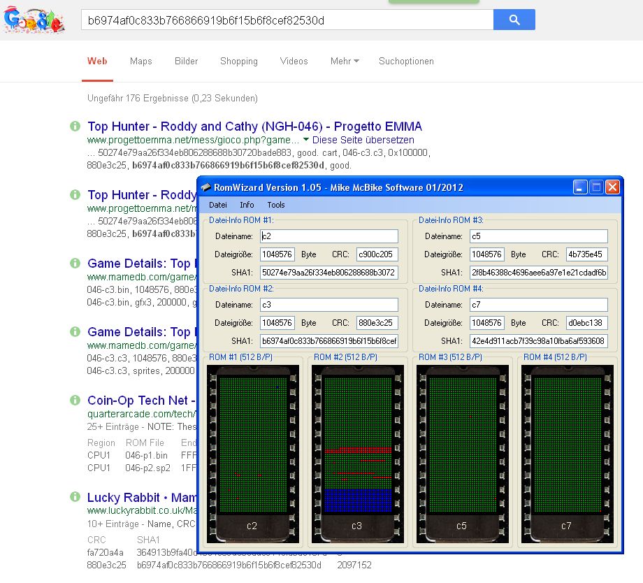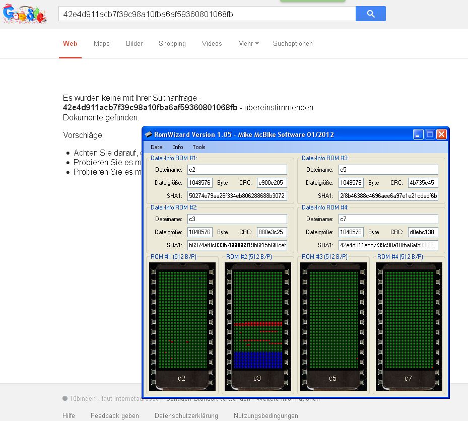 {Top Hunter Cartridge Diagnose} umfangreiche Grafikfehler, Streifen, fehlerhafte Segmente, auch schon im Neo Geo Logo... Da sollte man sich die C-ROMs näher ansehen, leider sind es 8 Stück. Also alle einzeln auslöten, auslesen und mit dem ROM-Wizard prüfen lassen. So sieht Google aus, wenn das ROM fehlerhaft ist, wenn also die Prüfsumme im Netz nicht gefunden wird: