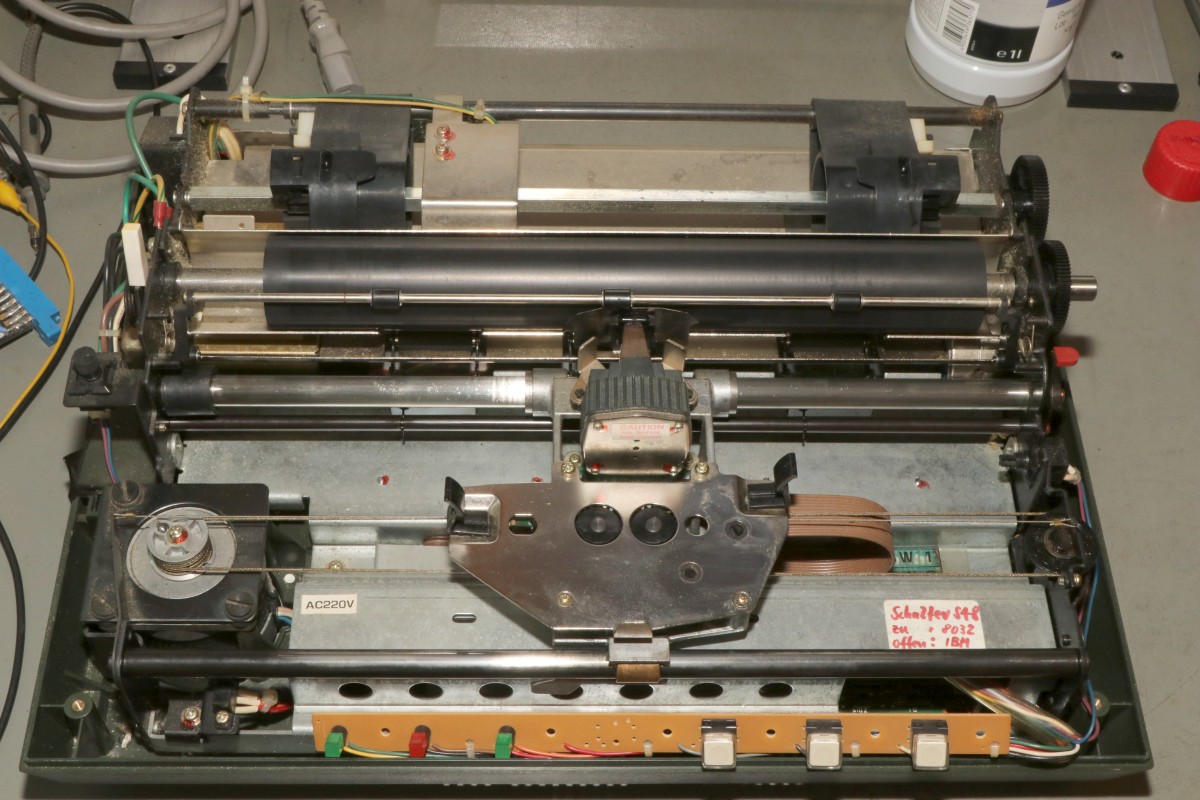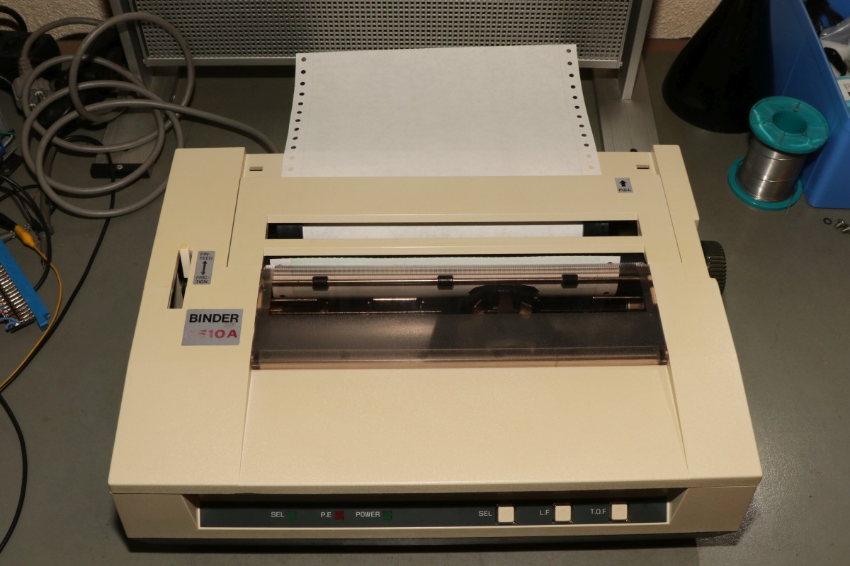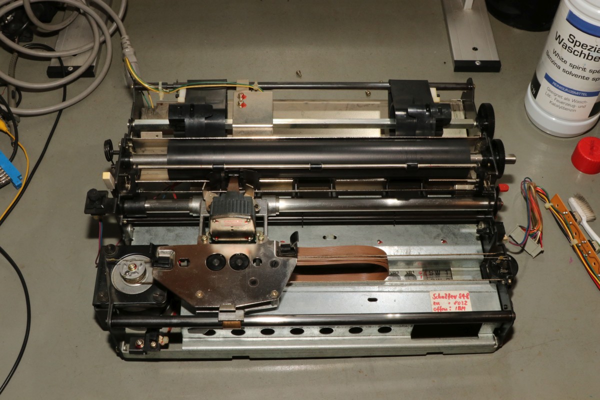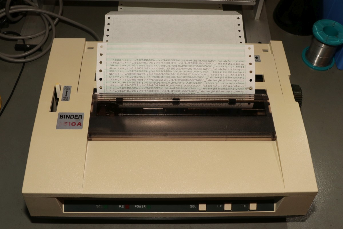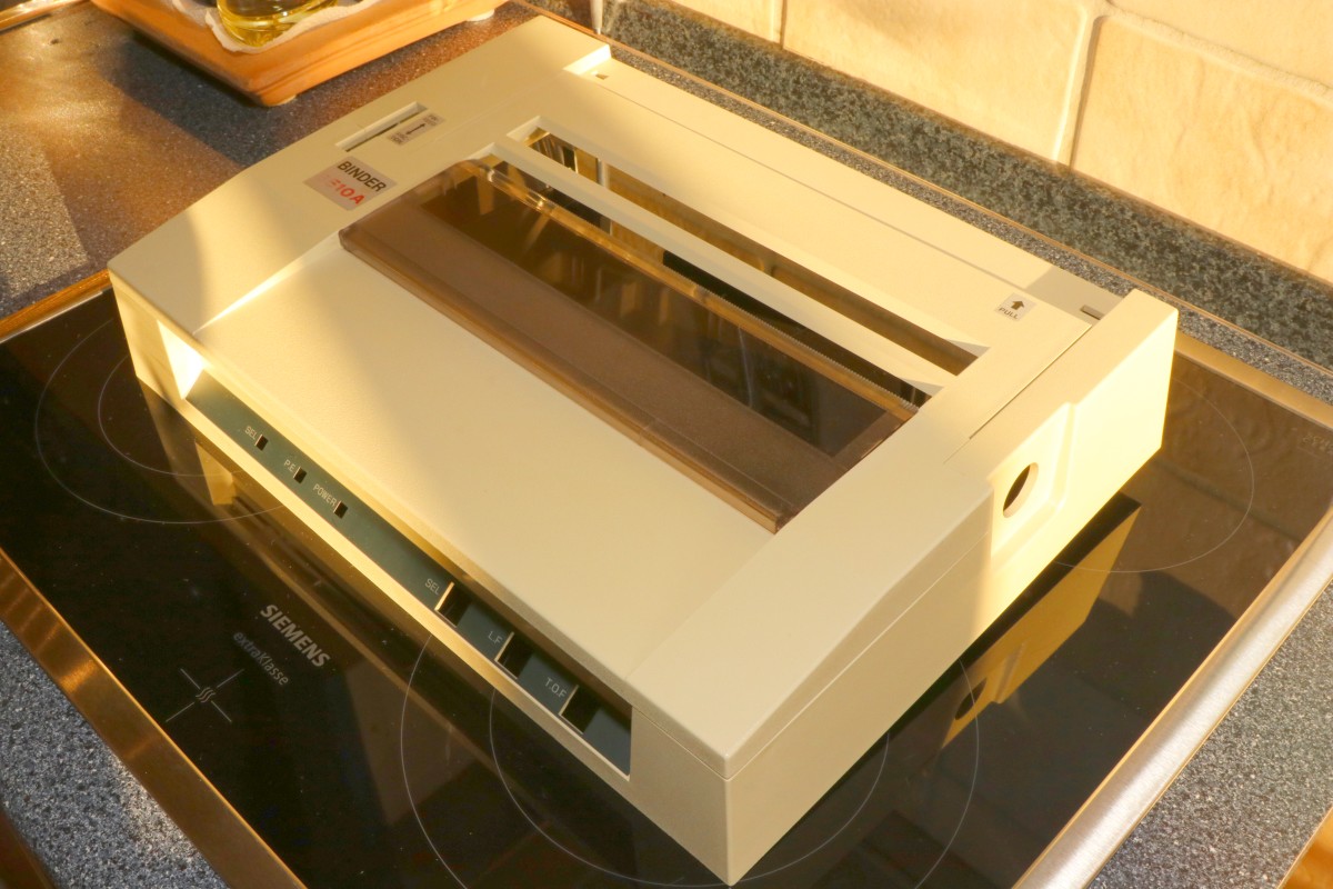 {Binder 8510A} ein bidirektional druckender Neunnadler - ebenfalls aus meinem CBM-Konvolut: ein solider, handlicher 9-Nadel-Drucker aus den 80ern. Man merkt diesem Drucker noch deutlich an, dass er einer der ersten Nadeldrucker seiner Generation war: stabiles Gehäuse, kein Schnickschnack, Chassis vollständig aus Metall... Das Gerät wirkt im Vergleich zu heutiger IT-Consumer-Ware geradezu unglaublich wertig. Die Gehäuseoberschale lässt sich mit vier Schrauben sehr einfach lösen. Im Inneren erwartet uns hochwertige Mechanik. Wer noch die mechanischen Rechenmaschinen aus den 60ern kennt, der entdeckt hier noch sehr ähnliche Konstruktionen... Das Netzfilter hält hoffentlich länger als die bekannten Knallbonbons in den CBMs. Man muss es abschrauben, um an die vierte Befestigungsschraube des Chassis zu gelangen! Der sternförmige Schutzerdepunkt... hübsch! Und nach vorsichtigem Lösen diverser Steckverbinder (die sind echt kurz verkabelt!) hält man die Platine in der Hand: Wow... die volle Rechenpower eines 8085... da steckt im Drucker schon so viel Rechenleistung, wie im Computer selber. Hier mal sehr hoch auflösend: Technisch läuft das Exemplar wunderbar, aber ich hasse verdreckte Exponate... Daher sind mal wieder diverse Reiniger, Schwämme und andere Küchenutensilien gefragt. Protip: abwarten, bis das Innenministerium das Haus verlassen hat! Das Gehäuse war einfach - die Mechanik ist schon kniffliger... Aber mit Spiritus, Stofftüchern und einem kleinen Kännchen Öl bewaffnet, wird das richtig schön sauber. Der Zusammenbau geht in umgekehrter Reihenfolge! Der einzige Steckverbinder, den man nicht direkt auf die Platine stecken kann, ist das Flachbandkabel zum Druckkopf! Dafür kann man das Niederhalteblech demontieren und den Stecker dann von oben in die Stiftwanne reindrücken! Jetzt noch das neue Farbband einlegen (ja, die gibt es immer noch käuflich zu erwerben!)... Das Bedienfeld wird wieder in das Gehäuseoberteil geschraubt und dann das Oberteil auf den Drucker aufgesetzt. Das Handrad nicht vergessen, das hat man bei der Demontage abziehen müssen! Traktorpapier einlegen, ausrichten... Und bei gedrücktem LineFeed einschalten. Der Selbsttest sollte jetzt starten... Ich bin begeistert. Und ja, der Binder ist ein umgelabelter C.Itoh 8510... |