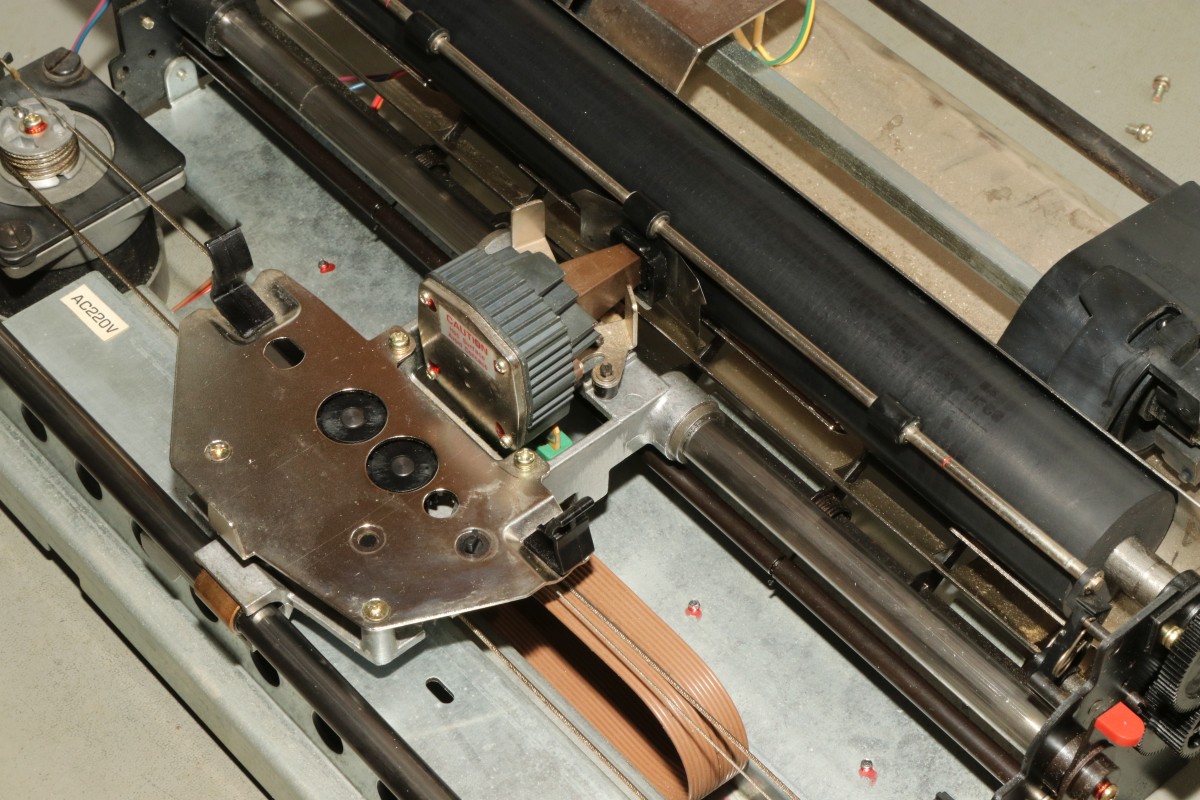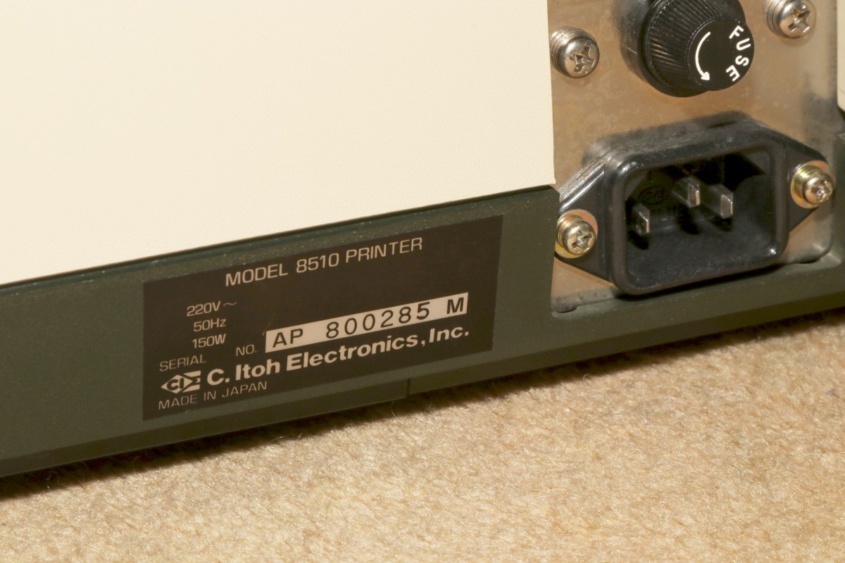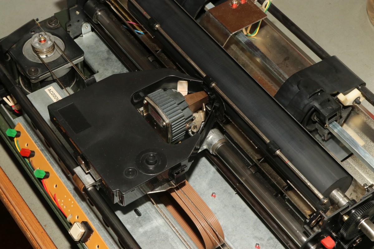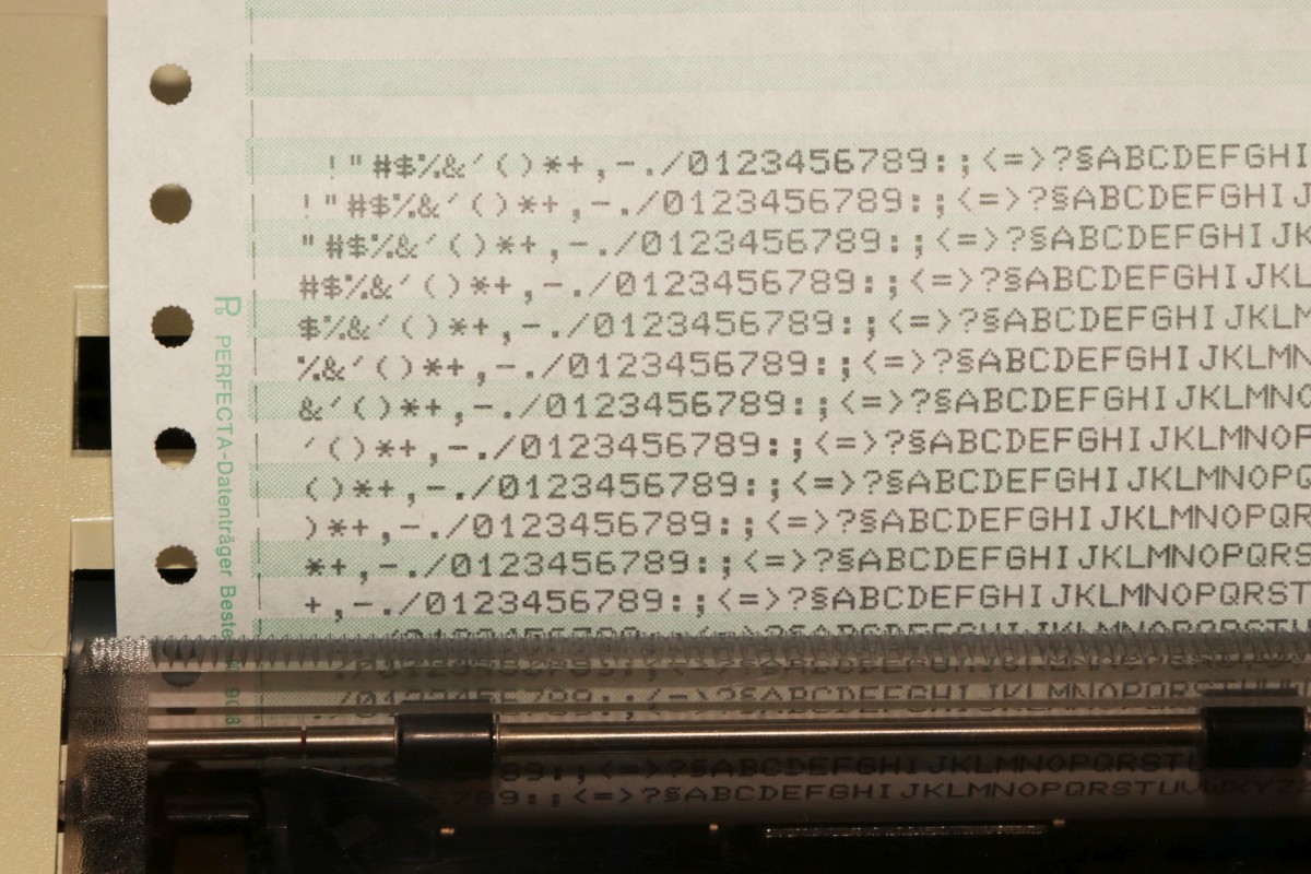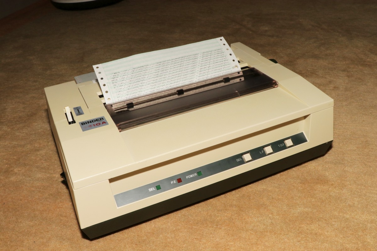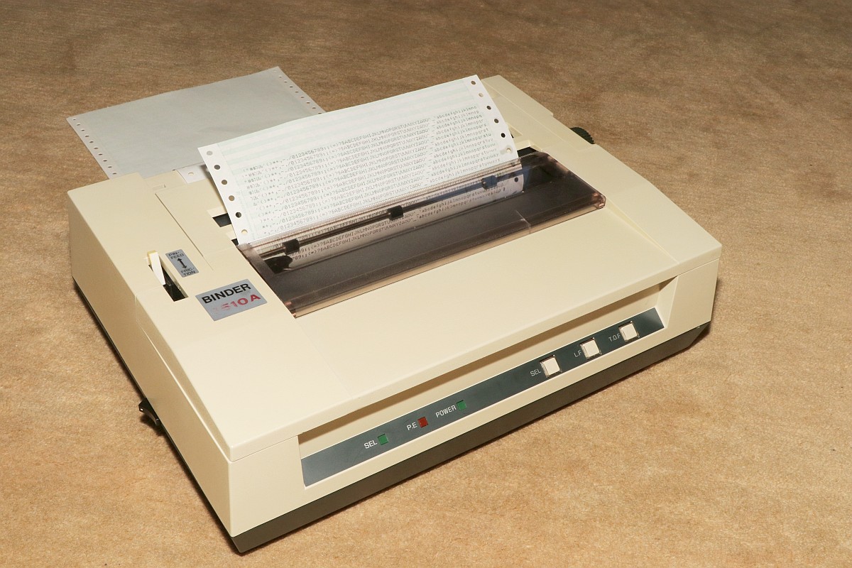 {Binder 8510A} ein bidirektional druckender Neunnadler - ebenfalls aus meinem CBM-Konvolut: ein solider, handlicher 9-Nadel-Drucker aus den 80ern. Man merkt diesem Drucker noch deutlich an, dass er einer der ersten Nadeldrucker seiner Generation war: stabiles Gehäuse, kein Schnickschnack, Chassis vollständig aus Metall... Das Gerät wirkt im Vergleich zu heutiger IT-Consumer-Ware geradezu unglaublich wertig. Die Gehäuseoberschale lässt sich mit vier Schrauben sehr einfach lösen. Im Inneren erwartet uns hochwertige Mechanik. Wer noch die mechanischen Rechenmaschinen aus den 60ern kennt, der entdeckt hier noch sehr ähnliche Konstruktionen... Das Netzfilter hält hoffentlich länger als die bekannten Knallbonbons in den CBMs. Man muss es abschrauben, um an die vierte Befestigungsschraube des Chassis zu gelangen! Der sternförmige Schutzerdepunkt... hübsch! Und nach vorsichtigem Lösen diverser Steckverbinder (die sind echt kurz verkabelt!) hält man die Platine in der Hand: Wow... die volle Rechenpower eines 8085... da steckt im Drucker schon so viel Rechenleistung, wie im Computer selber. Hier mal sehr hoch auflösend: Technisch läuft das Exemplar wunderbar, aber ich hasse verdreckte Exponate... Daher sind mal wieder diverse Reiniger, Schwämme und andere Küchenutensilien gefragt. Protip: abwarten, bis das Innenministerium das Haus verlassen hat! Das Gehäuse war einfach - die Mechanik ist schon kniffliger... Aber mit Spiritus, Stofftüchern und einem kleinen Kännchen Öl bewaffnet, wird das richtig schön sauber. Der Zusammenbau geht in umgekehrter Reihenfolge! Der einzige Steckverbinder, den man nicht direkt auf die Platine stecken kann, ist das Flachbandkabel zum Druckkopf! Dafür kann man das Niederhalteblech demontieren und den Stecker dann von oben in die Stiftwanne reindrücken! Jetzt noch das neue Farbband einlegen (ja, die gibt es immer noch käuflich zu erwerben!)... Das Bedienfeld wird wieder in das Gehäuseoberteil geschraubt und dann das Oberteil auf den Drucker aufgesetzt. Das Handrad nicht vergessen, das hat man bei der Demontage abziehen müssen! Traktorpapier einlegen, ausrichten... Und bei gedrücktem LineFeed einschalten. Der Selbsttest sollte jetzt starten... Ich bin begeistert. Und ja, der Binder ist ein umgelabelter C.Itoh 8510... |