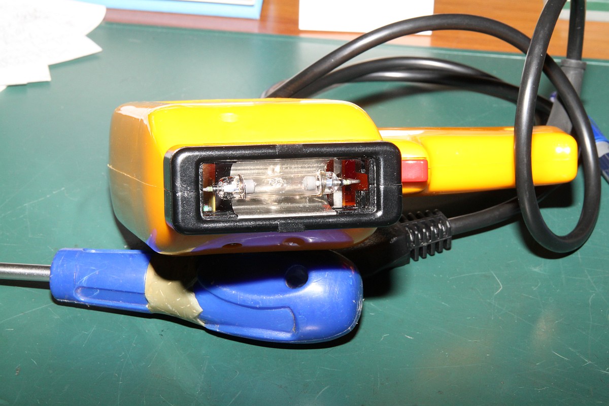 {BRON Flash Eraser II} Ein neues interessantes Teil, welches mir "zugelaufen" ist: eine EPROM-Löschpistole mit Blitzlampe, damit kann man EPROMs blitzdingsen. Hab ich noch nie gesehen, bin gespannt, wie schnell sowas ein EPROM löscht... Die Blitzlampe - Vorsicht, das ist kein Disco-Stroboskop, das Teil haut richtig heftig UV raus!!! Wenig drin, aber es reicht. {Ergebnis:} Ausprobiert an einem EPROM ST M27C256 - alle Zellen auf 0x00 programmiert (Rot) --> >0x00&<0xFF (Grün) --> 0xFF (blau); Testreihe nach 5, 10, 15 und 20 Sekunden... ja, Sekunden! Das Teil blitzdingst echt... und es stinkt nach Ozon. Diese Pistole löscht 60 mal schneller, als mein Profi-Lampenlöscher!!! |