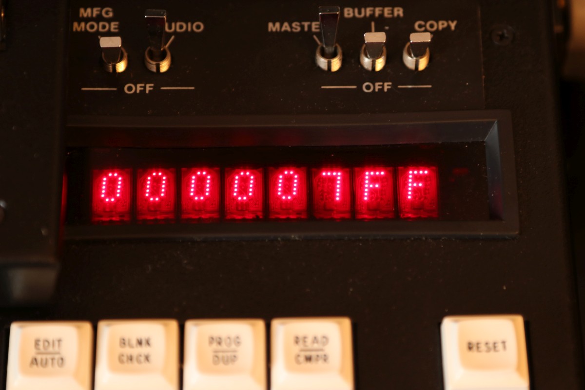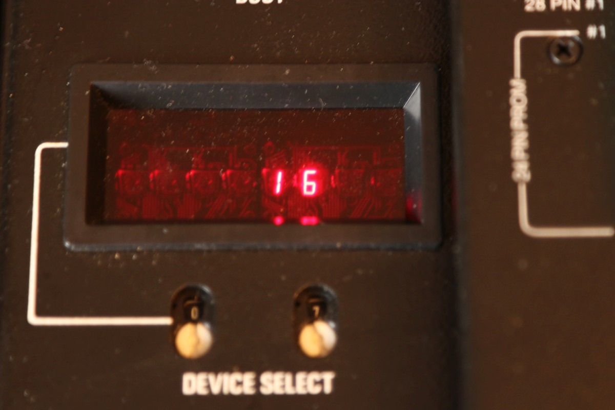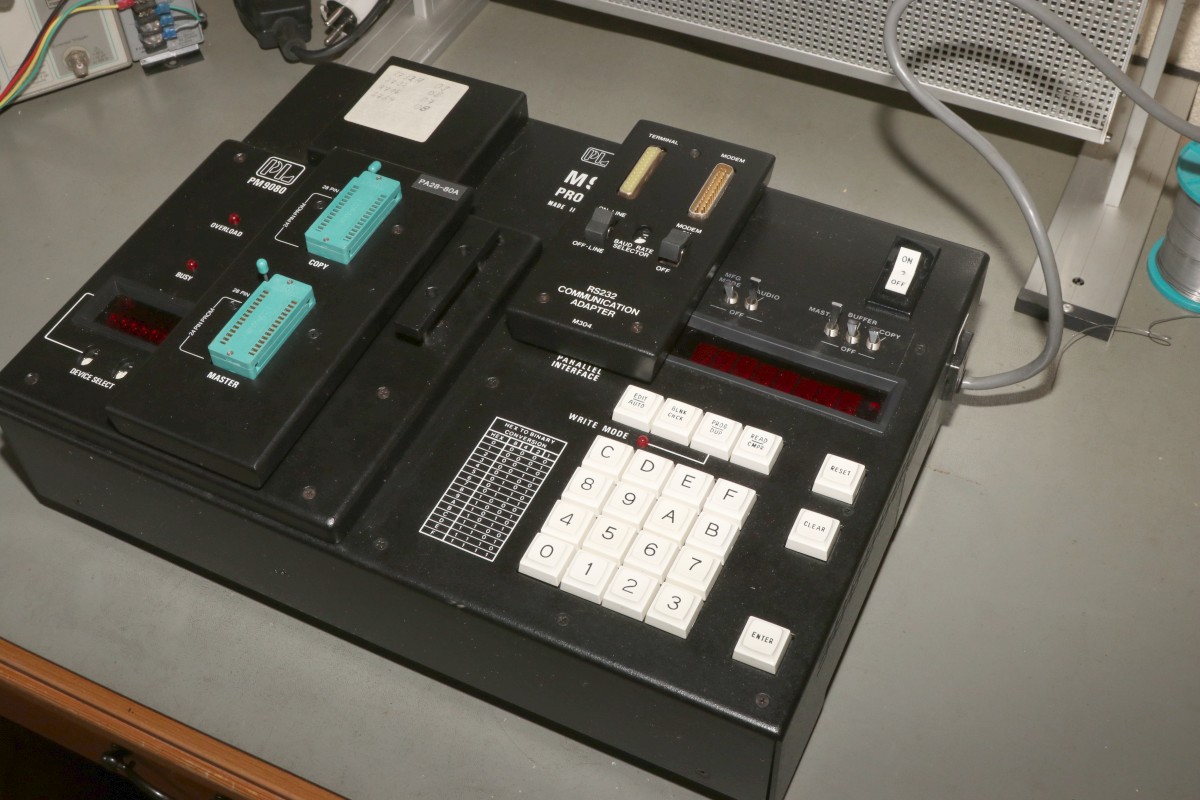 {ProLog M980 Programmer} War der M900 noch mit einem schnuckeligen 4004 Prozessor ausgestattet, so punktet der M980 mit dem deulich leistungsstärkeren (hüstel) 4040 Prozessor. Eigentlich nur aus diesem Grund finde ich die ProLog-Programmiergeräte so interessant! Uralte und ursprüngliche Prozessortechnologie! Und hübsche LED-Displays. Die Auswahl der programmierbaren Bausteine (2716, 32, 64) ist hier hingegen eher langweilig. Dafür kommt das Teil wieder mal in einem praktischen Koffer daher: Ein klein wenig verstaubt: Sehen wir doch mal gemeinsam rein: Personality- und Schnittstellenmodule: Das Grundgerät mit Programmiereinsatz: Die Ausrede "EPROM-Löscher vergessen" zählt hier nicht... alles ist mit dabei! Maximale Adresse... ist die Anzeige nicht schön? Device Seleckt hat 2716 selektiert... die verfügbaren Speicherbereiche werden dann automatisch eingestellt. Wie am Kaminfeuer... Das Programmiermodul ist auch mit Logik und EPROMs vollgepackt, da spart man sich beim Typwechsel das Laden neuer Software, es ist nämlich schon alles mit drin! So sieht der Prommer komplett aus: Das Innenleben sieht interessant aus! Für jede Sonderfunktion gibt es ein spezielles EPROM! Das Memory-Board ist Batterie-gepuffert... also, das war's mal... igitt. Irgendwie lecker. Nickel-Cadmium - einen Ersatz wird es da wohl nicht mehr geben... Gottseidank war nichts kaputt! Das Memory-Board in sehr hoher Auflösung --> Klick! Die Speicher sind 2114-Kompatible, 1kx4 RAM Das Memory-Board - Unterseite (auch sehr groß!) Mein Schatz: der Intel 4040. So viele Firmware-Varianten... das ist bis heute nicht besser geworden... Das Baseboard von Unten - hoch aufgelöst: Und weil's so schön ist: das Base-Board von Oben - in sehr großer Auflösung --> Klick! Die Bedienplatine von Unten: Bedienelemente und Displays sind vom M800 übernommen: Die Displays sind einfach schön - viel besser, als schnöde 7-Segment-Anzeigen! Jetzt mal in Betrieb nehmen... Der Test mit 2716 ergibt leider: das Teil liest fehlerfrei aus - die Programmierung funktioniert aber nicht, vermutlich ist hier die Erzeugung der Programmierspannung platt, vielleicht ist es aber auch ganz was Anderes. Wenn ich mal ganz viel Zeit habe, werde ich mich diesem Problem widmen. Vielleicht. |