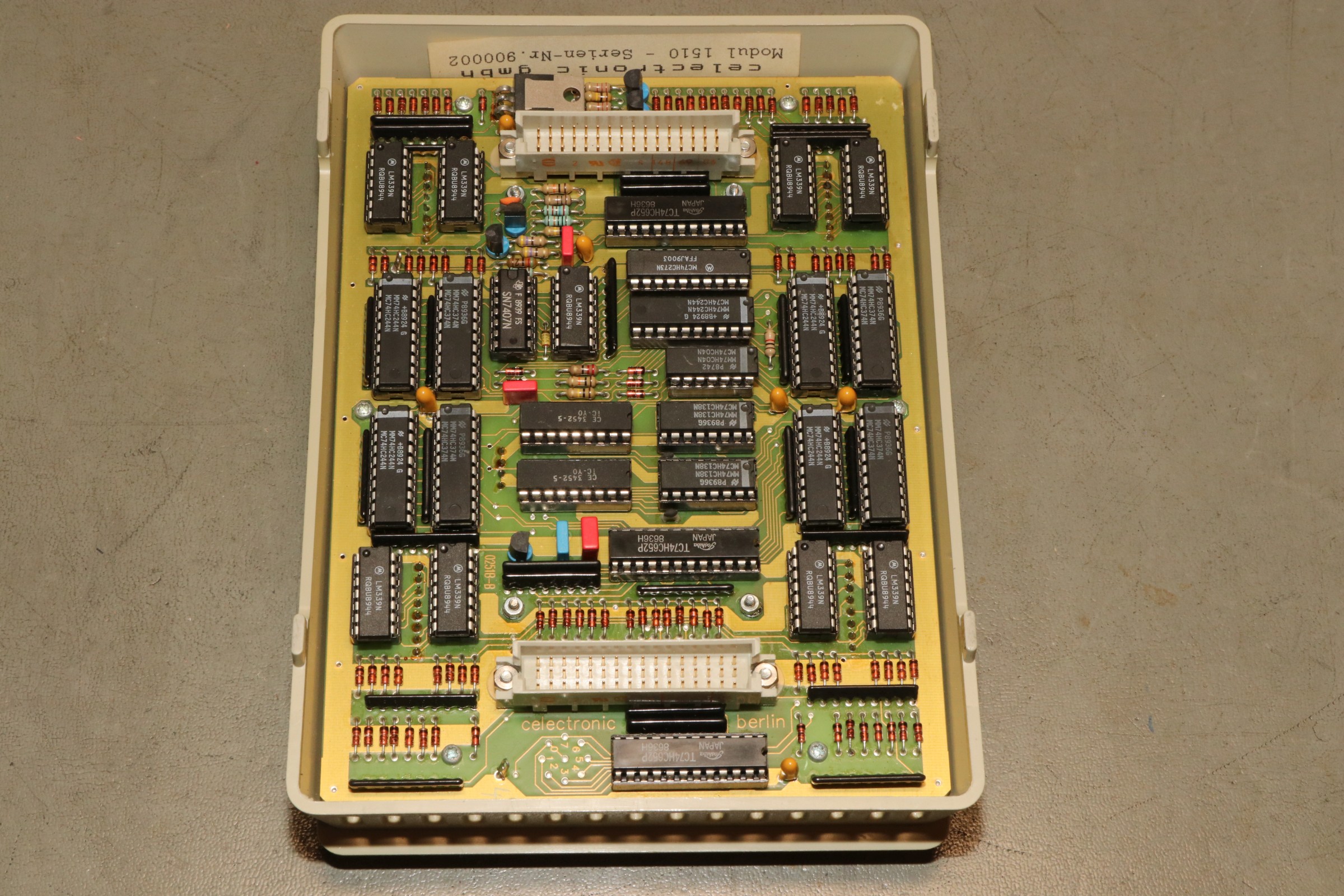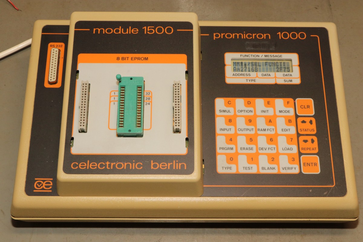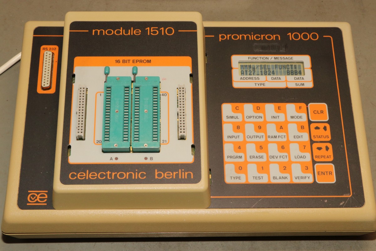 {Promicron 1000} Ein neuer Programmer ist bei mir eingetroffen: ein Celectronic Promicron 1000. Mit viel Zubehör und völlig ohne Doku. Klar, der Prommer erkennt die eingesteckten Module. Oder auch die nicht eingesteckten... Mit 8-Bit-EPROM Modul: Da ist ganz schön was an Technik mit drin. Die Komplexität erinnert schon sehr an Data I/O... Die Module lassen sich leicht stecken. Eine Fehlbedienung ist mechanisch ausgeschlossen. Das Modul wurde erkannt, der Selbsttest kann beginnen. War ja klar. Fehler 10. Ohne Doku schwierig... Und Fehler 34 und noch knapp 10 andere Fehlermeldungen... Immerhin kann man die alle wegdrücken und der Prommer ist im Grundzustand. Dabei sind auch PLCC-Adapter, die auf das EPROM-Modul aufgesteckt werden können. Die rudimentäre Logik dient nur der Modulerkennung: 74HC166 - ein 8-Bit-Schieberegister. Das kennen wir doch vom CBM-Dongle... Der Promicron 1000 erkennt auch den PLCC Adapter und liefert geringfügig andere Fehlermeldungen. Ein 16-Bit-EPROM-Modul ist auch dabei. Mit Logik vollgepackt... Auch dieses wird erkannt - die Auswahlliste ist dann entsprechend angepasst. Bei so vielen Fehlermeldungen habe ich die Spannungsversorgung im Verdacht - aber was will man ohne Fehlerbeschreibung und Schaltplan hier schon ausrichten? Das Netzteil ist eine Mischung aus Trafonetzteil und Schaltnetzteilen... Rechenknecht ist ein mächtiger 68000er und an RAM hat man hier nicht gespart. Das sieht nicht gut aus: die berüchtigte Varta-Tonne. Natürlich ausgelaufen, aber der Schaden ist sicher nicht schwerwiegend. Die Lithiumzelle ist auch platt. Mal sehen, welche Fehlermeldungen verschwinden, wenn die ersetzt wird... Ich habe hier wenig Hoffnung - aber vielleicht hat ja jemand Unterlagen, damit ich wenigstens die Fehlermeldungen verstehe.... |