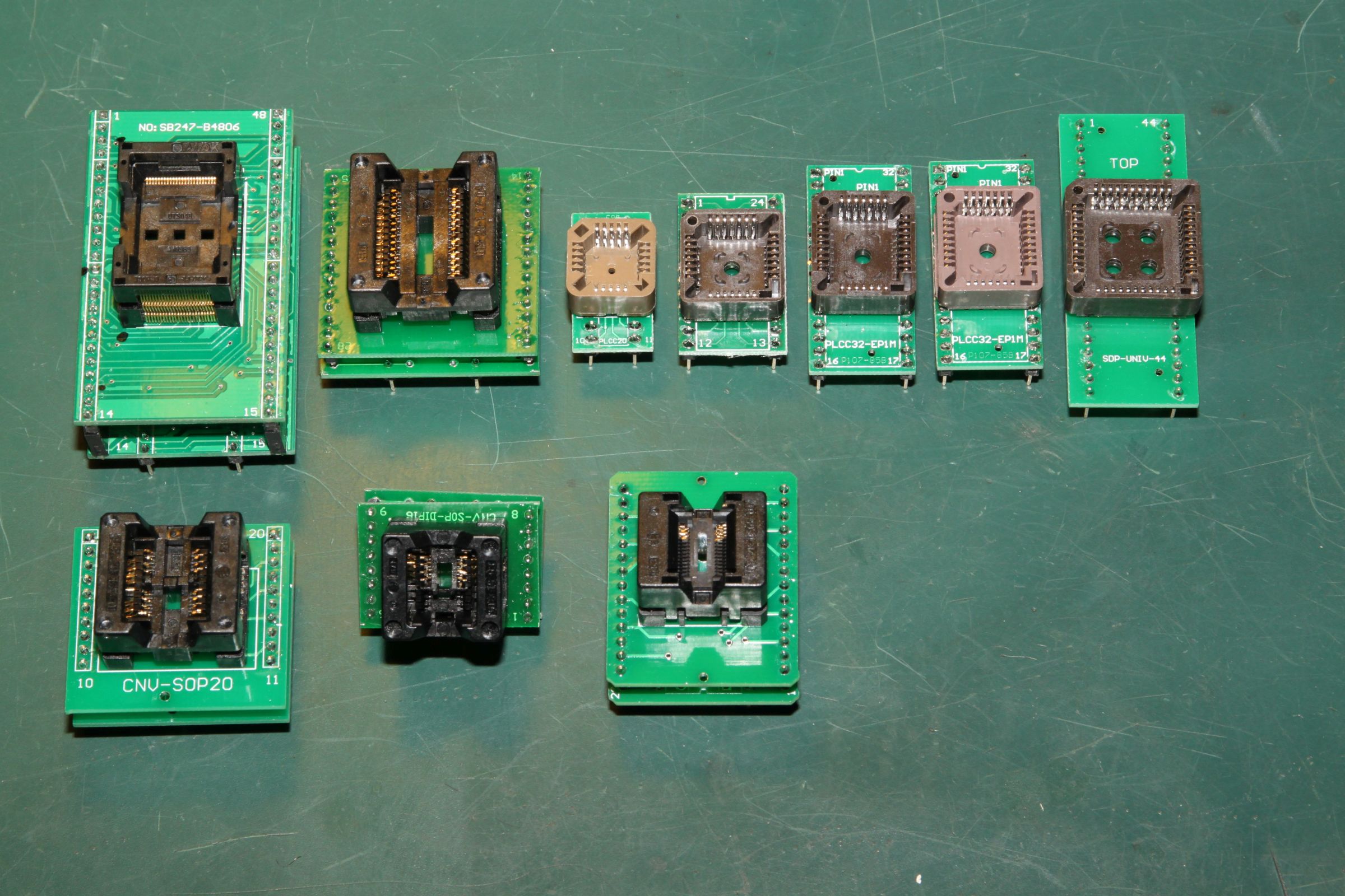 {Xeltek Superpro 610P} Xeltek Superpro 610P, klingt erst mal irgendwie nach USA, aber ist dann doch China. Aber auch die Chinesen machen ganz gute Elektronik... Zufällig in der Bucht gefunden, auf der Suche nach einem modernen Prommer (ja, sowas brauche ich auch ab und an mal...) mit USB Anschluss unter Windoof 7 und dann für volle 220 Euro ersteigert. Und das Teil hat 48 Pins, damit hat es ein echtes Alleinstellungsmerkmal! Die Gehäuseplastikspritzgussteile sind, äh, chinesisch... egal. Auf die inneren Werte kommt es an! Von oben (nein, das Teil ist nicht schief eingebaut, hier ist es schon demontiert... (Klick == Groß!) Ein Sack voll Adapter, die man vermutlich nie benötigt... Der gruselige Steckeradapter für das 12V-Netzteil...