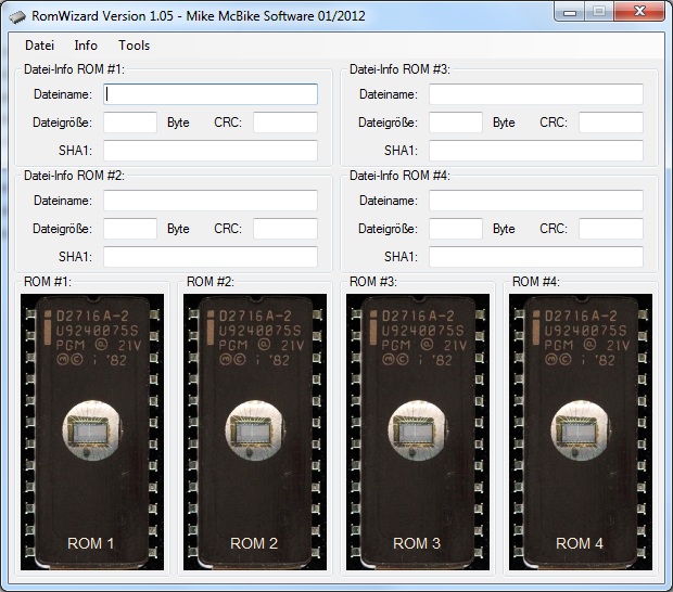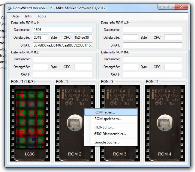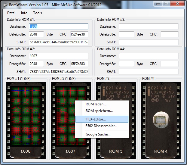Dafür habe ich den ROM-Wizard geschrieben. Man benötigt nur einen EPROM-Leser / EPROM-Programmiergerät und den ROM-Wizard zur Anzeige der Inhalte. One-Click-Google-Suche nach ROM-Prüfsummen inklusive!