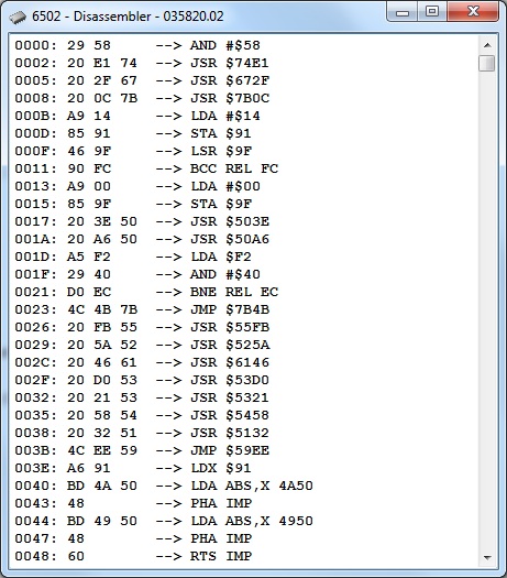 6502-Disassembler Auf dem gleichen Wege ist der komfortable eingebaute 6502/65C02-Disassembler zu erreichen. Er stellt binäre Programme lesbar als Assemblercode dar. Vorausgesetzt natürlich, es handelt sich hier tatsächlich um 6502-Code... Andere Datenbereiche werden aufgrund fehlerhafter Datensequenzen schnell durch häufige ???-Daten sichtbar. |