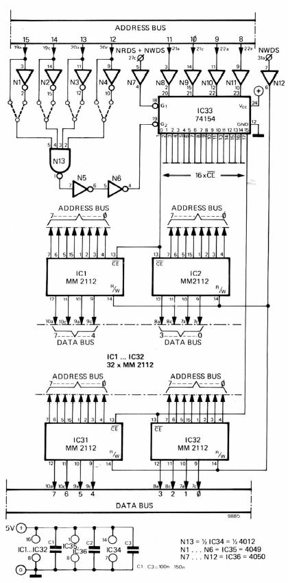 {Elektor 4k RAM Karte} Das SC/MP System benötigt Speicher satt, wenn man mal so richtig anfangen möchte zu programmieren. Aus diesem Grund hat die Zeitschrift Elektor in der Ausgabe 12/77 diese RAM Karte vorgestellt. 32 Stück statische RAMs vom Typ 2112 (256x4) liefern 4 Kilobyte Speicherplatz - wie man den wohl voll bekommen könnte?