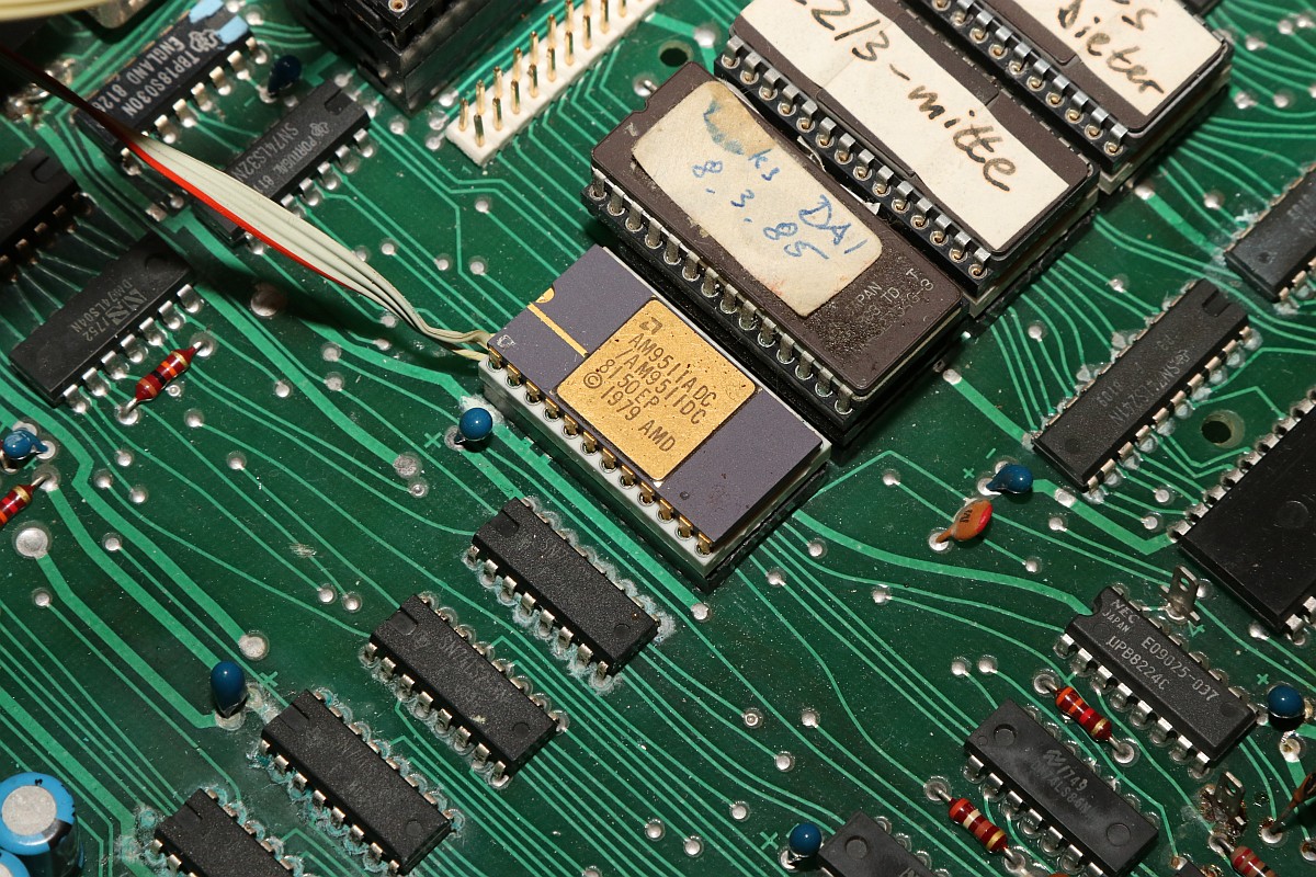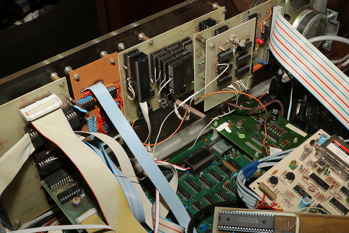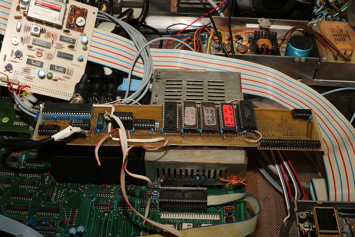 {DAI Computer - seiner Zeit voraus!} Vor Kurzem war mal im Altcomputerforum eine Diskussion, was denn passiert, wenn der schlimmste aller denkbaren Fälle einen Sammler ereilt. Unabhängig davon, dass dieser Fall womöglich für manche Angehörigen nicht "der schlimmste aller Fälle" sein könnte - was passiert mit dem Lebenswerk? Dieser Computer in seiner extremen Ausbaustufe ist so ein Fall, und - vielen herzlichen Dank, Martin!!! - er landete letztendlich in guten Händen, nämlich bei mir. ;-) Zwei 5 1/4 Zoll Disk-Laufwerke und ein EPROM-Programmer (oder Leser?) - klar, dass das alles nicht mehr in das originale Gehäuse passte... Schalter, Lampen, unbekannte Platinen mit unbekannter Funktion. Ich sollte mir mal die 1000 Seiten beiliegender Doku durchlesen... Später. Ein PAL-Modulator? Brachiale Stereo-Endstufe mit Lautsprecher-Zuschaltung und separatem Netzteil. Da geht was! Programm-ROMs ohne Ende... Zahllose RAMs und der Floppy-Controller ganz versteckt: Stacked RAM gab's also schon in den 80ern, nur größer - vong Volumen her. Die RGB-Karte - Original DAI! Ein ganz armer Steckverbinder... ...der unliebsame Bekanntschaft mit alten Batterien machen musste - wie übrigens auch das Baseboard. Eigentlich 48k DRAM... jetzt mit 256k Bausteinen bedient, dazu später. Die nicht mehr originalen Programm_ROMs: Dieses Kabel bedient das Character-ROM - Zeichensatzumschaltung... ...über Codierschalter: {Der Rückbau mit Schadensbeseitigung} Es gibt für mich keine erkennbare Chance, das gesamte Konglomerat in Betrieb zu nehmen. Ich habe mich entschieden, den seltenen Computer erst einmal grundlegend auf die Ursprungsversion umzubauen, Mainboard, RGB-Karte und Tastatur. Da die Original-ROMs gottseidank noch vorhanden sind, sollte mit dieser Strategie zumindest ein Computer mit Basic und Assembler möglich sein. So hat man den ja auch mal ursprünglich gekauft! Die diversen ROMs und der geniale arithmetische Floating-Point-Coprozessor hängen an der modifizierten Adressbusumschaltung... Diese Buchse hat diverse Steuersignale an diverse Umbauten geleitet und gehört nicht zum Originalboard... außerdem lag sie direkt unter den Batterien... Die Unterseite offenbart viele Umbauten... der Umbau der Dynamischen RAMs von 4116 (3 Versorgungsspannungen, heiß, fehleranfällig) auf 41265 (billig, zu groß aber egal, eine Spannung) ist gut und bleibt! Vorerst. Auch auf der Unterseite: schillernder Batteriesiff und Grünspan... Die Steuersignale kommen alle weg... ...und mit den Netzteilumbauten beschäftige ich mich später! {Endlich übersichtlich...} nach bald einer Stunde Demontage, Spüli, Wurzelbürste und Heißluftfön ertrahlt das Baseboard wieder in alter Schönheit: Das Baseboard noch ohne Program-ROMs und Character-ROM: Vielfältige Anschlussmöglichkeiten von hinten... Die Originaltastatur - in einem Teil des Original-Gehäuses: Kunstvoll verkleidet... ...und auf der Rückseite vom Mainboard gnadenlos abgesägt... Das wird das Minimalsystem sein, welches ich zuerst zum Leben erwecken will: Es ist noch viel zu tun, bis das erste Bild kommt. Erst mal muss ich die erweiterungsbedingten Umbauten alle zurückbauen. |