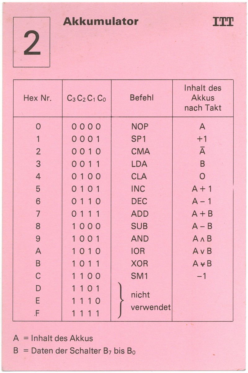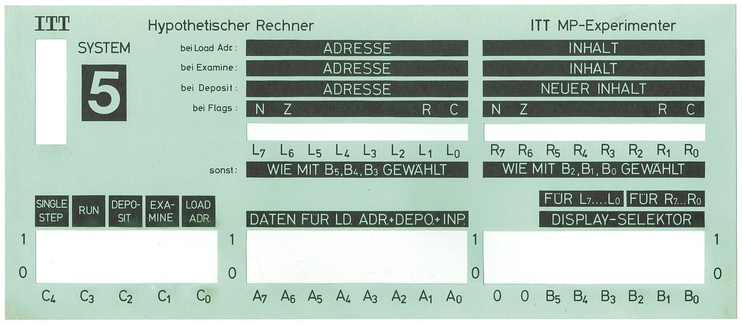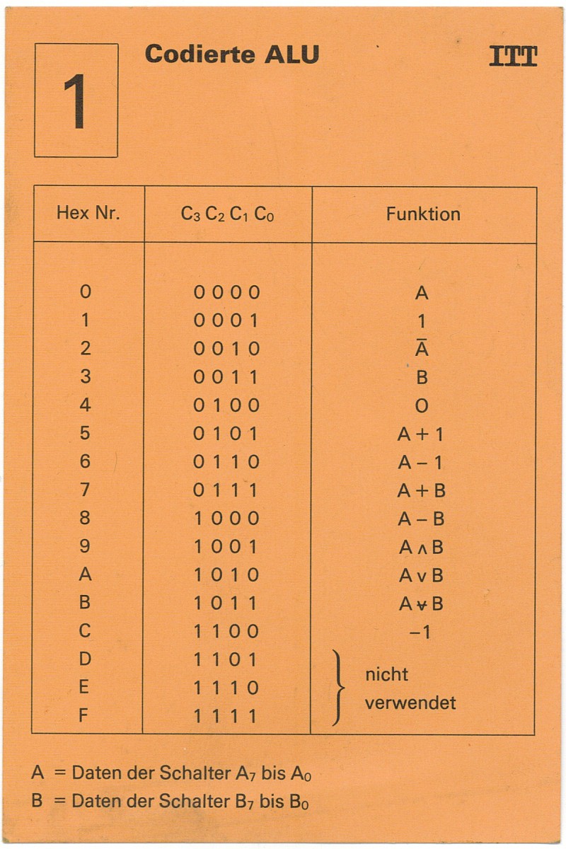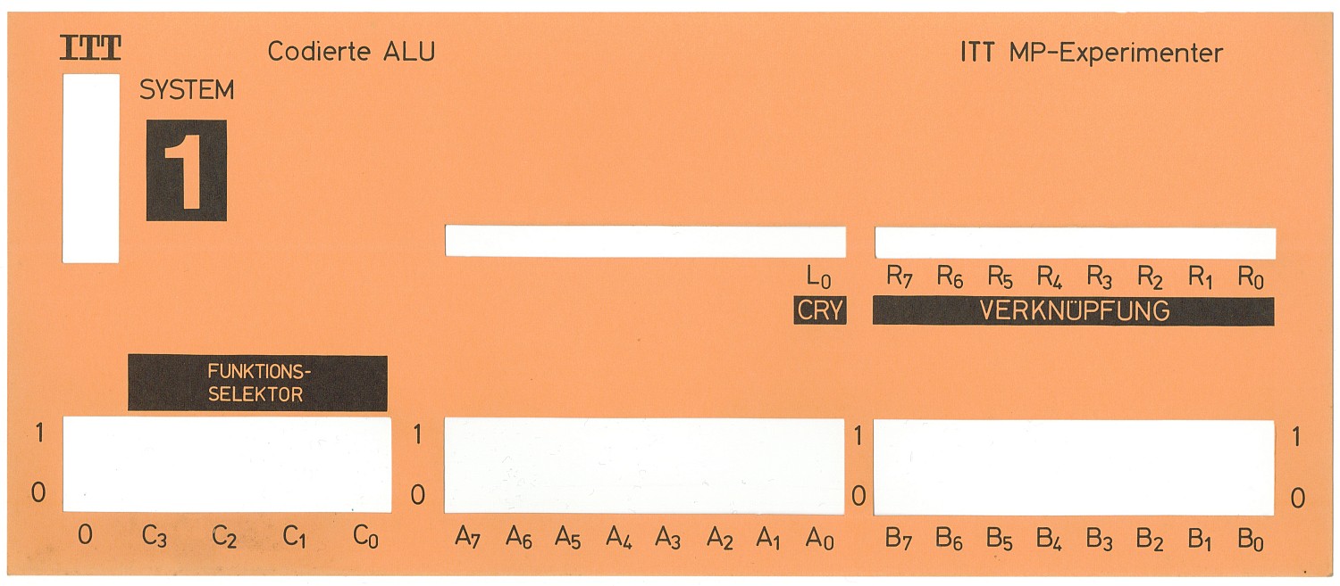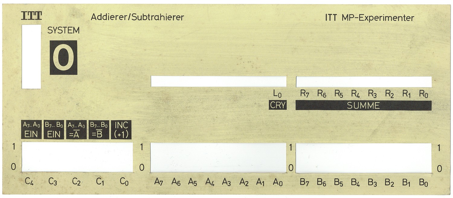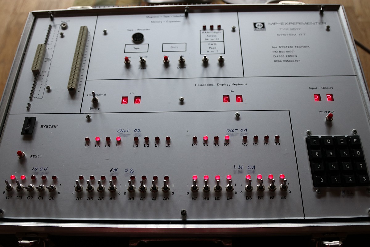 {ITT MP-Experimenter} Mitte der 70er Jahre war der Markt bereit für Microprozessorlehrsysteme alle Art. Auch ITT hat sich daran beteiligt und wählte den 8080 als Basis für ein ziemlich einzigartiges Lehrsystem: den ITT MP-Experimenter. Viele Displays, Leuchtdioden und Schalter ermöglichten vielfältige Eingaben und Experimente - vom einfachen Binäraddierer bis hin zum 8080-Microprozessorsystem. Dazu gabe es noch umfangreiche Schulungsunterlagen, die mir leider bisher noch fehlen... Durchdacht bis in's Detail: Kühlung für das Netzteil, Standfüße und ein stabiler Kaltgeräteanschluß... Einmal hin, alles drin... ;-) Die gibt es heute noch - im Gegensatz zu ITT... Das Teil besitzt sogar einen Cassettenrecorder-Anschluss für's Datenspeichern. Ob ich den je zu Laufen bekomme? Das hexadezimale Keyboard für den Prozessormodus: Vielfältige Anschlußmöglichkeiten für Hardwaresignale und Erweiterungen... Die Systemeinstellung - "0" ist ein einfacher Addierer / Subtrahierer - alles wird durch den 8080 in Software emuliert! Im Prozessormodus leuchtet das Teil wie ein Christbaum! Es sind die seltenen und hübschen LED-Punktmatrixanzeigen verbaut: Modus "Addierer": 3+3 ist tatsächlich 6... Und hey, 3-3 ist tatsächlich 0... mit invertiertem Register und gesetztem Carry... Für die Einstellung der genauen Funktionalität sind die 5 C-Schalter zuständig... eine umfangreiche Dokumentation fehlt mir - hat die wer? *bettel* ;-) Im Inneren verbirgt sich die originale 8080-Platine von ITT, eine mir unbekannte Speichererweiterung und die professionelle Adaption von HPS: (Klick - ganz groß!) Die Speichererweiterung im Detail: Die ITT-CPU-Platine: Alles sauber verlötet und gesteckt... ...oder verkabelt - aufwändig und stabil! Das Netzteil im Koffer ist linear. Mit Trafo aus heimischem Anbau: Fazit: ein tolles Gerät mit einzigartigem Aufbau! Dank zweier sehr netter Kollegen aus einem Forum habe ich nun die originalen Dokumente zum ITT-Experimenter erhalten, die auch für die Kofferversion passen - zumindest inhaltlich! {Schablonen} Die Schablonen für den ITT-Experimenter passen zwar nicht auf die Kofferversion, die Funktionalität ist aber gleich! Das Urheberrecht für diese Karten liegt natürlich bei ITT oder einer der Nachfolgegesellschaften, leider habe ich nicht herausfinden können, wen man da kontaktieren könnte... Sollte es also ein Problem mit der Veröffentlichung dieser Bilder auf meiner Webseite geben, so bitte ich um Kontaktaufnahme unter der Adresse im Impressum, damit ich die Bilder entfernen kann. {Handkarten} Die Handkarten für den ITT-Experimenter erklären die Details der Funktion im jeweiligen Modus - auch hier gelten die obigen Hinweise zum Urheberrecht und der Dank an die beiden Spender! Handkarte Nummer Null gibt es übrigens nicht wirklich... die Schablone ist selbsterklärend! {Preisliste} Und ja, die Firma HPS-Systemtechnik gibt es noch - und sie haben einen sehr freundlichen Support über Mail! Unterlagen zum System gibt es leider nicht mehr, dafür haben sie mir eine "aktuelle" Preisliste von 1983 geschickt - das letzte Jahr, in dem der Koffer verfügbar war! |
