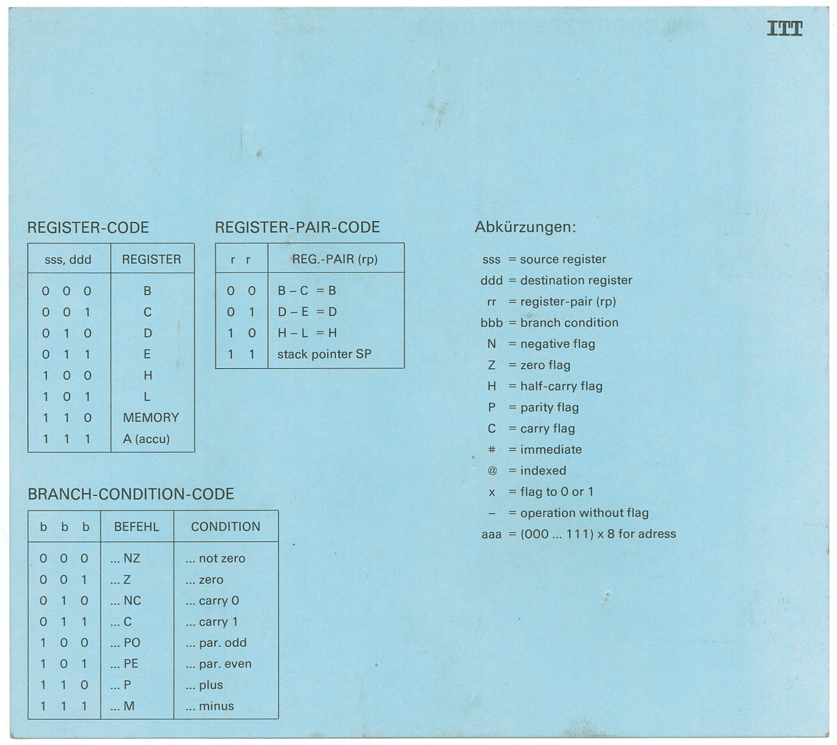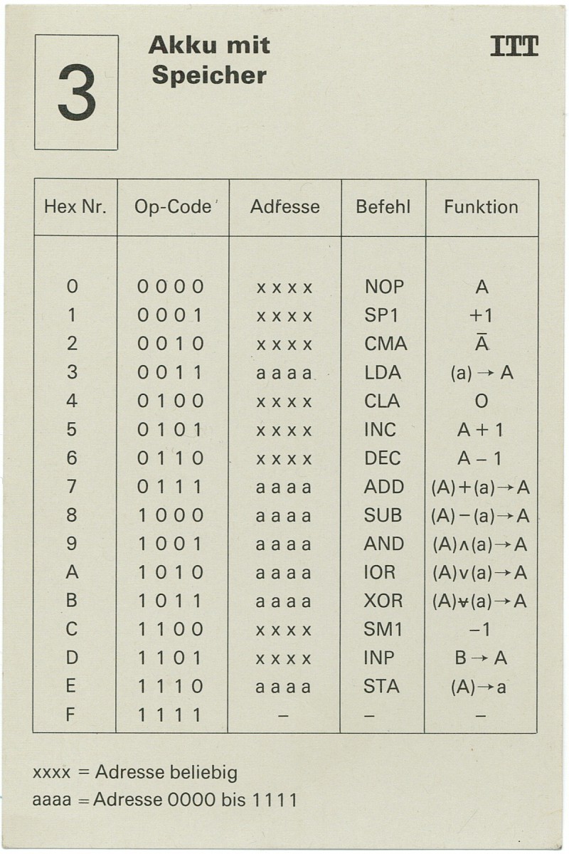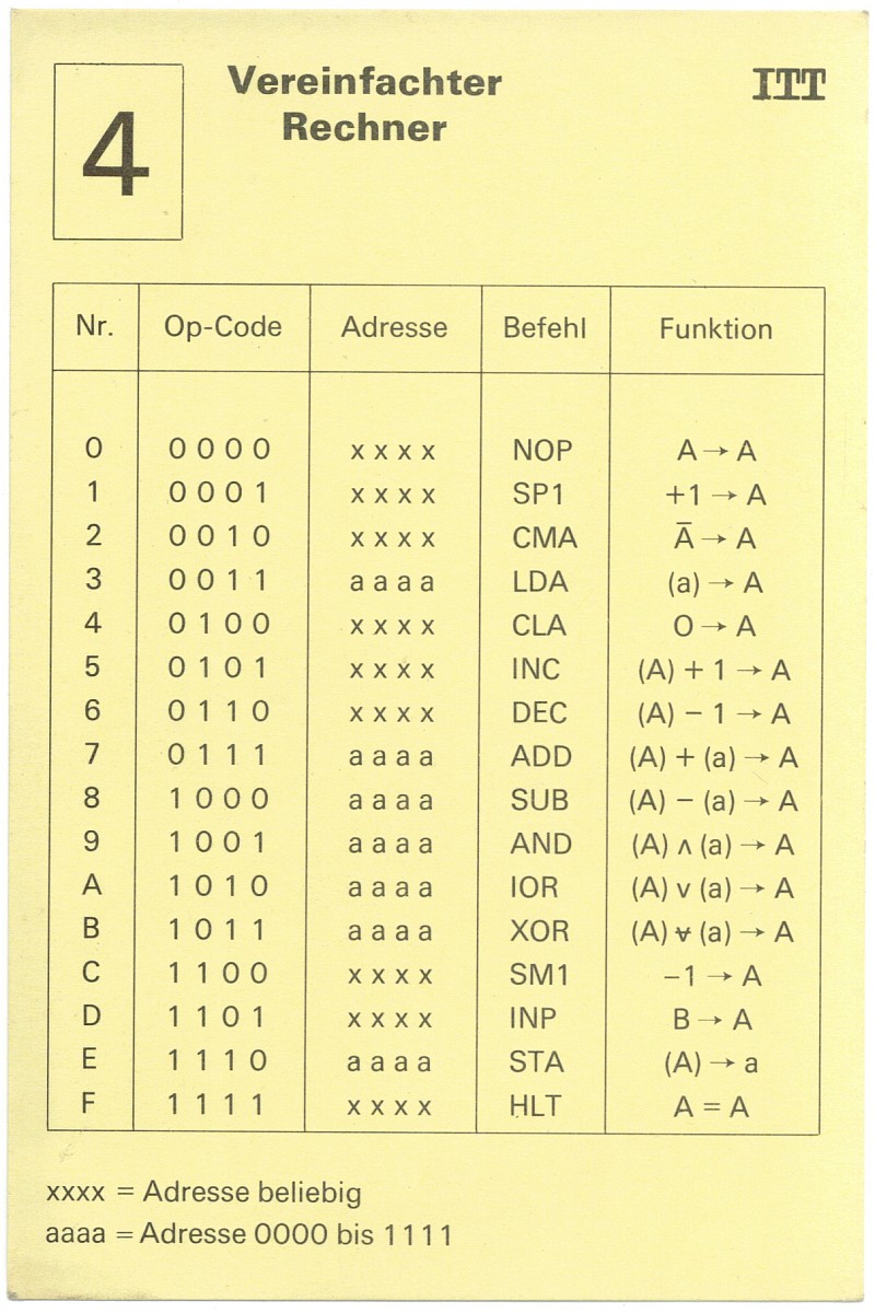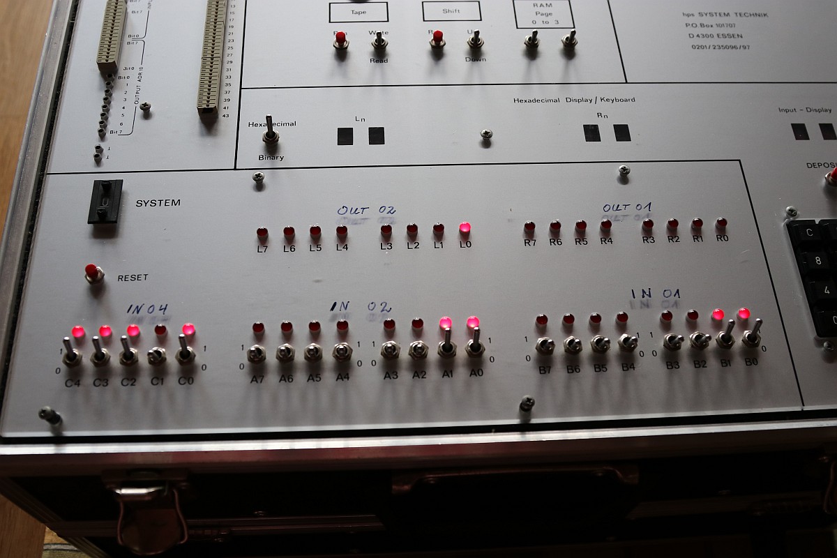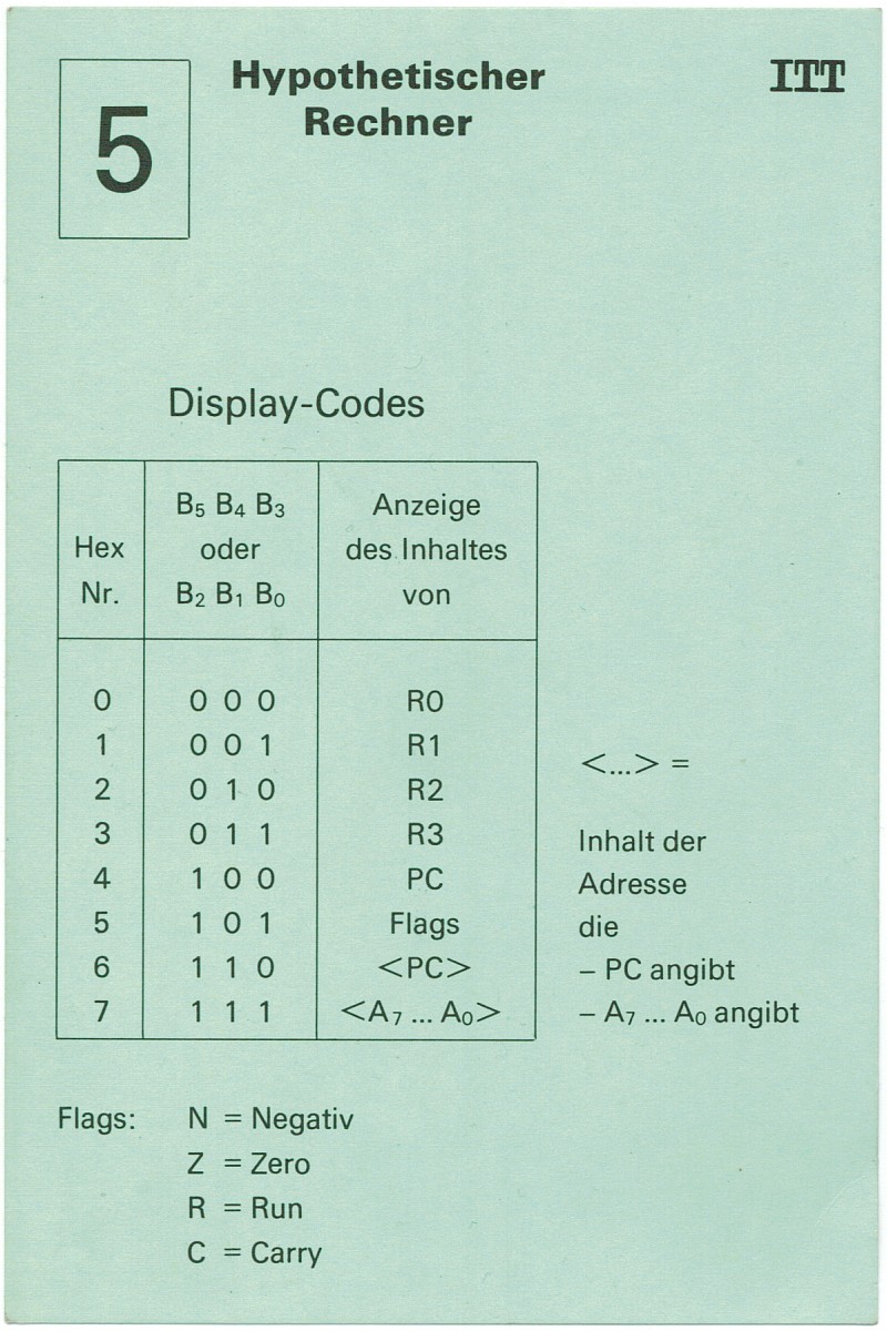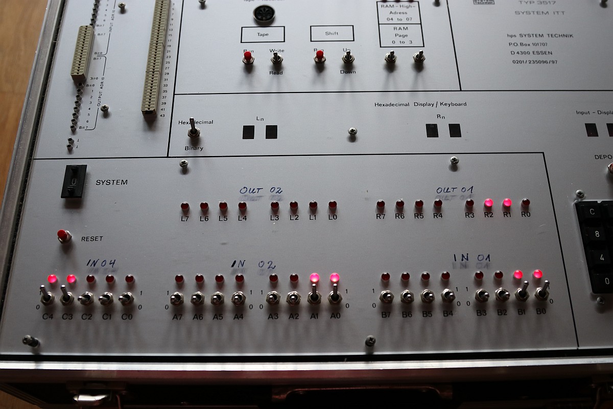 {ITT MP-Experimenter} Mitte der 70er Jahre war der Markt bereit für Microprozessorlehrsysteme alle Art. Auch ITT hat sich daran beteiligt und wählte den 8080 als Basis für ein ziemlich einzigartiges Lehrsystem: den ITT MP-Experimenter. Viele Displays, Leuchtdioden und Schalter ermöglichten vielfältige Eingaben und Experimente - vom einfachen Binäraddierer bis hin zum 8080-Microprozessorsystem. Dazu gabe es noch umfangreiche Schulungsunterlagen, die mir leider bisher noch fehlen... Durchdacht bis in's Detail: Kühlung für das Netzteil, Standfüße und ein stabiler Kaltgeräteanschluß... Einmal hin, alles drin... ;-) Die gibt es heute noch - im Gegensatz zu ITT... Das Teil besitzt sogar einen Cassettenrecorder-Anschluss für's Datenspeichern. Ob ich den je zu Laufen bekomme? Das hexadezimale Keyboard für den Prozessormodus: Vielfältige Anschlußmöglichkeiten für Hardwaresignale und Erweiterungen... Die Systemeinstellung - "0" ist ein einfacher Addierer / Subtrahierer - alles wird durch den 8080 in Software emuliert! Im Prozessormodus leuchtet das Teil wie ein Christbaum! Es sind die seltenen und hübschen LED-Punktmatrixanzeigen verbaut: Modus "Addierer": 3+3 ist tatsächlich 6... Und hey, 3-3 ist tatsächlich 0... mit invertiertem Register und gesetztem Carry... Für die Einstellung der genauen Funktionalität sind die 5 C-Schalter zuständig... eine umfangreiche Dokumentation fehlt mir - hat die wer? *bettel* ;-) Im Inneren verbirgt sich die originale 8080-Platine von ITT, eine mir unbekannte Speichererweiterung und die professionelle Adaption von HPS: (Klick - ganz groß!) Die Speichererweiterung im Detail: Die ITT-CPU-Platine: Alles sauber verlötet und gesteckt... ...oder verkabelt - aufwändig und stabil! Das Netzteil im Koffer ist linear. Mit Trafo aus heimischem Anbau: Fazit: ein tolles Gerät mit einzigartigem Aufbau! Dank zweier sehr netter Kollegen aus einem Forum habe ich nun die originalen Dokumente zum ITT-Experimenter erhalten, die auch für die Kofferversion passen - zumindest inhaltlich! {Schablonen} Die Schablonen für den ITT-Experimenter passen zwar nicht auf die Kofferversion, die Funktionalität ist aber gleich! Das Urheberrecht für diese Karten liegt natürlich bei ITT oder einer der Nachfolgegesellschaften, leider habe ich nicht herausfinden können, wen man da kontaktieren könnte... Sollte es also ein Problem mit der Veröffentlichung dieser Bilder auf meiner Webseite geben, so bitte ich um Kontaktaufnahme unter der Adresse im Impressum, damit ich die Bilder entfernen kann. {Handkarten} Die Handkarten für den ITT-Experimenter erklären die Details der Funktion im jeweiligen Modus - auch hier gelten die obigen Hinweise zum Urheberrecht und der Dank an die beiden Spender! Handkarte Nummer Null gibt es übrigens nicht wirklich... die Schablone ist selbsterklärend! {Preisliste} Und ja, die Firma HPS-Systemtechnik gibt es noch - und sie haben einen sehr freundlichen Support über Mail! Unterlagen zum System gibt es leider nicht mehr, dafür haben sie mir eine "aktuelle" Preisliste von 1983 geschickt - das letzte Jahr, in dem der Koffer verfügbar war! |