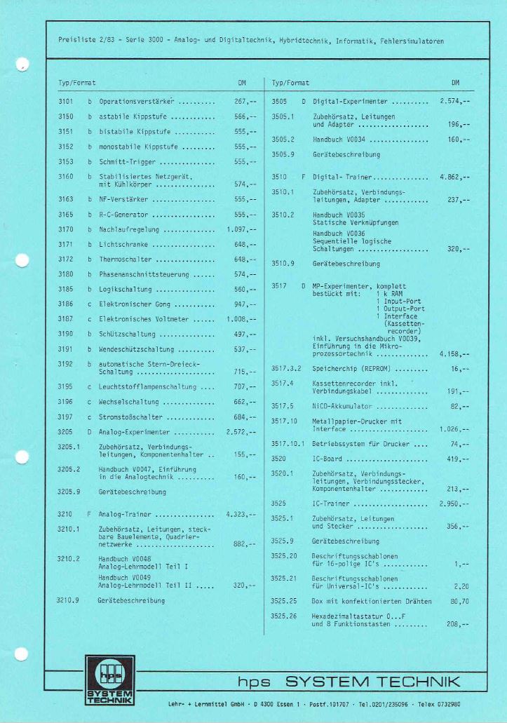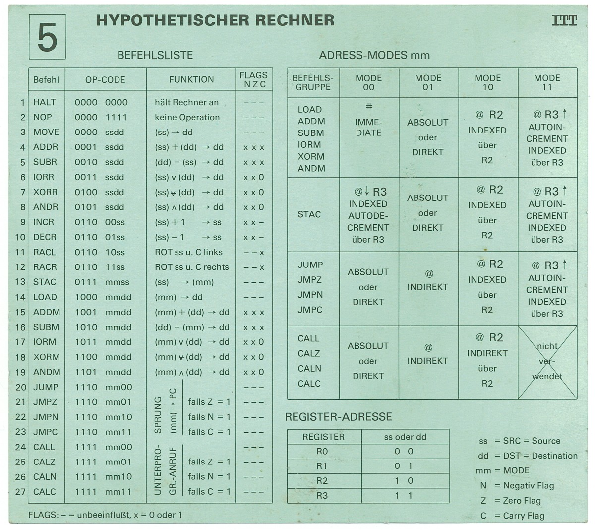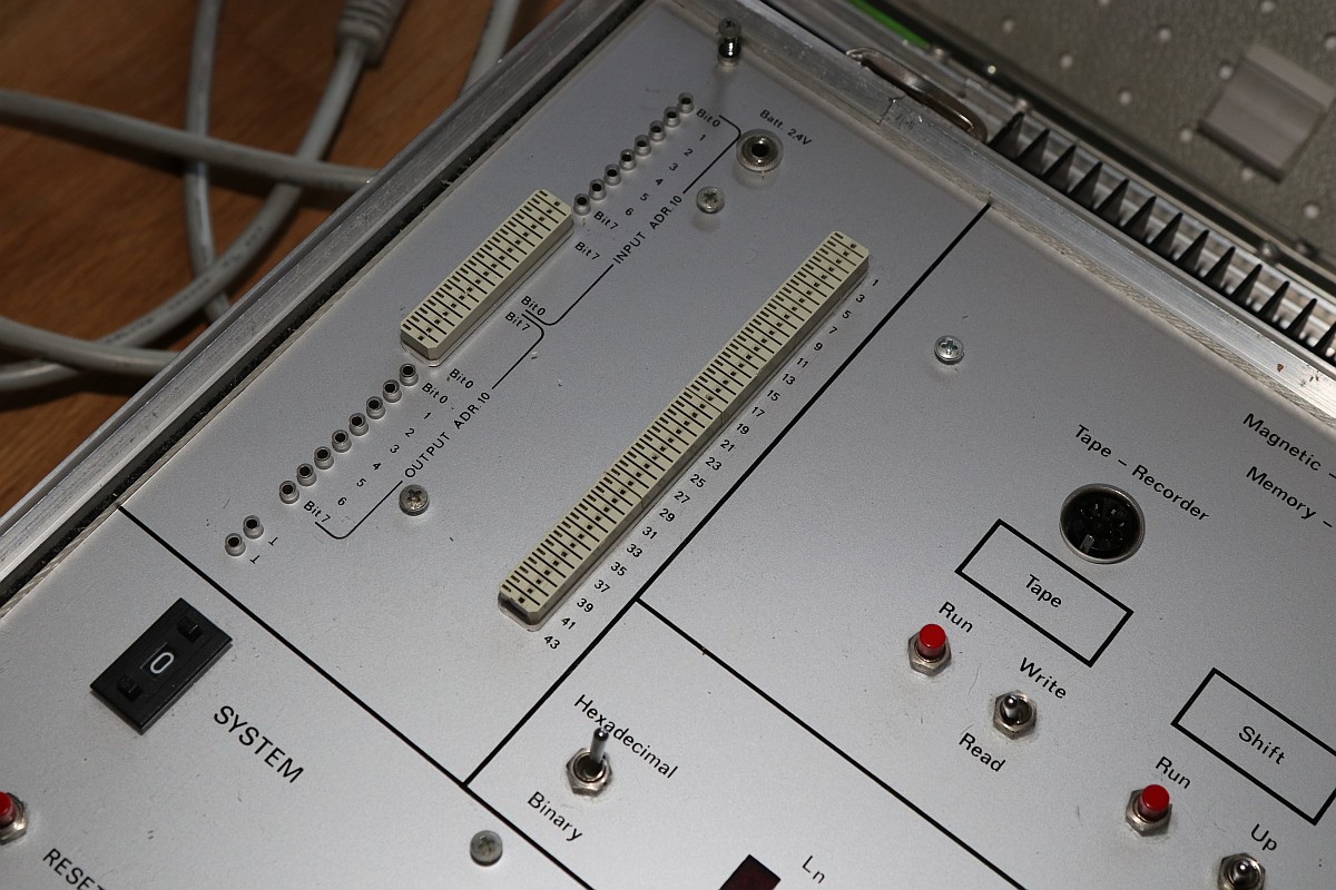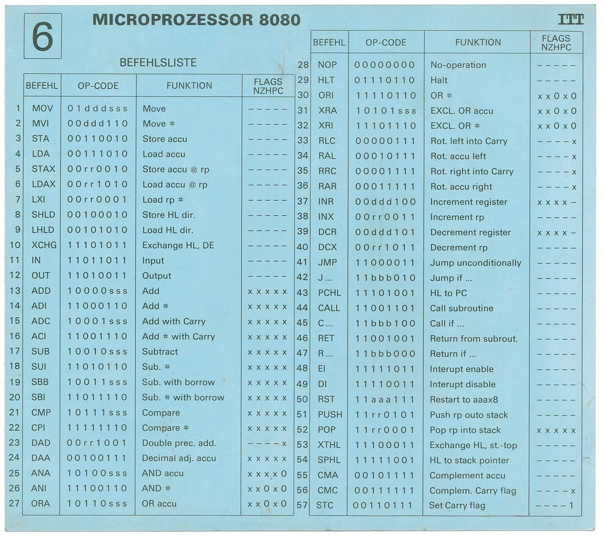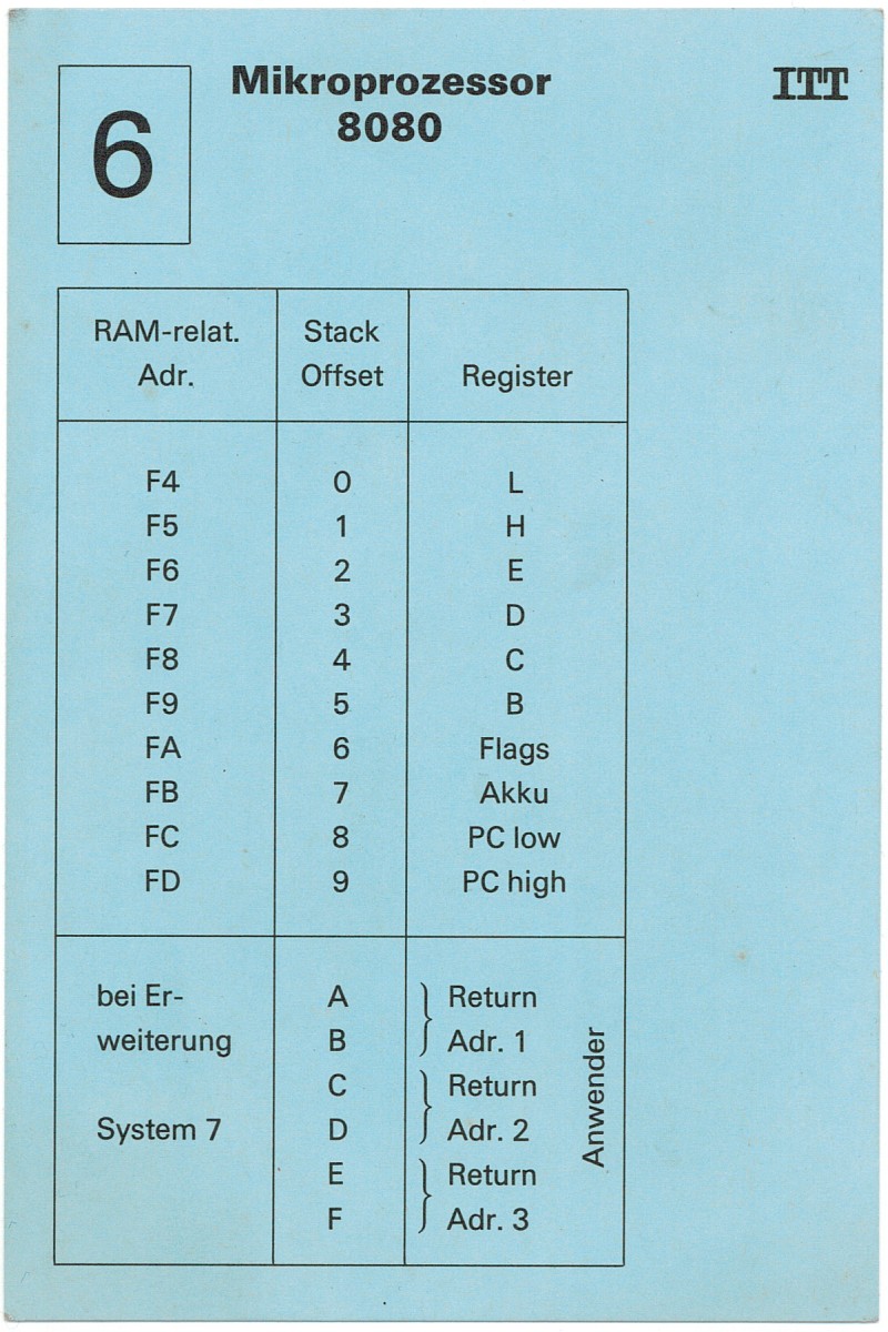 {ITT MP-Experimenter} Mitte der 70er Jahre war der Markt bereit für Microprozessorlehrsysteme alle Art. Auch ITT hat sich daran beteiligt und wählte den 8080 als Basis für ein ziemlich einzigartiges Lehrsystem: den ITT MP-Experimenter. Viele Displays, Leuchtdioden und Schalter ermöglichten vielfältige Eingaben und Experimente - vom einfachen Binäraddierer bis hin zum 8080-Microprozessorsystem. Dazu gabe es noch umfangreiche Schulungsunterlagen, die mir leider bisher noch fehlen... Durchdacht bis in's Detail: Kühlung für das Netzteil, Standfüße und ein stabiler Kaltgeräteanschluß... Einmal hin, alles drin... ;-) Die gibt es heute noch - im Gegensatz zu ITT... Das Teil besitzt sogar einen Cassettenrecorder-Anschluss für's Datenspeichern. Ob ich den je zu Laufen bekomme? Das hexadezimale Keyboard für den Prozessormodus: Vielfältige Anschlußmöglichkeiten für Hardwaresignale und Erweiterungen... Die Systemeinstellung - "0" ist ein einfacher Addierer / Subtrahierer - alles wird durch den 8080 in Software emuliert! Im Prozessormodus leuchtet das Teil wie ein Christbaum! Es sind die seltenen und hübschen LED-Punktmatrixanzeigen verbaut: Modus "Addierer": 3+3 ist tatsächlich 6... Und hey, 3-3 ist tatsächlich 0... mit invertiertem Register und gesetztem Carry... Für die Einstellung der genauen Funktionalität sind die 5 C-Schalter zuständig... eine umfangreiche Dokumentation fehlt mir - hat die wer? *bettel* ;-) Im Inneren verbirgt sich die originale 8080-Platine von ITT, eine mir unbekannte Speichererweiterung und die professionelle Adaption von HPS: (Klick - ganz groß!) Die Speichererweiterung im Detail: Die ITT-CPU-Platine: Alles sauber verlötet und gesteckt... ...oder verkabelt - aufwändig und stabil! Das Netzteil im Koffer ist linear. Mit Trafo aus heimischem Anbau: Fazit: ein tolles Gerät mit einzigartigem Aufbau! Dank zweier sehr netter Kollegen aus einem Forum habe ich nun die originalen Dokumente zum ITT-Experimenter erhalten, die auch für die Kofferversion passen - zumindest inhaltlich! {Schablonen} Die Schablonen für den ITT-Experimenter passen zwar nicht auf die Kofferversion, die Funktionalität ist aber gleich! Das Urheberrecht für diese Karten liegt natürlich bei ITT oder einer der Nachfolgegesellschaften, leider habe ich nicht herausfinden können, wen man da kontaktieren könnte... Sollte es also ein Problem mit der Veröffentlichung dieser Bilder auf meiner Webseite geben, so bitte ich um Kontaktaufnahme unter der Adresse im Impressum, damit ich die Bilder entfernen kann. {Handkarten} Die Handkarten für den ITT-Experimenter erklären die Details der Funktion im jeweiligen Modus - auch hier gelten die obigen Hinweise zum Urheberrecht und der Dank an die beiden Spender! Handkarte Nummer Null gibt es übrigens nicht wirklich... die Schablone ist selbsterklärend! {Preisliste} Und ja, die Firma HPS-Systemtechnik gibt es noch - und sie haben einen sehr freundlichen Support über Mail! Unterlagen zum System gibt es leider nicht mehr, dafür haben sie mir eine "aktuelle" Preisliste von 1983 geschickt - das letzte Jahr, in dem der Koffer verfügbar war! |