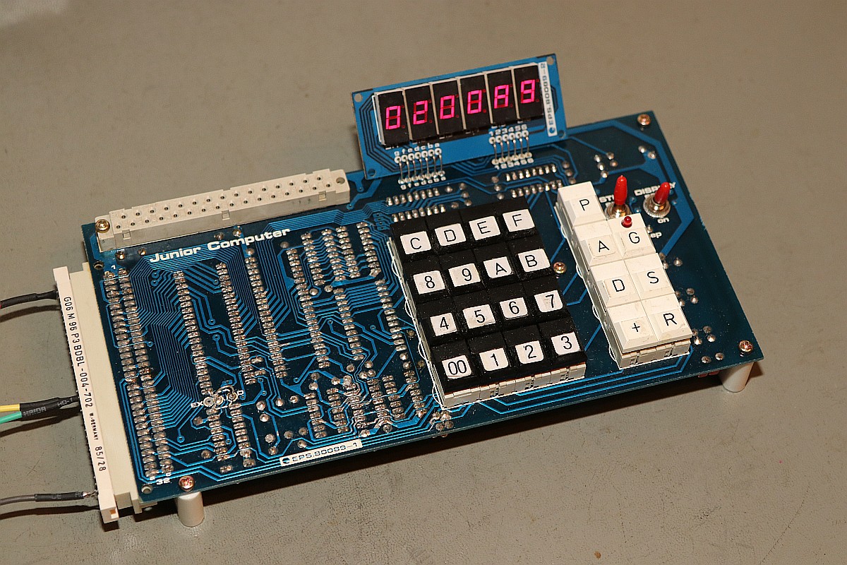 {Junior Computer - der Dritte} Viele Jahre hat man sowas gar nicht da, dann kommt Einer nach dem Anderen... mein dritter Junior Computer ist restauriert - jetzt können die Kerlchen endlich Skat miteinander spielen... Das wäre doch mal was... Erstaunlich ist, wir stark die Teile manchmal verbastelt sind, trotzdem bekommt man mit etwas Geduld alles wieder hübsch und funktionstüchtig. Dieser Kollege besticht mit einem originalen Elektor Software Service (ESS) Monitor-EPROM 2708 und benötigt deswegen auch alle drei Versorgungsspannungen. Ich denke, ich werde ihn für einen ausführlichen Maschinensprachekurs auf Zerobrain hernehmen...