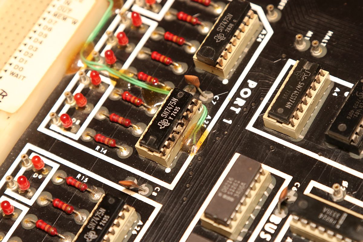 {MMD-1 8080A SBC} Der MMD-1 von E&L Instruments war 1976 nicht der erste SBC, aber bestimmt eines der ersten Systeme für den Intel 8080A Prozessor! Mit grandiosen 512 Byte RAM und 512 Byte ROM war da schon einiges möglich - viel aber auch nicht. E&L Instruments hatte das Design fast vollständig von der Elektronikzeitschrift "Radio Electronics" übernommen. In der Ausgabe 05/1976 wird das System genau beschrieben. Herzlichen Dank an www.americanradiohistory.com, auf deren Webseiten die Ausgaben einsehbar sind. Und dass der MMD-1 nicht der erste SBC war, wie es manchmal im Netz behauptet wird, zeigt die Anzeige für den KIM-1, die im gleichen Heft bereits für den bekannten 6502-SBC wirbt:. Das Exponat kam bei mir unvollständig und nachvollziehbar nicht funktionierend an. Auch der Einsatz einer standesgemäßen Intel 8080A CPU führte nicht zum Erfolg. Ob das an korrodierten Pins oder defekten TTLs lag, lässt sich nicht mehr feststellen... An der Ami-Sicherung lag es nicht, die hatte ich gleich zu Beginn ausgetauscht. Natürlich nicht gegen die untere Sicherung auf dem Foto, die dient nur dem Größenvergleich. Vielleicht lag es auch an den Umbauten auf dem Board, dessen Fädeldrähte man hier erkennen kann. Mit einem Kippschalter konnte man den LED-Port irgendwie auch auf einen Steckverbinder schalten... Dieser Kippschalter ragte recht weit nach unten raus... ... und traf sich bei nicht ordnungsgemäß verschraubter Platine mit dem direkt darunter liegenden unisolierten Netzschalter. Peng! Feuerwerk! Licht aus! Ein TTL Flipflop als Funkenstrecke... Eigentlich ist die Platine ja galvanisch getrennt, aber die 230VAC haben sich offensichtlich irgendeinen Weg in Richtung PE gesucht und gefunden. Ich will jetzt mal wissen, was so ein Supergau anrichtet. Erstmal alle Umbauten entfernen und den Originalzustand herstellen... Erstaunlich: auf der Leiterplatte gibt es keine verschmorten Leiterbahnen. Schalter weg, Stecker weg - die Platine hat 3,0 Ohm zwischen +5V und Masse - das heißt: so lange ICs ziehen, bis der Widerstand im erträglichen kOhm-Bereich liegt! Das Netzteil funktioniert noch einwandfrei. Die Elkos kann man trotzdem mal präventiv tauschen. So sieht die Verkabelung doch schon etwas fachgerechter aus: Die Guten in's Töpfchen, die Schlechten vor die Kamera... 230VAC sind kein Spaß! Weil es so eindrucksvoll ist... Nach der Neubestückung mit alten Schätzen: dieser Adressbus gefällt mir nicht. Ganz rechts hat von Anfang an ein 7404 gefehlt. Aus Gründen! Genau der schließt nämlich den ungepufferten Adresbus A12 mit dem gepufferten A2 kurz... Ohne IC geht das, dieses IC bedient auch nur den Erweiterungsstecker. Zwischendurch habe ich mal das Netzteil mit neuen Elkos versehen... ... und dann noch den Erweiterungsstecker abgelötet. Der hatte eine haarfeine Verbindung an den Vias, die man mit bloßem Auge nicht gesehen hat! Und schon läuft alles wieder einwandfrei! Selbst CPU, Taktgenerator und das 1702A-EPROM haben den Spannungsanschlag überlebt. Na ja, für den 1702 ist das quasi erst knapp über Brennspannung... Bis auf eine LED geht auch die Lichtorgel - endlich mal oktal programmieren. Im nächsten Beitrag zeige ich dann, wie man mit diesem Board umgeht und sogar selbstmodifizierenden Code zum Laufen bringt! |