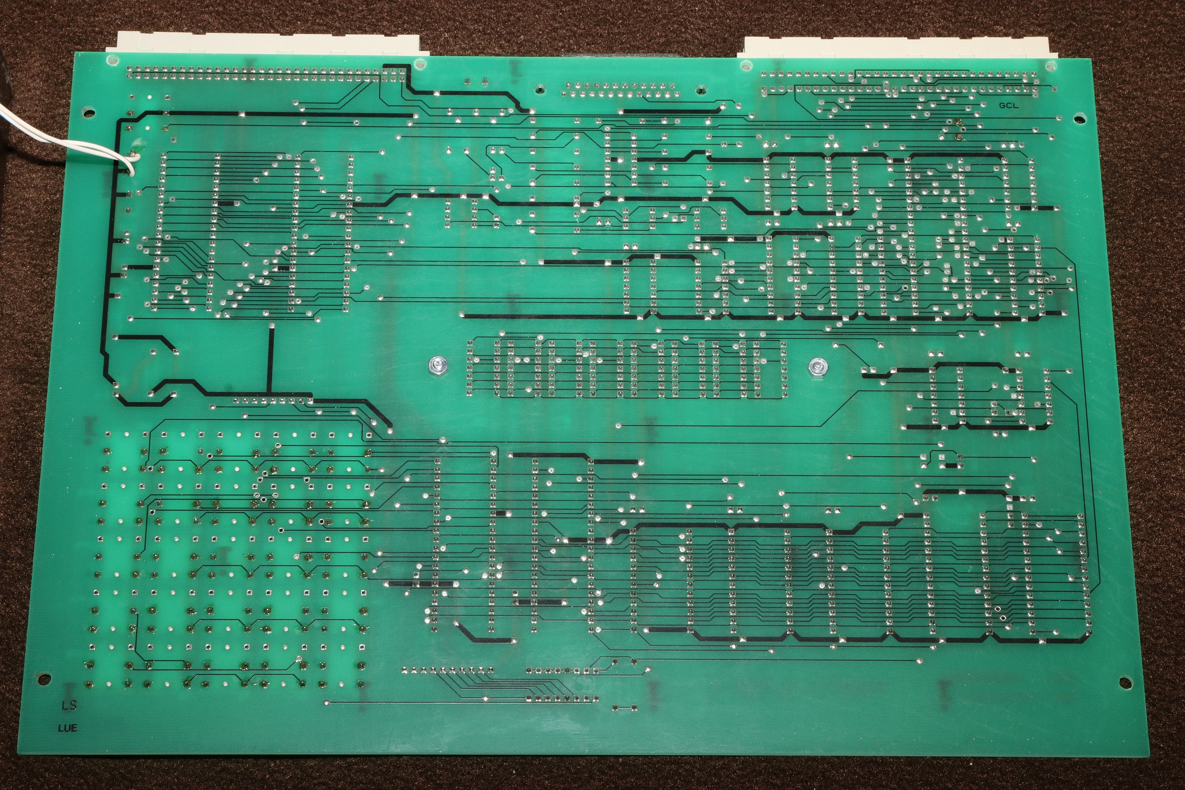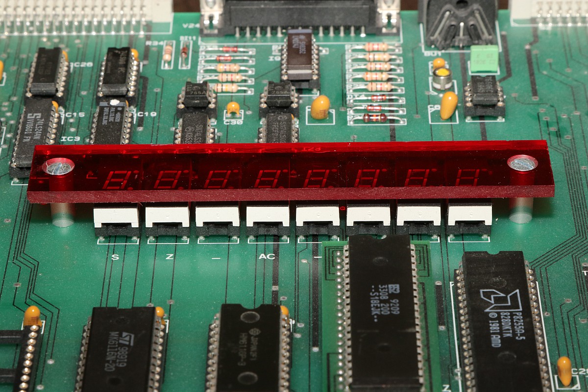 {PROFI-5/50 E Einplatinenrechner mit 8085} Ein erstaunlich langes Marktleben war dem PROFI-5/50 E Einplatinenrechner als Ausbildungscomputer beschieden: von 1981 bis 1994 wurde das Gerät als PROFI-5 verkauft, dann bis 2011 als PROFI-5/50E, jeweils wahlweise mit 8080 oder 8085 CPU! Entwickelt vom Ingenieurbüro Kammerer, erwies sich das System als extrem langlebig, vermutlich auch deswegen, weil es sich schnell in verschiedensten Ausbildungsbetrieben etablierte. Nun ist eines dank eines großzügigen Angebotes auf meinem Tisch gelandet und ich kann es euch nun vorstellen: Auch ein schöner Rücken kann entzücken... Auf der Rückseite des stabilen Blech-Pultgehäuses befinden sich diverse Anschlussmöglichkeiten für Zusatzkarten, V24-Schnittstelle, Cassettenrecorder und - etwas rustikal - zwei Bananenbuchsen für die 5V-Stromversorgung. Im Inneren des Gehäuses befindet sich... äh... genau nix. Das Blechgehäuse liegt an Masse. Das Arbeitstier: die 8085 CPU. Und im EPROM: ein ausgeklügeltes Monitorprogramm mit vielen nützlichen Funktionen. Alle wichtigen Dinge werden auf einem 8-stelligen 7-Segment-Display angezeigt... ...welches von einem seltsamen Custom-ASIC angesteuert wird. Von oben... ...und von Unten. Diese Konstruktion ersetzt wohl einen nicht mehr erhältlichen Displaycontroller aus früheren Versionen... Nach Anlegen der Spannungsversorgung begrüßt uns das System ganz profan mit "0000". Zusätzlich habe ich noch ein IC-Spielboard erhalten, auf dem man mittels Steckbrücken beliebige ICs verdrahten kann. Das Board von unten: Ich bin gespannt, was es zu diesem System noch herauszufinden gibt! {Hochauflösende Fotos von Jörg Svens Profi 5E} Schon vor Jahren erhalten - jetzt pflege ich sie endlich ein: Jörg Sven W. hat mir freundlicher Weise gute Bilder seines Profi 5E zukommen lassen, der sich vor allem durch den Displaytreiber unterscheidet. |