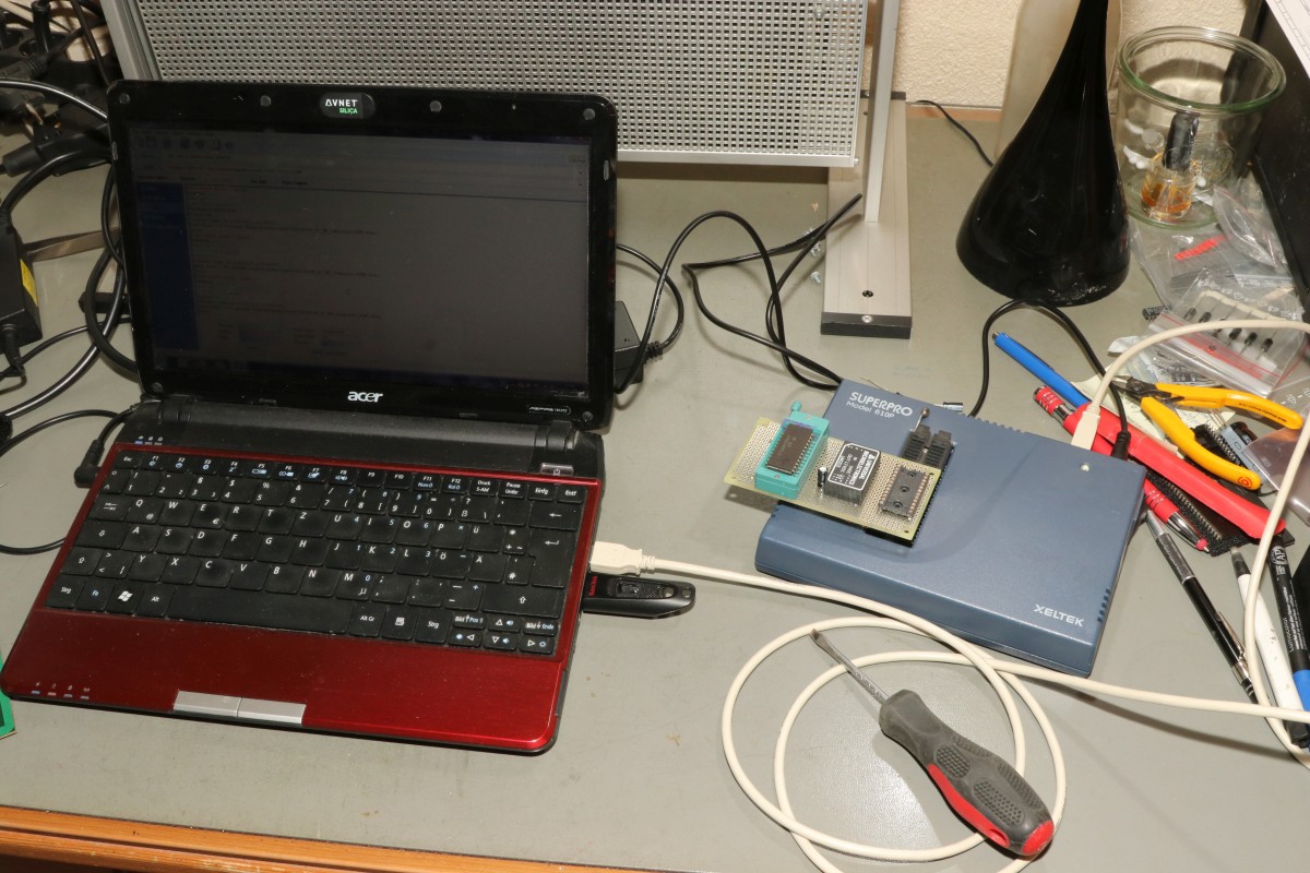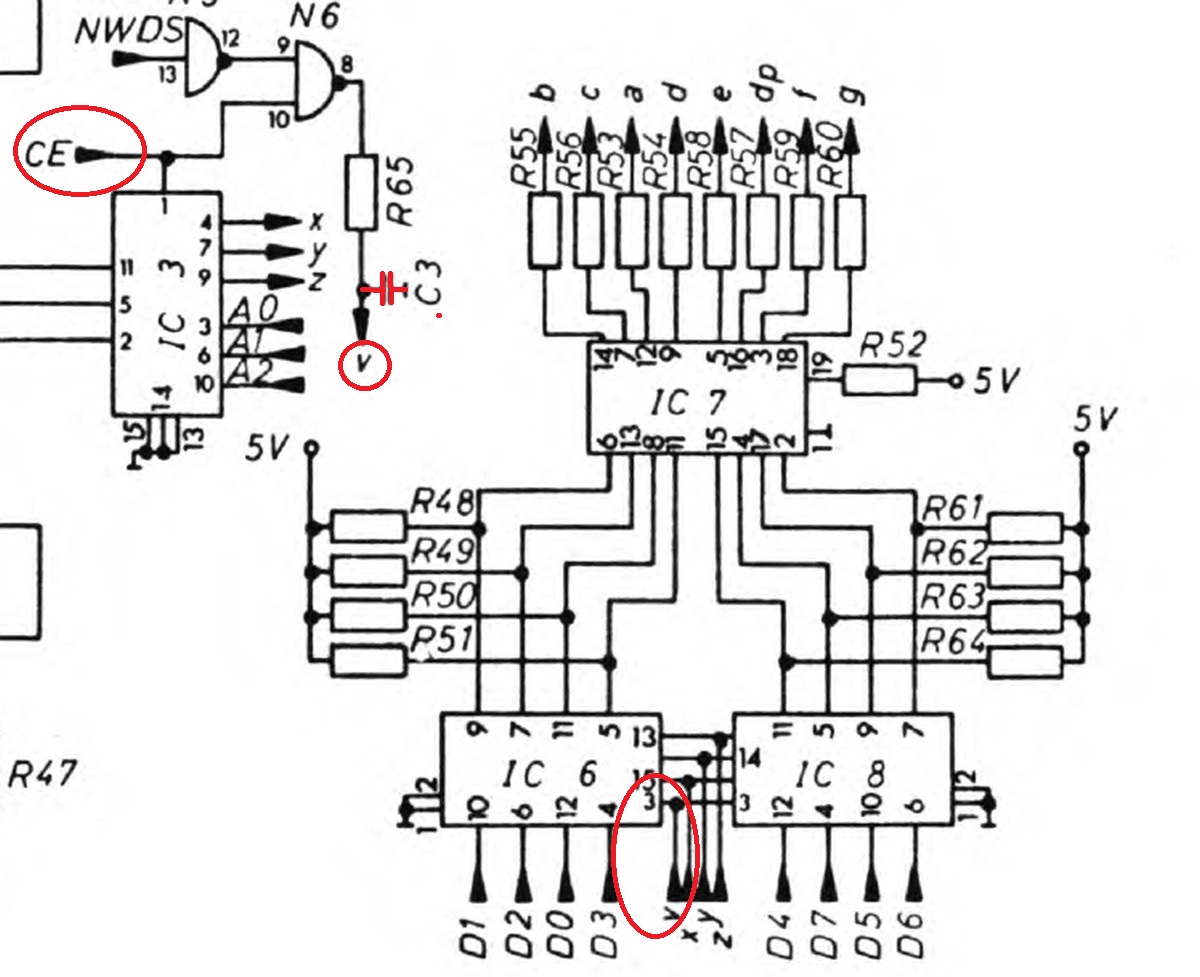 {SC/MP Reparatur} Jetzt kommt die Stunde der Wahrheit... Aber wie ich es erwartet hatte: das Display zeigt stoisch "88888888" und die CPU springt permanent in den "HALT" Status - hier geht erstmal nix. Nach langer Suche und Messerei identifiziere ich stark oxydierte Bustreiber als eine der Ursachen für das HALT-Problem... Nachdem diese mittels Glasfaserstift wieder hübsch geputzt waren, überzeugt mich die CPU von ihrer Leistungsfähigkeit durch ein regelmäßiges Muster auf dem CS# des mittleren ELBUG-EPROMs... zumindest läuft da was. Da ich nicht entscheiden kann, ob dieser Zyklus normal oder ein Defekt ist, muss ich zu drastischen Mitteln greifen... Das MM5204 ist ein fieses EPROM, nicht mehr ganz so fies, wie das erste 1702A, aber doch fies. Es benötigt 5V und -12V als Versorgungsspannungen und hält sich an keinerlei Pinbelegungskonventionen! In meiner DC/DC-Wandler-Grabbelkiste ist noch was Passendes drin. Den Rest erledigt Fädeldraht. Ich versuche, das EPROM als 2716 auszulesen - in der Hoffnung, dass der Programmer nach dem Anlegen der 5V-Versorgung lange genug wartet, dass sich die -12V aufbauen können... Auch das eine PROM ohne Fenster wird gelesen... Tschacka! Das Ergebnis sind Binärfiles mit vier identischen Bereichen - klar, 2716 ist ja vier mal so groß wie MM5204... Nach dem Splitten der Daten kommen drei Binärfiles raus, die tatsächlich die korrekten Daten des ELBUG Monitors enthalten. Die Prüfsummen stimmen mit denen der entsprechenden Emulatoren-Files überein! Die gute Nachricht: ich kann MM5204 auslesen. Die schlechte Nachricht: es liegt nicht an den EPROMs, dass der Rechner nicht richtig läuft! Zumindest kann ich jetzt gezielt Fehler suchen... die CPU läuft zyklisch und das CE# Signal verändert sich leicht, wenn man eine Taste drückt. Langer Rede kurzer Sinn: der erste Grund, warum sich auf dem Display nichts zeigt, ist ein defekter Pfostenstecker am Flachbandkabel zwischen RAM/ROM-Karte und Display/Taststur-Einheit... Schön... zumindest steht schon mal Schrott auf den Anzeigen... Da wird wohl nichts in die TTL-RAMs geschrieben... das WE# Signal sieht doof aus... (das untere Signal in rot) Da muss ich doch mal näher auf die Platine sehen... Noch näher... Argh... selbst eingebaute Fehler sind die dümmsten Fehler... Nach behobenen Kurzschluss kann man schon mal den Text auf den Displays erahnen - leider ändert der sich bei jedem Reset leicht... da ist noch ein Timing grenzwertig... Der Widerstand und der kleine 10pF-Kondensator sind dafür da, dass das Schreibsignal kurz nach dem Durchschalten der Adressen kommt... zusätzliche 47pF sorgen zuverlässig dafür, dass die Russen-RAMs da auch mitspielen - vermutlich sind die deutlich schneller oder kritischer, als die TI-Varianten... Endlich... kaum 7h Reparaturzeit verstrichen, schon geht die Kiste... Das "mo" ohne Mittelstrich steht für "Modify"... da kann man Speicherstellen ansehen. Zum Beispiel das erste Byte auf Adresse 0x0000 - und das ist richtiger Weise 0x08 (NOP). Und das zweite Byte steht auf 0xC4 - auch richtig... Ach ja, dass ich mir mein Schaltnetzteil duch einen unachtsamen Kurzschluss gegrillt habe, sei hier nur am Rande erwähnt... wo gehobelt wird, da fallen halt Späne. Solange, bis der Ersatz-7912 in Vollisolierung (wer hat sowas schon da?) eingetroffen ist, muss eben noch ein DC/DC-Wandler herhalten - ich hab ja genug... Jetzt fängt das System langsam an, mir Spaß zu machen - nach 30 Jahren Dornröschenschlaf wachgeküsst. Jetzt gibt es immerhin etwas mehr Infos im Netz über dieses System! Und in der nächsten Folge beschäftigen wir uns mal mit den interessanten Zusatzkarten! |
