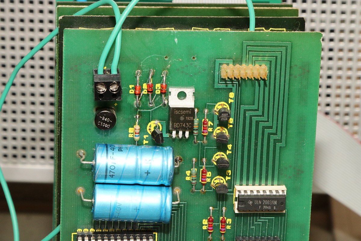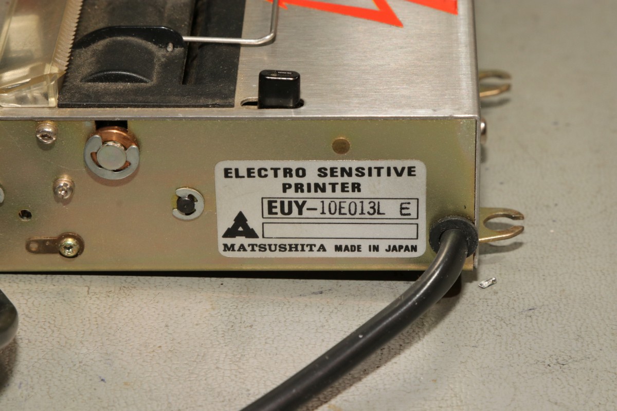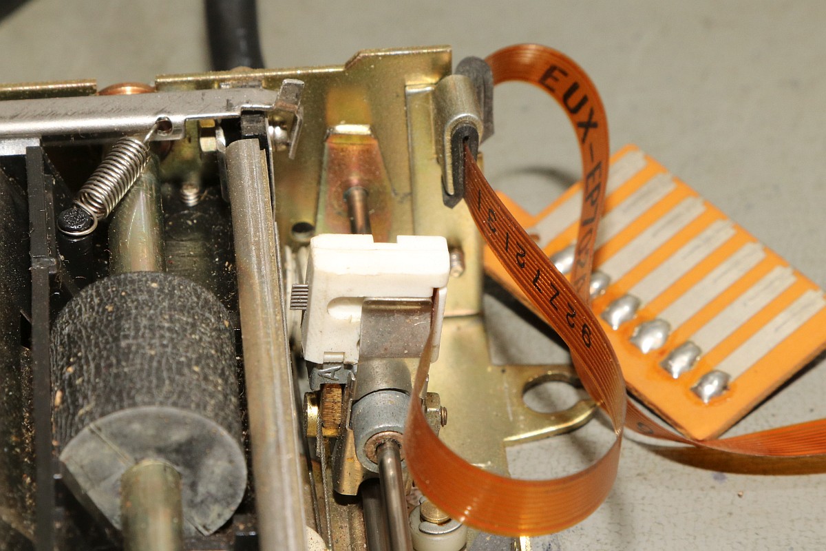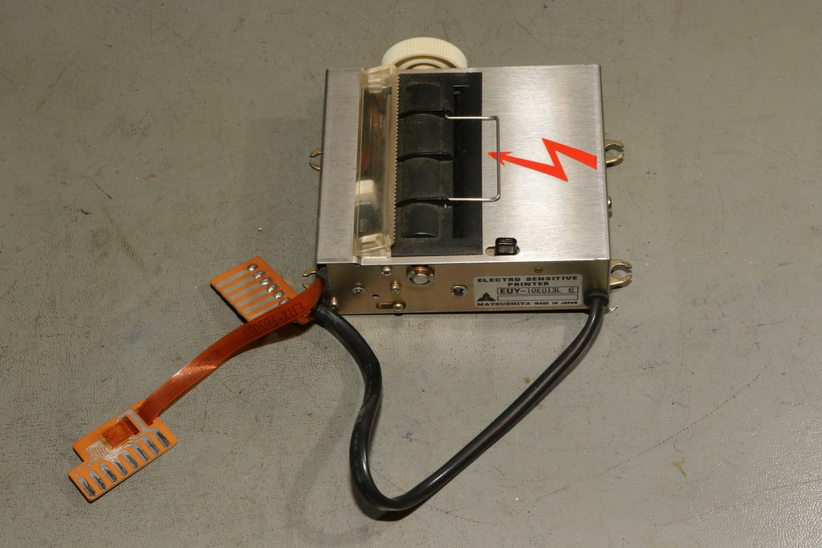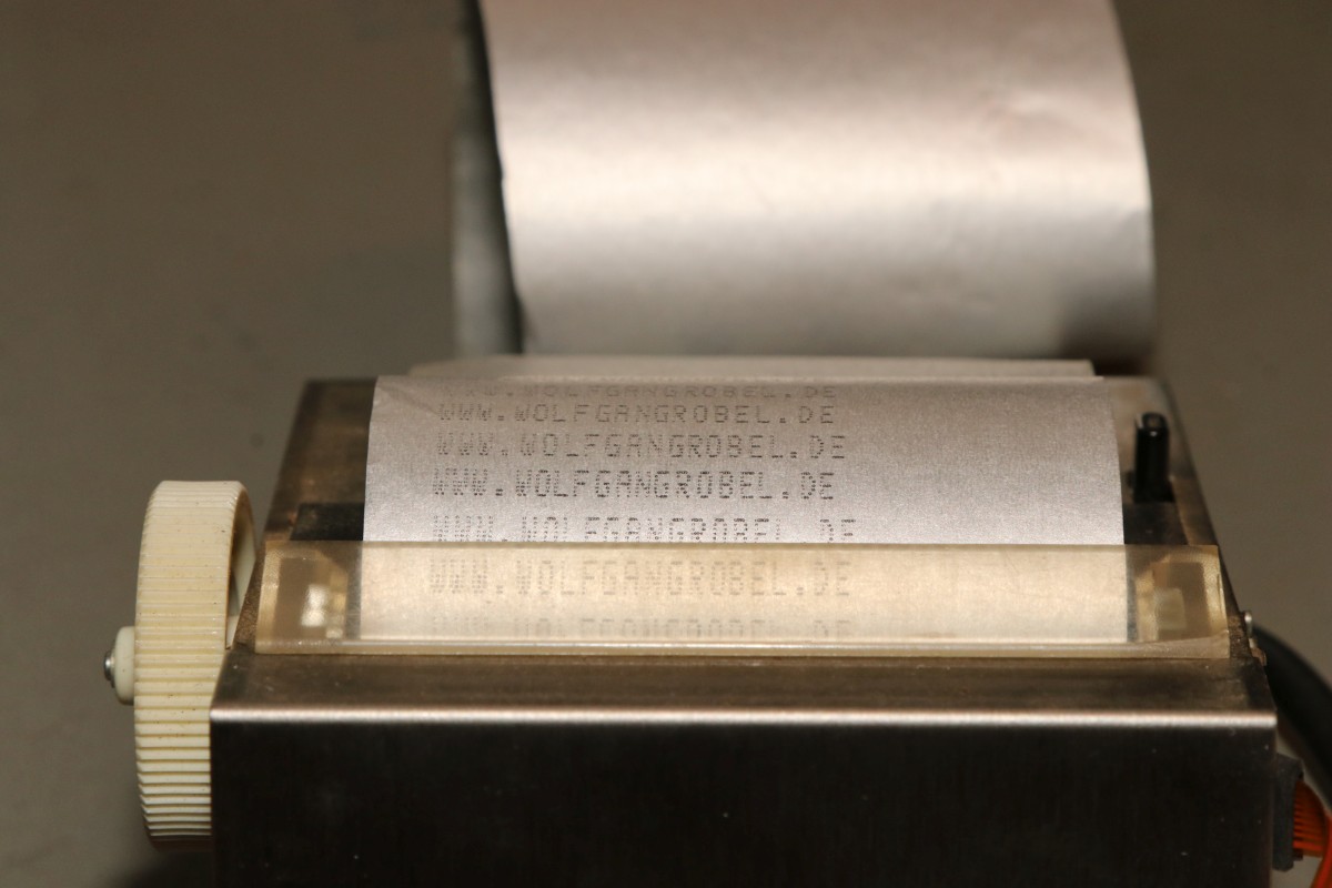 Und weiter im Text. Als Erstes hat mich der Umbau der EPROM-Karte gestört: diese wurde von Dreispannungs-EPROMs auf schnöde 2716 umgebaut, das aber auch nur halbherzig, da nur zwei Sockel umverdrahtet wurden. Da ich gerne 2708 brenne, habe ich das mal wieder komplett rückgängig gemacht. Im Detail: da hat wohl wer eine Axt zum Umbau verwendet... Wieder sauber gebrückt: Der 2716 war eh nur halb voll - die Adressbusumschaltung war gar nicht aktiv... der 2708 passt doch viel besser zum Gerät! Jetzt zum eigentlichen Teil dieses Kapitels: der Metallpapierdrucker! Das Teil liegt gehäusemäßig an +27V, da die Treibertransistoren für die Nadeln das nur so hergeben. Daher muss der Drucker isoliert in das Gehäuse montiert werden! Die Isoliergummis haben schon die besten Zeiten hinter sich... Hochspannung! Nicht wundern - der 30V-Trafo hängt an einem zusätzlichen Trenntrafo. Ich bin ja nicht leichtsinnig! Die Druckersoftware steckt im EPROM auf der Druckerkarte. Dieses adressiert ab 0xF000. Ein Start bei 0xF00E druckt zwei Mal eine Zeile, deren ASCII-Daten ab 0x0F00 im RAM stehen. Was könnte ich da wohl ausdrucken? War klar, oder? Aber der Kontrast lässt noch zu wünschen übrig... Ich erhöhe mal mit geeigneten Zener-Dioden die Drucker Versorgungsspannung... Sieht schon besser aus... leider ist der Druckermotor jetzt so schnell, dass der Rechner nicht mehr zuverlässig bei Spaltenzählen mitkommt... Das Druckwerk ist von Matsushita, Unterlagen dazu habe ich leider keine mehr gefunden. Der Typ: EUY-10E013L Hier sieht man das Zahnrad mit der Sensorspule für die Spaltenerkennung: 7 Nadeln, die auf der Druckzeile permanent auf dem Papier liegen - nur am Ende der Zeile wird der Kopf abgehoben. Jede Nadel kann einzeln unter Strom gesetzt werden und brennt die µm-dicke Aluschicht vom Papier weg. Da wird dann das darunter liegende schwarze Papier sichtbar. Ein simples Druckerkonzept, welches die Kosten für die Mechanik reduziert, dafür sündhaft teures Spezialpapier nötig macht... Das war jetzt mal die Hardware des SC/MP-Computers - schön, dass nach so langer Zeit wieder alles funktioniert! Im nächsten Kapitel werde ich mich demnächst mal mit der Programmierung des sonderbaren Prozessors beschäftigen. {Drucker Reparatur} Ich bin ja Perfektionist, so musste ich mich ganz gezielt mit der Druckermechanik beschäftigen - solche "Notlösungen" will ich nicht. Als erstes habe ich mal genügend Druckerpapier bestellt - das gibt es noch im Keglerzubehör und es ist unglaublich teuer... Dafür ist das Druckbild aber auch wieder einwandfrei. Der Unterschied zu überlagertem Papier ist signifikant - womöglich spielt Korrosion hier eine Rolle... Neue Durchgangstüllen ersetzen die krümligen alten Gummireste. Passt 1a. Der angesägte 2N3055 wird durch etwas Passenderes ersetzt: Die Abstandshalter sind sehr provisorisch. Das geht auch professioneller. Hier ist nicht viel Platz... Perfekt! Jetzt entspricht der Aufbau meinen Qualitätsstandards! {Matsushita EUY Dokumentation} Es ist zwar nicht genau der gleiche Drucker, aber immerhin so ähnlich! Deswegen wollte ich euch die Doku nicht vorenthalten. Danke an Markus B., der mich auf das Dokument hingewiesen hat!
