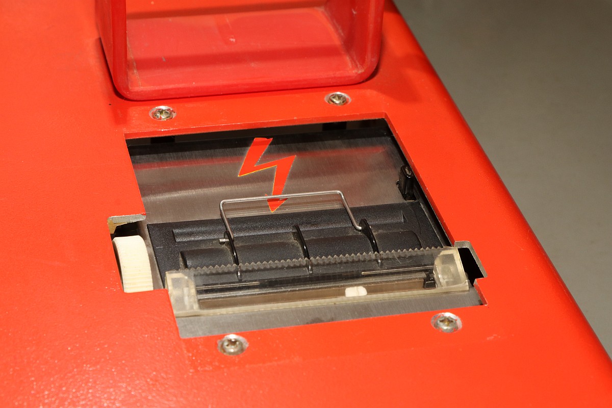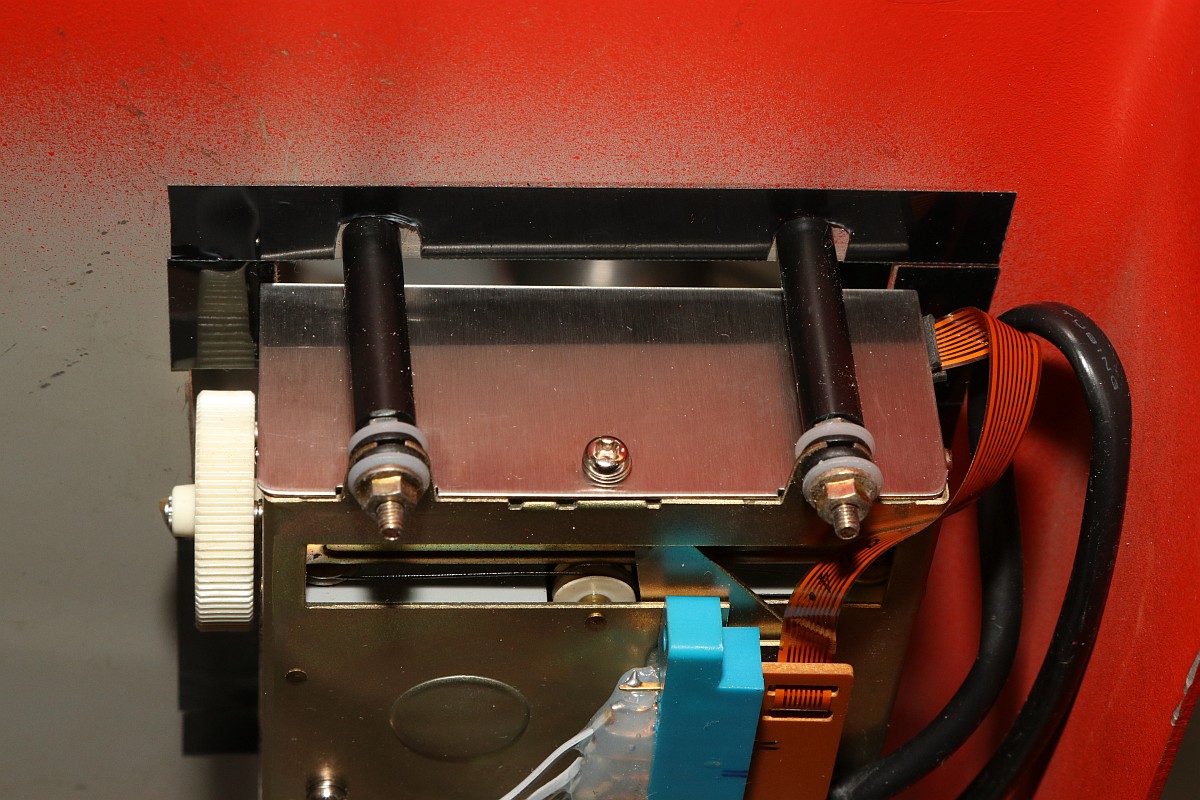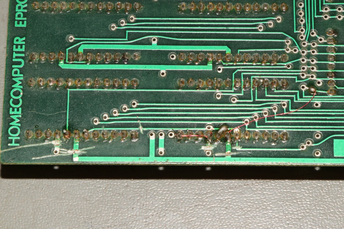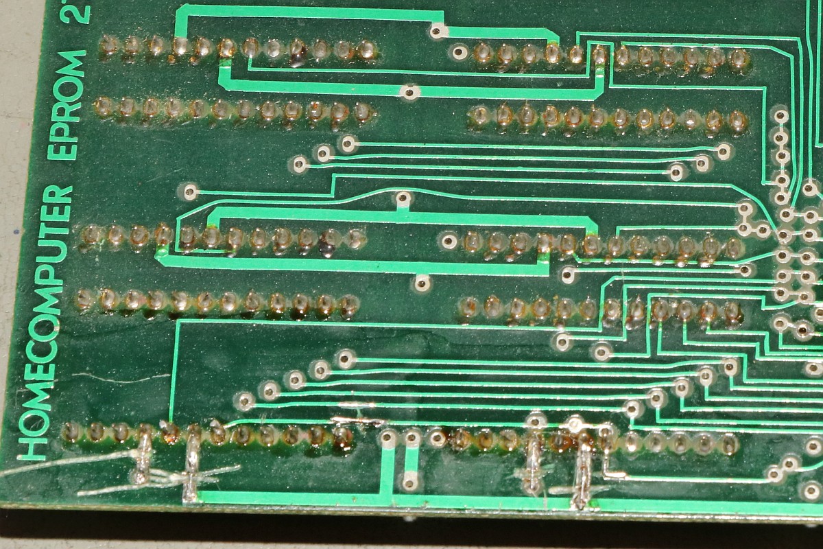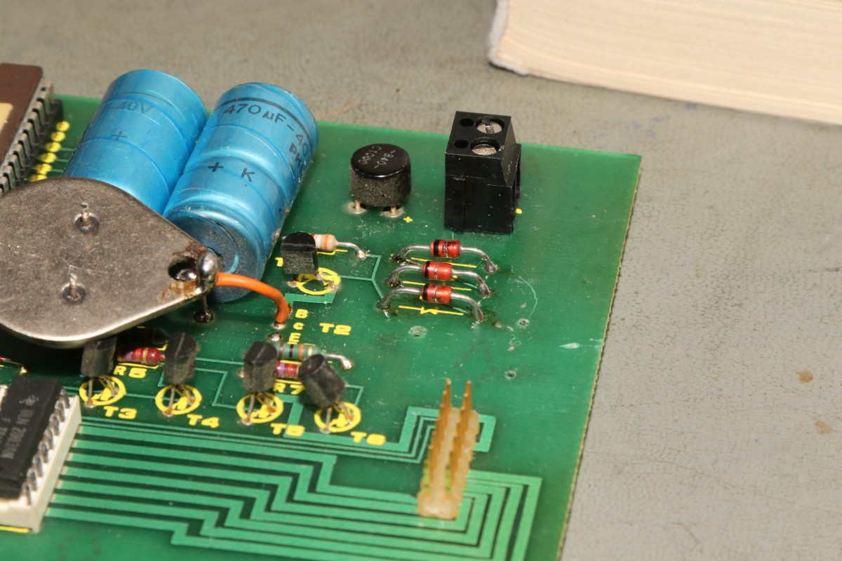 Und weiter im Text. Als Erstes hat mich der Umbau der EPROM-Karte gestört: diese wurde von Dreispannungs-EPROMs auf schnöde 2716 umgebaut, das aber auch nur halbherzig, da nur zwei Sockel umverdrahtet wurden. Da ich gerne 2708 brenne, habe ich das mal wieder komplett rückgängig gemacht. Im Detail: da hat wohl wer eine Axt zum Umbau verwendet... Wieder sauber gebrückt: Der 2716 war eh nur halb voll - die Adressbusumschaltung war gar nicht aktiv... der 2708 passt doch viel besser zum Gerät! Jetzt zum eigentlichen Teil dieses Kapitels: der Metallpapierdrucker! Das Teil liegt gehäusemäßig an +27V, da die Treibertransistoren für die Nadeln das nur so hergeben. Daher muss der Drucker isoliert in das Gehäuse montiert werden! Die Isoliergummis haben schon die besten Zeiten hinter sich... Hochspannung! Nicht wundern - der 30V-Trafo hängt an einem zusätzlichen Trenntrafo. Ich bin ja nicht leichtsinnig! Die Druckersoftware steckt im EPROM auf der Druckerkarte. Dieses adressiert ab 0xF000. Ein Start bei 0xF00E druckt zwei Mal eine Zeile, deren ASCII-Daten ab 0x0F00 im RAM stehen. Was könnte ich da wohl ausdrucken? War klar, oder? Aber der Kontrast lässt noch zu wünschen übrig... Ich erhöhe mal mit geeigneten Zener-Dioden die Drucker Versorgungsspannung... Sieht schon besser aus... leider ist der Druckermotor jetzt so schnell, dass der Rechner nicht mehr zuverlässig bei Spaltenzählen mitkommt... Das Druckwerk ist von Matsushita, Unterlagen dazu habe ich leider keine mehr gefunden. Der Typ: EUY-10E013L Hier sieht man das Zahnrad mit der Sensorspule für die Spaltenerkennung: 7 Nadeln, die auf der Druckzeile permanent auf dem Papier liegen - nur am Ende der Zeile wird der Kopf abgehoben. Jede Nadel kann einzeln unter Strom gesetzt werden und brennt die µm-dicke Aluschicht vom Papier weg. Da wird dann das darunter liegende schwarze Papier sichtbar. Ein simples Druckerkonzept, welches die Kosten für die Mechanik reduziert, dafür sündhaft teures Spezialpapier nötig macht... Das war jetzt mal die Hardware des SC/MP-Computers - schön, dass nach so langer Zeit wieder alles funktioniert! Im nächsten Kapitel werde ich mich demnächst mal mit der Programmierung des sonderbaren Prozessors beschäftigen. {Drucker Reparatur} Ich bin ja Perfektionist, so musste ich mich ganz gezielt mit der Druckermechanik beschäftigen - solche "Notlösungen" will ich nicht. Als erstes habe ich mal genügend Druckerpapier bestellt - das gibt es noch im Keglerzubehör und es ist unglaublich teuer... Dafür ist das Druckbild aber auch wieder einwandfrei. Der Unterschied zu überlagertem Papier ist signifikant - womöglich spielt Korrosion hier eine Rolle... Neue Durchgangstüllen ersetzen die krümligen alten Gummireste. Passt 1a. Der angesägte 2N3055 wird durch etwas Passenderes ersetzt: Die Abstandshalter sind sehr provisorisch. Das geht auch professioneller. Hier ist nicht viel Platz... Perfekt! Jetzt entspricht der Aufbau meinen Qualitätsstandards! {Matsushita EUY Dokumentation} Es ist zwar nicht genau der gleiche Drucker, aber immerhin so ähnlich! Deswegen wollte ich euch die Doku nicht vorenthalten. Danke an Markus B., der mich auf das Dokument hingewiesen hat!