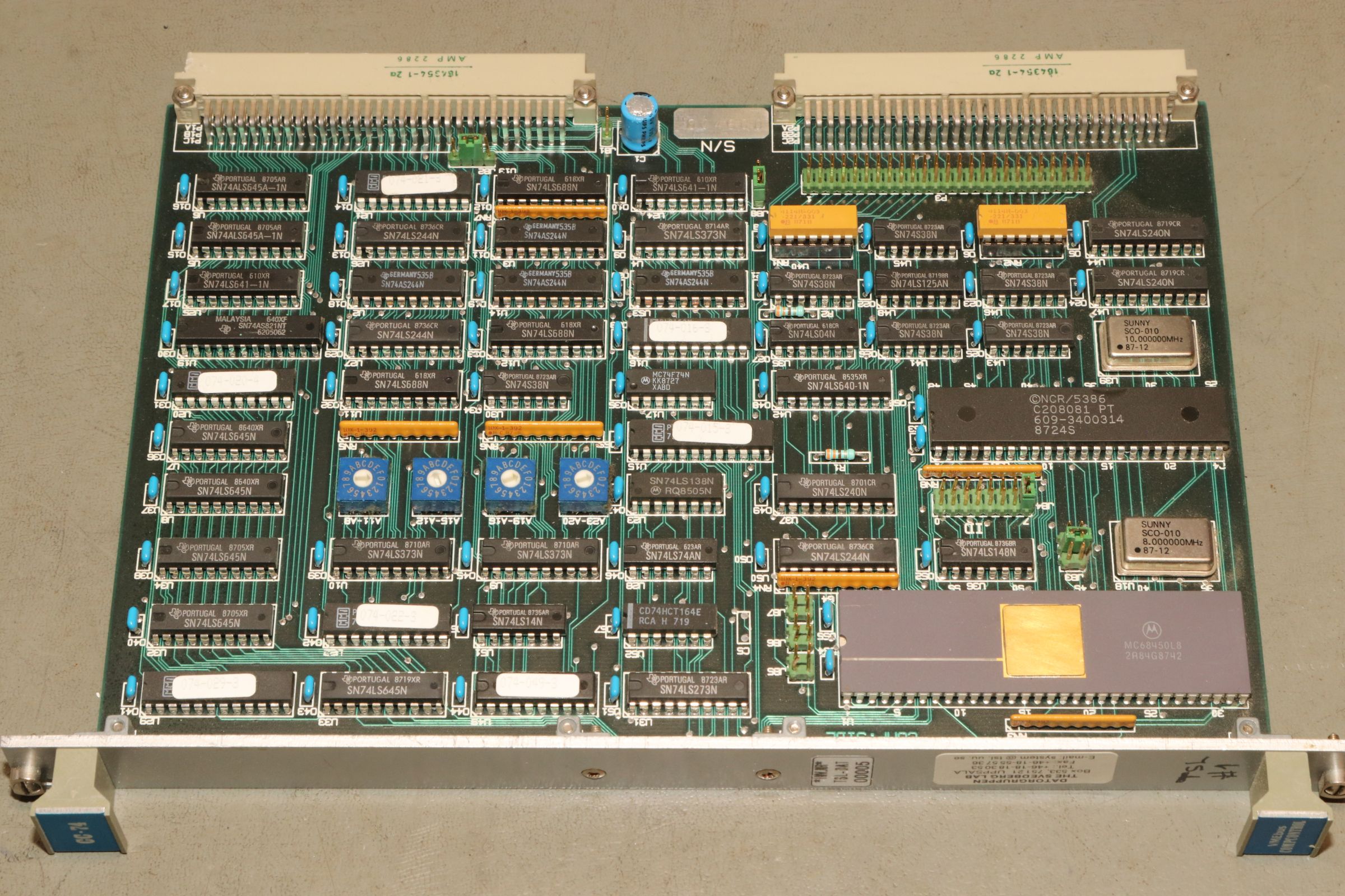 {VME-Bus Leiterkarten im Detail} Uwe aus Uppsala kennt meine Vorliebe für Elektroschrott aus diversen Filmen und hat dankenswerter Weise an mich gedacht, als der Elektroschrottcontainer mal wieder prall gefüllt war. Herzlichen Dank dafür! Heute geht es um den VME-Bus - Versa Module Eurocard-Bus - ein leistungsstarkes Bussystem, welches ursprünglich mal (1981) für den 68000 entwickelt wurde. Im Lauf der Jahrzehnte haben wurde eine riesige Vielzahl an Karten entwickelt, mittlerweile für alle gängigen Microprozessoren. 1981 spielte ich noch mit meinem Plastik-ZX-81 und ahnte nichts davon, dass es tausendfach leistungsfähigere Computersysteme in der "ernsthaften" Rechen- und Steuerungstechnik gab... Das war vielleicht auch gut so. Aber nun mal im Detail!