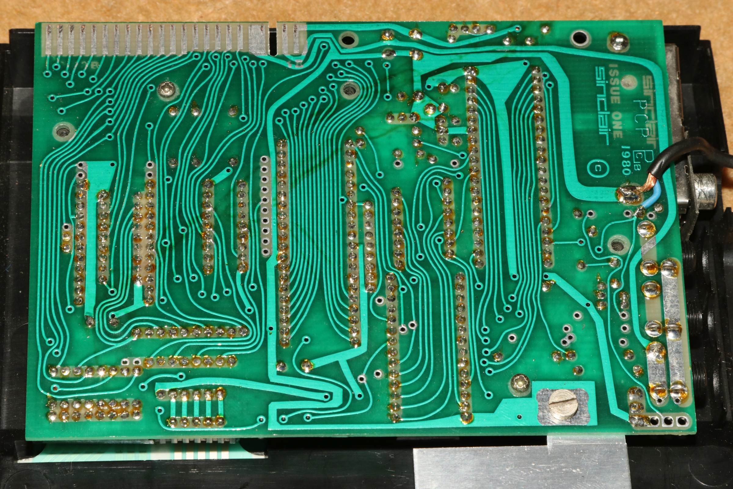 {Sinclair ZX-81} Wir schreiben das Jahr 1982 und ich fahre extra nach München, um dort einen Bausatz eines ZX-81 zum selber zusammenlöten zu erstehen. Der Spaß hat mich damals 150 DM Taschengeld und verständnislose Kommentare meiner Eltern gekostet. Wenn die geahnt hätten, dass dieser Plastikkrempel einmal meine berufliche Laufbahn mit begründen würde... Die Unterseite ist schmucklos - bleibt nur zu erwähnen, dass sich die Befestigungsschrauben unter den Gummipuffern befinden. Nach dem ersten Aufschrauben gehen diese Teile meist verloren. Die Konnektivität des Rechenkünstlers ist etwas überschaubar: TV-Buchse (hier mit Kabel als Video-Signal zusätzlich herausgeführt), Cassettenrecorderempfang und Wiedergabe. Im Inneren verbirgt sich genial wenig. Das imposante Teil aus Blech ist der Kühlkörper für den leistungsmäßig total unterdimensionierten 7805 Spannungsregler. Die Devise hieß halt damals: so billig wie möglich. Die Platinenunterseite als hochauflösendes Foto: Issue one... Issue heißt in der Übersetzung "Ausgabe"... aber auch "Problem". Ob uns das was sagen wollte? Die Oberseite der Platine ist schon interessanter. Sie hängt an den flexiblen Leiterbahnen der unsäglichen Folientastatur. Die Tastatur... kein Druckpunkt, keine Rückmeldung. Und wer viel mit dem ZX gebastelt hat, musste schnell feststellen, dass die Folie brüchig wurde und sich nicht löten ließ. Gottseidank gibt es auch heute noch Ersatzfolien. Die Platine in hochauflösender Darstellung! Links im Blechkasten der damals übliche TV-Modulator - wer hatte schon Monitore? Fernseher hatte jeder! Daneben die ULA (Uncommited Logic Array) - eine Spezialanfertigung für den ZX81 (später auch ähnlich für den Spectrum). Die ULA ersetzt alle TTL-Bausteine auf dem ZX80. Der kurze Baustein unten ist das Programm-ROM, weiter rechts die Z80-CPU und ganz rechts fette 2kByte RAM. Der leere Sockel ist eigentlich für einen 2114, der zweite 2114 liegt unterhalb des 6116 RAMs - damit hatte man im Grundausbau nur 1kByte zur Verfügung. Diese Modell ist also quasi massiv "up-ge-graded". Die Evolutionsreihe der 8-Bit Sinclair Homecomputer... ZX80, ZX81, Spectrum. |