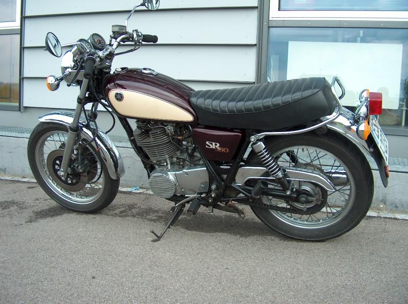 {Meine Yamaha SR-500} Baujahr 1979, 1 Zylinder 500ccm, 4-Takt. Zwei Ventile. Also alles, was ein Motorrad braucht. Mittlerweile hat mein Schätzchen 103.000km auf der Uhr, mit dem ersten Motor, aber zweiter Übergröße. Die folgenden Bilder zeigen noch das 1996er Tankdekor "Miyabi Maroon". Mittlerweile habe ich einen gebrauchten Tank und Seitendeckel auf 1979er Dekor umlackieren lassen. Das ist einfach originaler ;-)