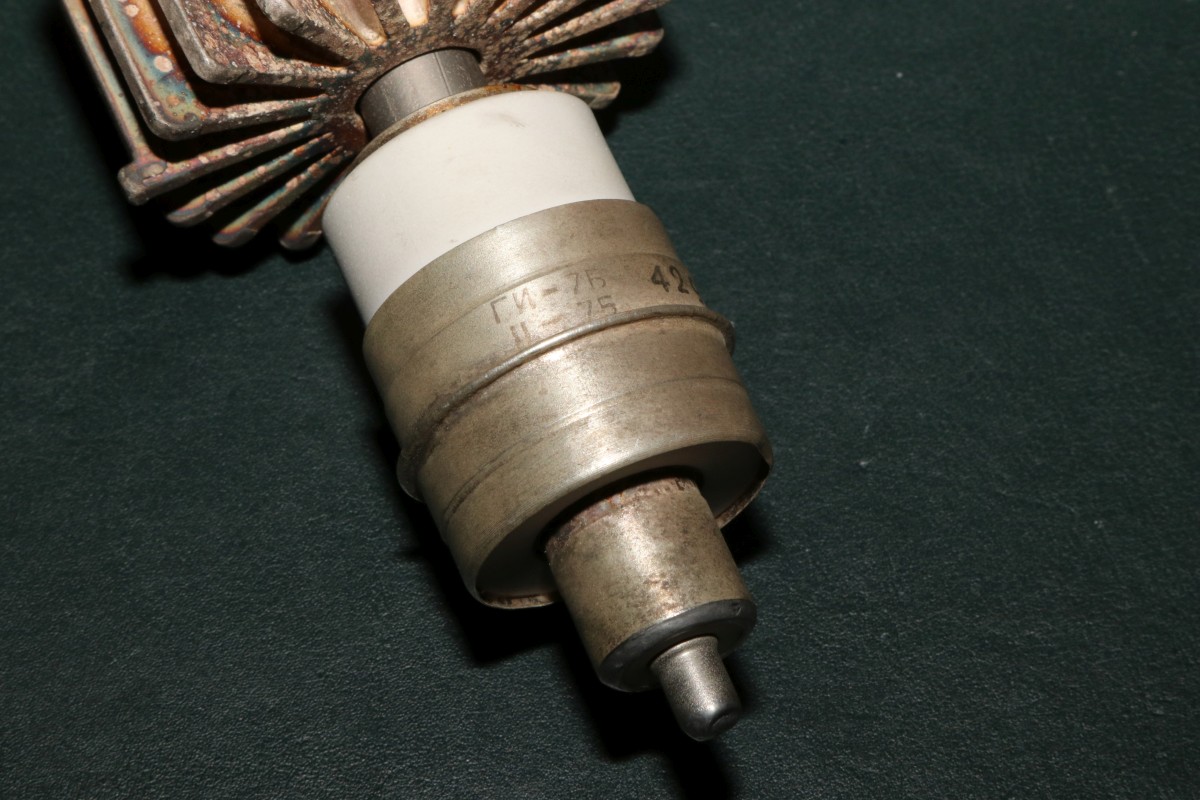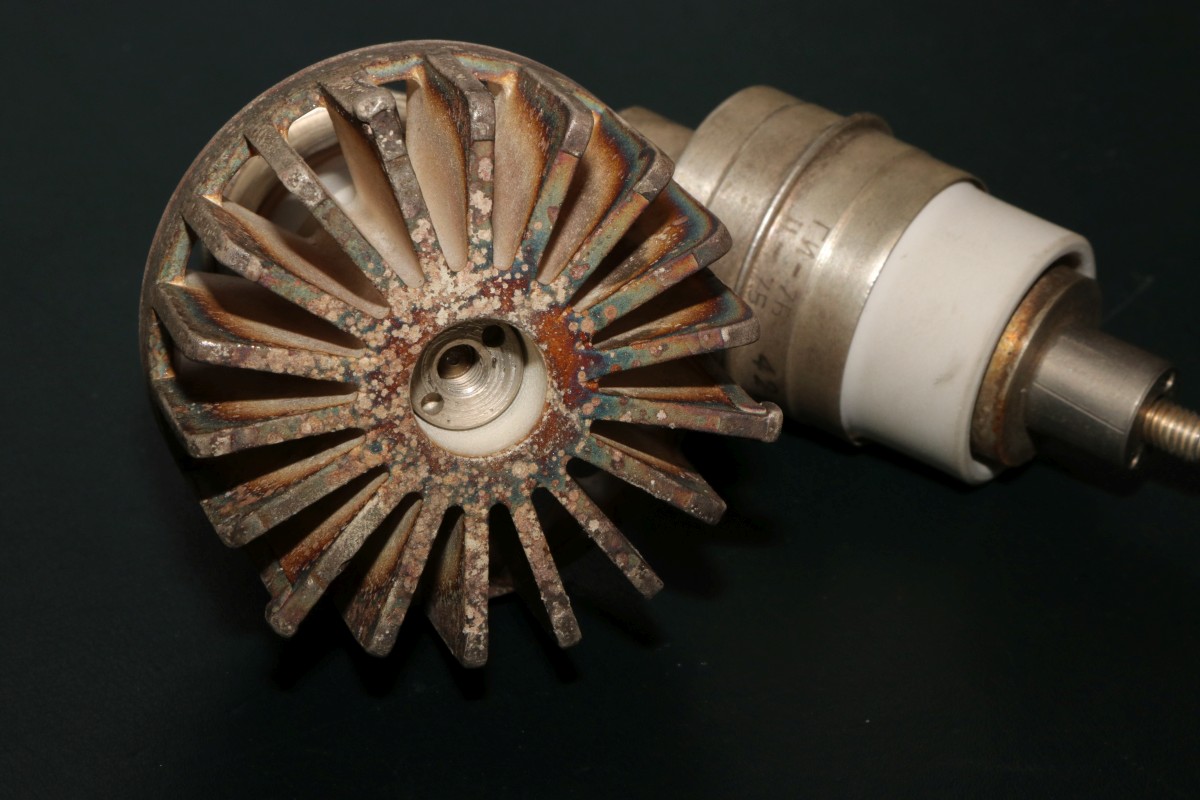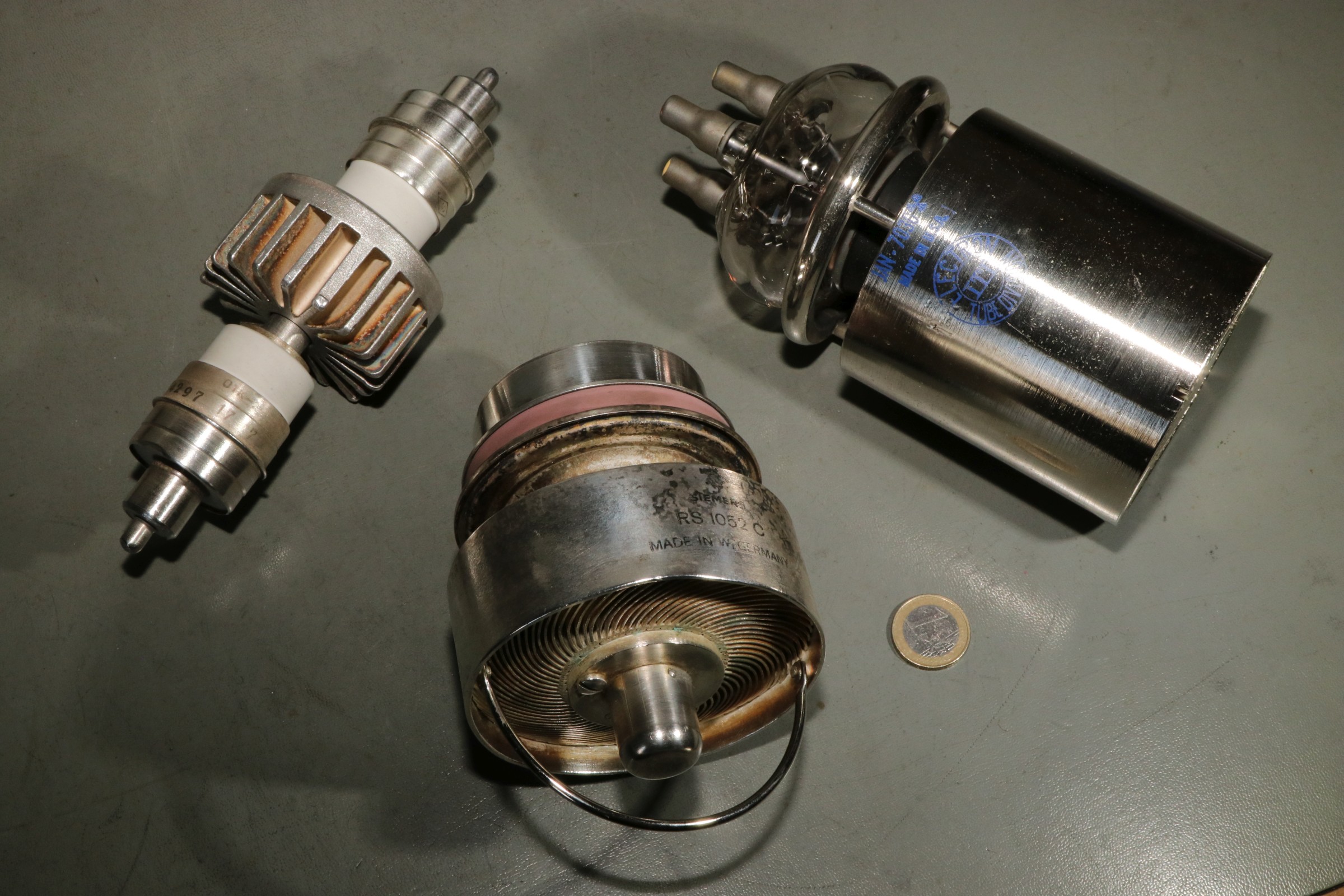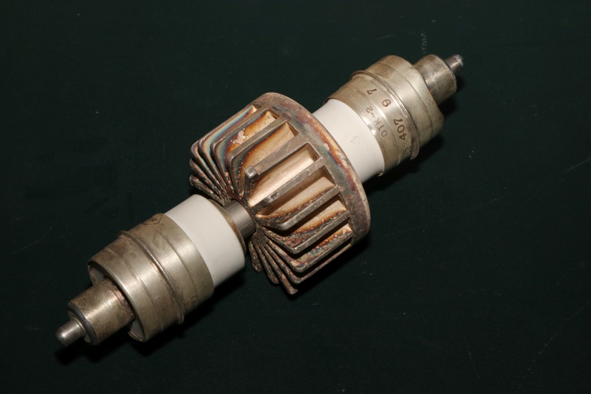 {Scheibentrioden von klein bis groß} Hier mal ein kurzer Ausflug zum Thema Scheibentrioden. Die machen als Hobby zwar wenig Sinn, haben dafür mit 1000V, mehreren KW und über 1GHz keine Probleme... Je nach Bauform. HF brachial! Ich bekam wieder Post von der Elektrobucht... Darin allerlei Röhriges - zum Beispiel diese russische Triode: Die sich bei näherem Hinsehen tatsächlich als zwei gegeneinander verschraubte Trioden entpuppt! Gegentaktstufe... und hier RS1052C - ein Klopper von Siemens, 1,5kg, Heizstrom 80A... dafür 790MHz, 3,3kV, 1,5A... - braucht man täglich... Hie ein 3GHz Triödchen der kleinen Bauform: 2C40A Eine YD1270: 4CX250M: TBL2/500 Und die Wald- und Wiesen-Triode 2C39A von verschiedenen Herstellern: Die gab es mit Glas- und mit Keramikisolierung... Hier noch eine kleine Scheibentriode unbekannten Typs, irgendwie erinnern mich die Kühlkörper immer an die Triebwerke aus Star-Wars... Eine TH316 - 270W Anodenleistung... Ja, es sind schon einige hübsche Exponate - vermutlich nicht mehr so gut, aber dafür hübsch anzusehen! Hier ist nur noch die Anode übrig - das verleitet mich zu einem Zerlegeexperiment im nächsten Beitrag! Und wenn man die Teile etwas putzt, dann sehen sie noch hübscher aus - Tube-Porn! Ein paar der nächsten Fotos sind sehr hoch auflösend - auf Mausklick! Ja, das ist keine Scheibentriode, aber eine brachiale Diode! Lag nur auch gerade so rum. 25kV Sperrspannung, 6A Dauerstrom... |