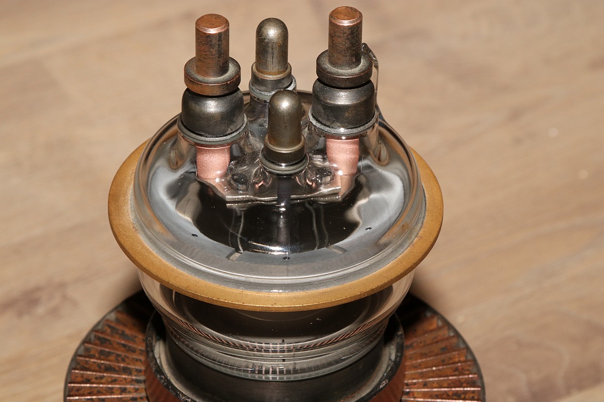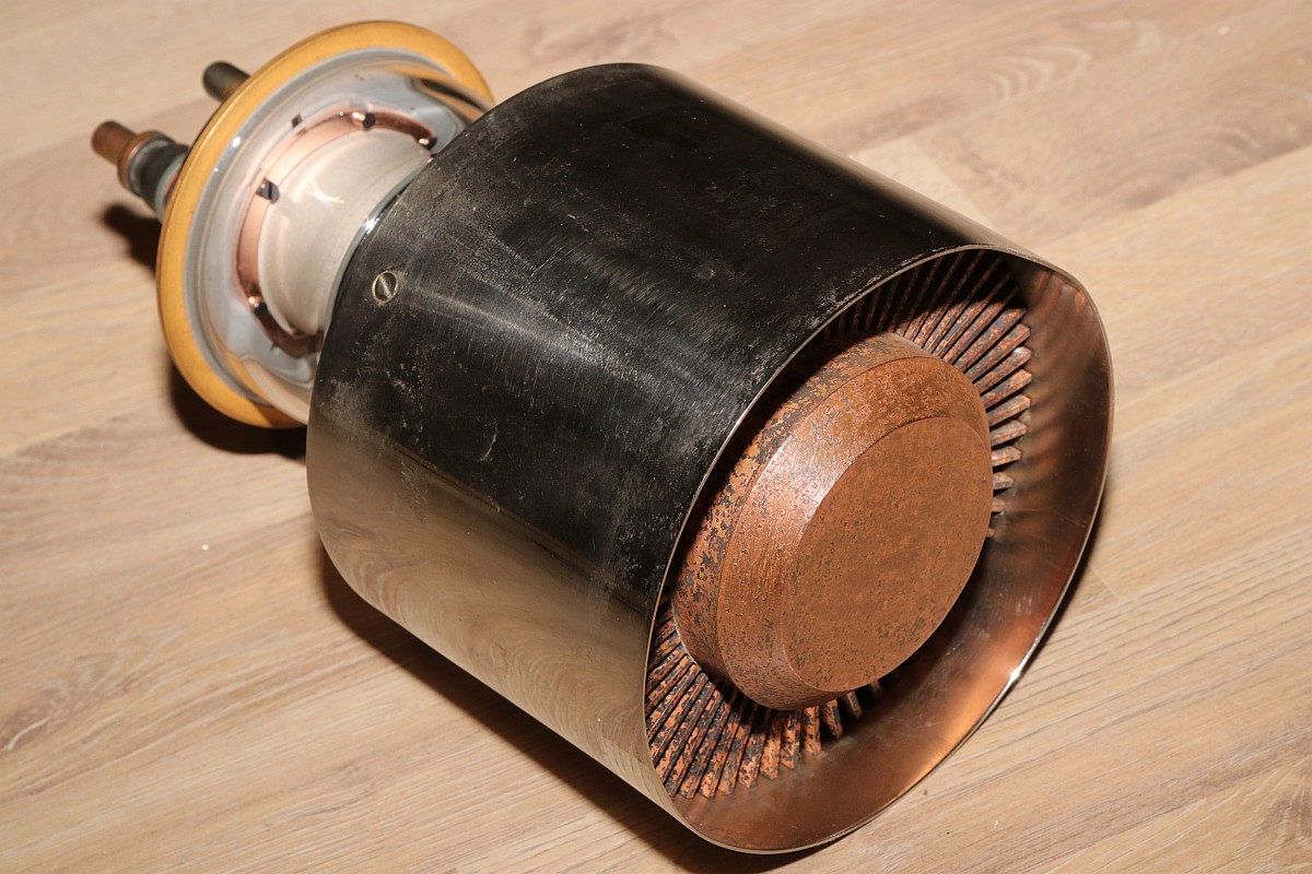 {Röhrentechnik brachial} manche Dinge sammle ich einfach deswegen, weil sie irgendwie stark aussehen. Sendetechnik im Kilowattbereich erfordert zum Beispiel solche starken Maßnahmen: 5,6kg Glas und Kupfer bringen die erforderliche Leistung bei mehreren 100 MHz in den Äther. Dabei ist die Technik so simpel - Glühfaden, Gitter und Anodenbleche im Vakuum - diese Teile überleben den nächsten Atomschlag aus nächster Nähe. Der 6116 (2kx8 SRAM)ist zur Einschätzung der tatsächlichen Größe mit dabei...