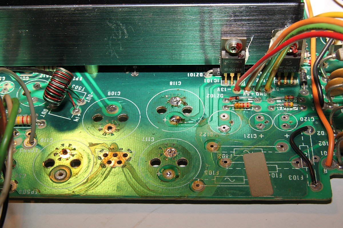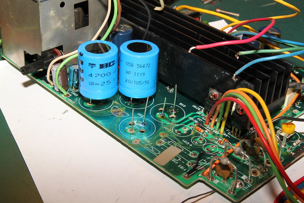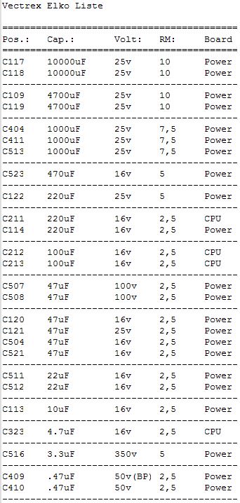 {Intention} Auch Vectrexen sind nicht vor der üblichen Austrocknung der Elektrolytkondensatoren verschont... das äußert sich dann in schlechtem Startverhalten und Problemen der Bilddarstellung. Elkos haben nur eine begrenzte Lebensdauer und besonders unter belastenden Umgebungsbedingungen (Hitze, hohe Spannung, hohe Puls-Ströme) mumifizieren diese Bauelemente innerhalb von wenigen Jahren. Die Lebensdauer eines Elkos ist im Datenblatt angegeben und beträgt zwischen 1.000h und 10.000h, je nach Hersteller, Preis oder Frechheit des China-Fakes. Diese Angabe gilt eigentlich bei den ungünstigsten erlaubten Randbedingungen... Danach hat der Elko nur noch einen Bruchteil der aufgedruckten Kapazität und die Schaltung funktioniert je nach Toleranz mehr oder weniger schlecht. Ein überdimensionierter Pufferelko im 5V-Zweig wird kaum negativ auffallen, aber ein hochbelasteter Elko im Schaltnetzteil, der aus Kostengründen schon auf Minimalkapazität ausgesucht wurde, sorgt für einen frühen Ausfall des ganzen Gerätes. Jetzt habe ich Kapazitäten frei... Sodele: Elkos erst mal raussuchen und abzählen... das sind fürchterlich viele... Zum Auslöten muss unbedingt die Netzteilplatine komplett demontiert werden, nicht alles ist gesteckt, so zum Beispiel die Ablenkspulen... Immer gut auf den dünnen Hals der Bildröhre aufpassen! Wenn da was abbricht, dann war's das! Dann endlich hält man das wertvolle Stück in Händen: Von der anderen Seite: Das Auslöten der Elkos ist eine üble Arbeit. Das Platinenmaterial taugt nichts, die Durchkontaktierungen sind extrem empfindlich und die Bohrungen bekommt man aufgrund riesiger Kupferflächen kaum frei. Bei den kleineren Elkos geht das, die vier Großen sind der Super-GAU. Und genau da passiert, was da fast immer passiert: aufgrund der konischen Beinchenform der Elko-Klopper (die sind nicht nur gelötet, sondern in viel zu kleine Vias gepresst!) sind die Durchkontaktierungen gerissen, vorgeschädigt und bleiben trotz flüssigen Lötzinns an den Beinchen hängen. Das ist kein Unvermögen, sondern dem schlechten Material geschuldet. Jetzt hilft nur der Workaround mit beidseitig verlöteten Hilfskontakten: Drei Stunden später: endlich fertig! Das mache ich nie wieder freiwillig... Eine Fixierung der hochstehenden Elkos mit Heißkleber oder Silikon empfiehlt sich - schon wegen der Langzeitstabilität. Und hier noch die komplette Elko-Liste mit Rastermaßangaben: ![]() |