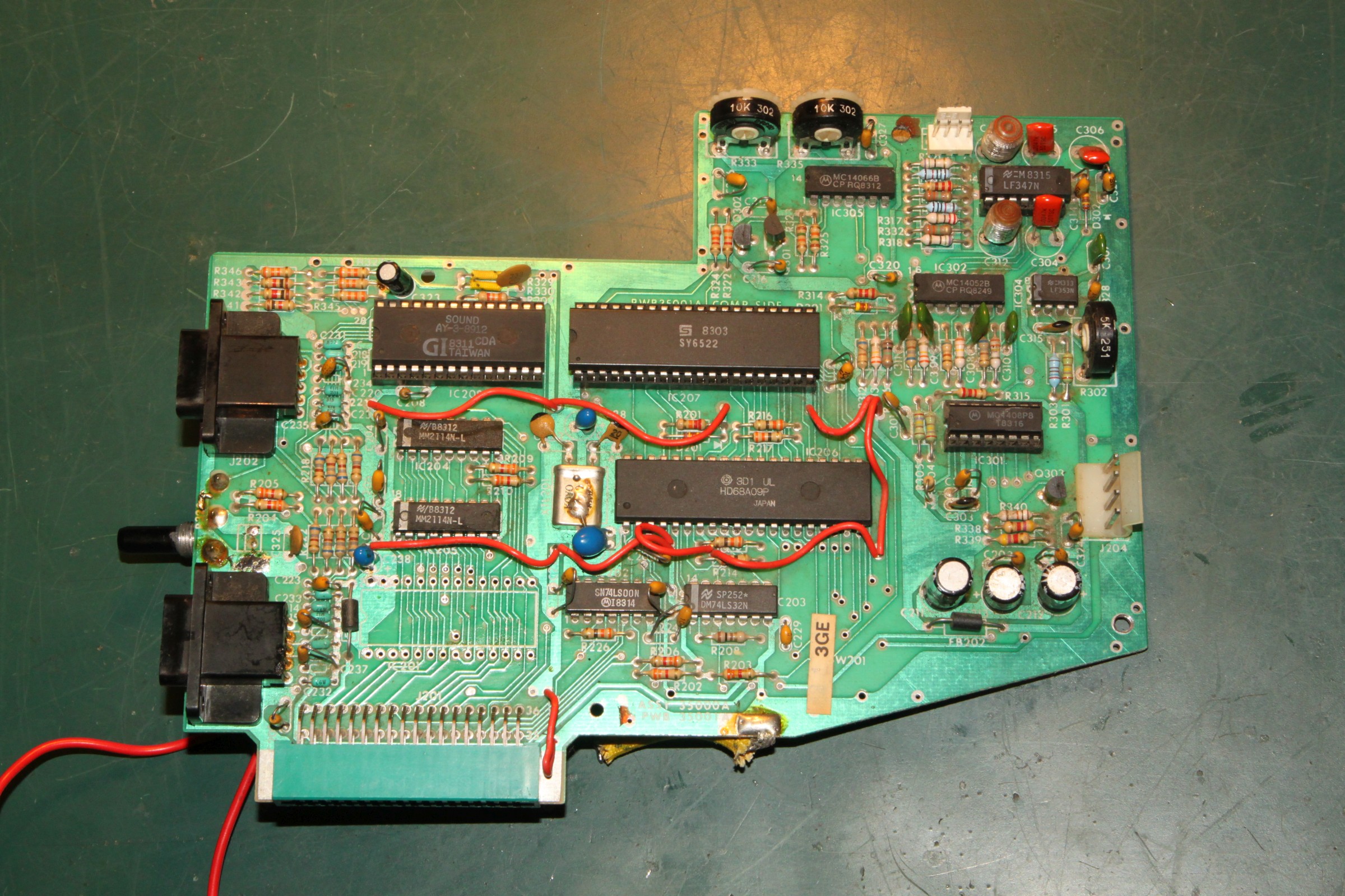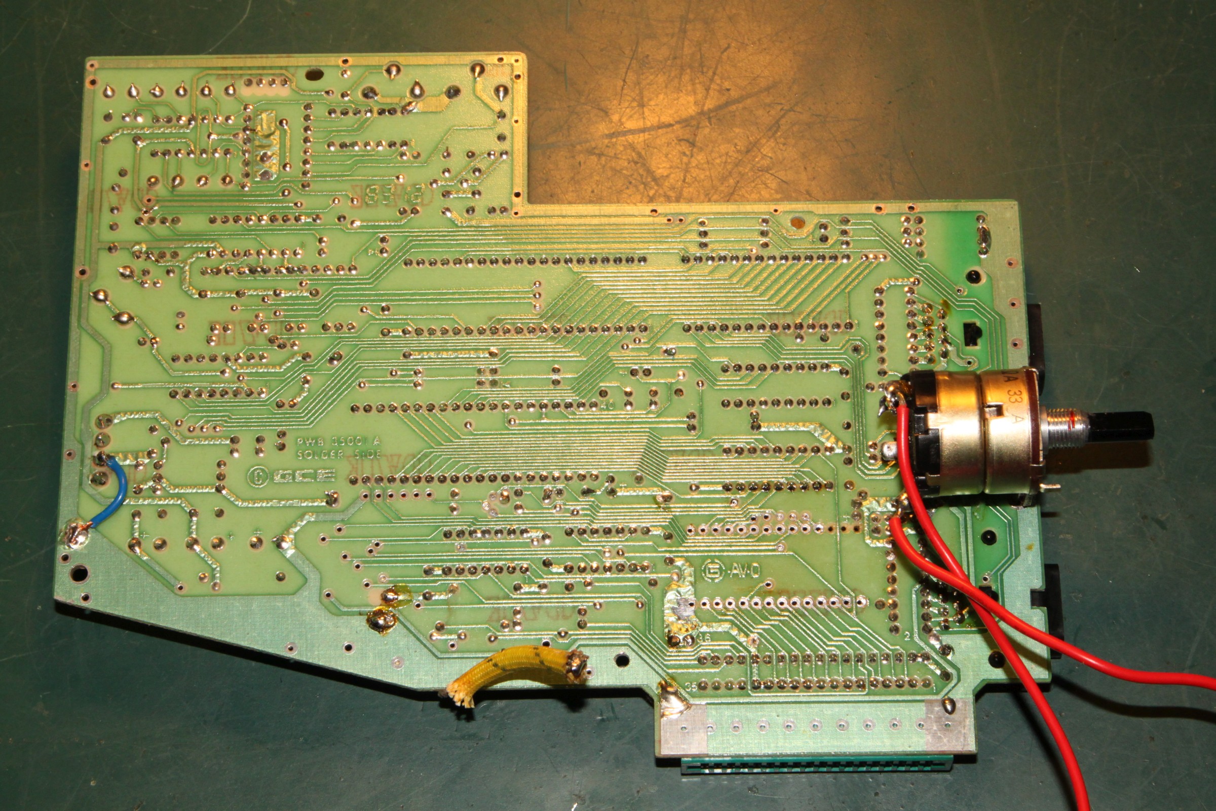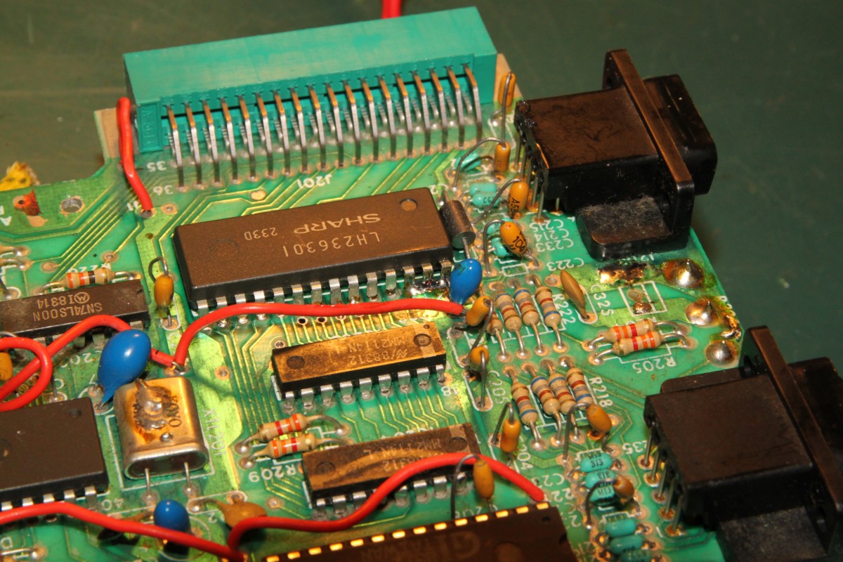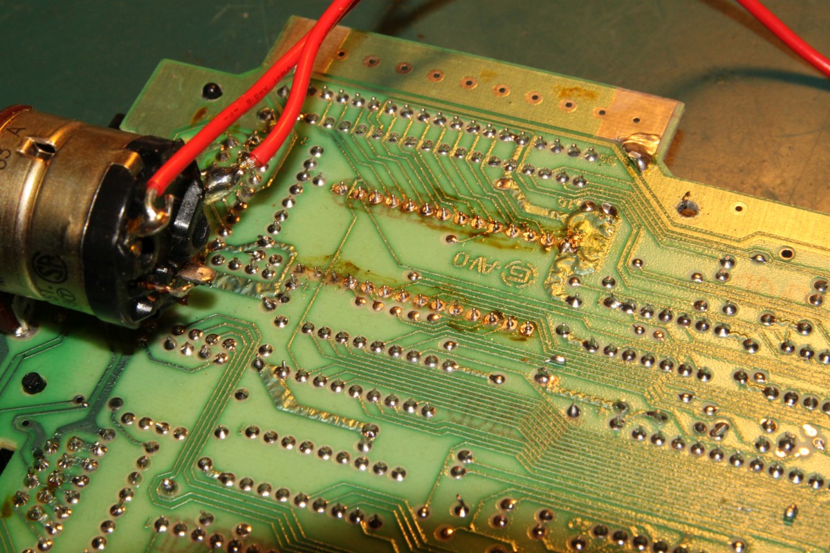 {Fehlerbeschreibung} Kunde... Vectrex... geht nicht... Drama... Aber das ist kein adäquater Vectrextransportkarton: Nach dem Auspacken sieht das Gehäuse schon mal blöd aus: Nach dem Öffnen fallen mir diverse Kuststoffteile entgegen. Ein stabiler Karton wäre sicher eine gute Idee gewesen. Einmal mit dem Multimeter messen enthüllt: die Sicherung ist durch. Ausgetauscht und ... Geht. Leider kein Ton und die Vektoreinstellungen muss ich auch alle nachregeln... Erstmal Mechanik... ich bin da ganz eigen, es mus für die Ewigkeit halten, daher scheidet Sekundenbäpp grundsätzlich aus, außer zum fixieren der abgebrochenen Teile: Hier hilft nichts mehr, da fehlen die Krümel... Ein alter Filzmarker und UHU Plus geben die nötige Stabilität: Die Hülsen werden mit dem Heißluftfön auf die nötige Weite gebracht und auf die Stutzen gesetzt... Hier ist der Spalt zu sehen, der gleich mit Epoxydkleber gefüllt wird. Keine Angst, das Zeug kriecht langsam aber sicher da hinein... Und fertig: ![]() Schweinkram, elendiger... Also: Den ROM-Sockel musste ich komplett entfernen, die empfindlichen Vias waren teilweisse rausgerissen und auf beiden Seiten löten geht nur direkt am IC... Das angeknabberte Stromkabel hab ich mal aus Sicherheitsgründen professionell geflickt: Der Aufwand war enorm, die Ursache des Schadens sinnlos. Aber die Vectrex lebt wieder! Für die Interessierten Leser: die Vectrex CPU-Platine in voller Auflösung: ![]() |