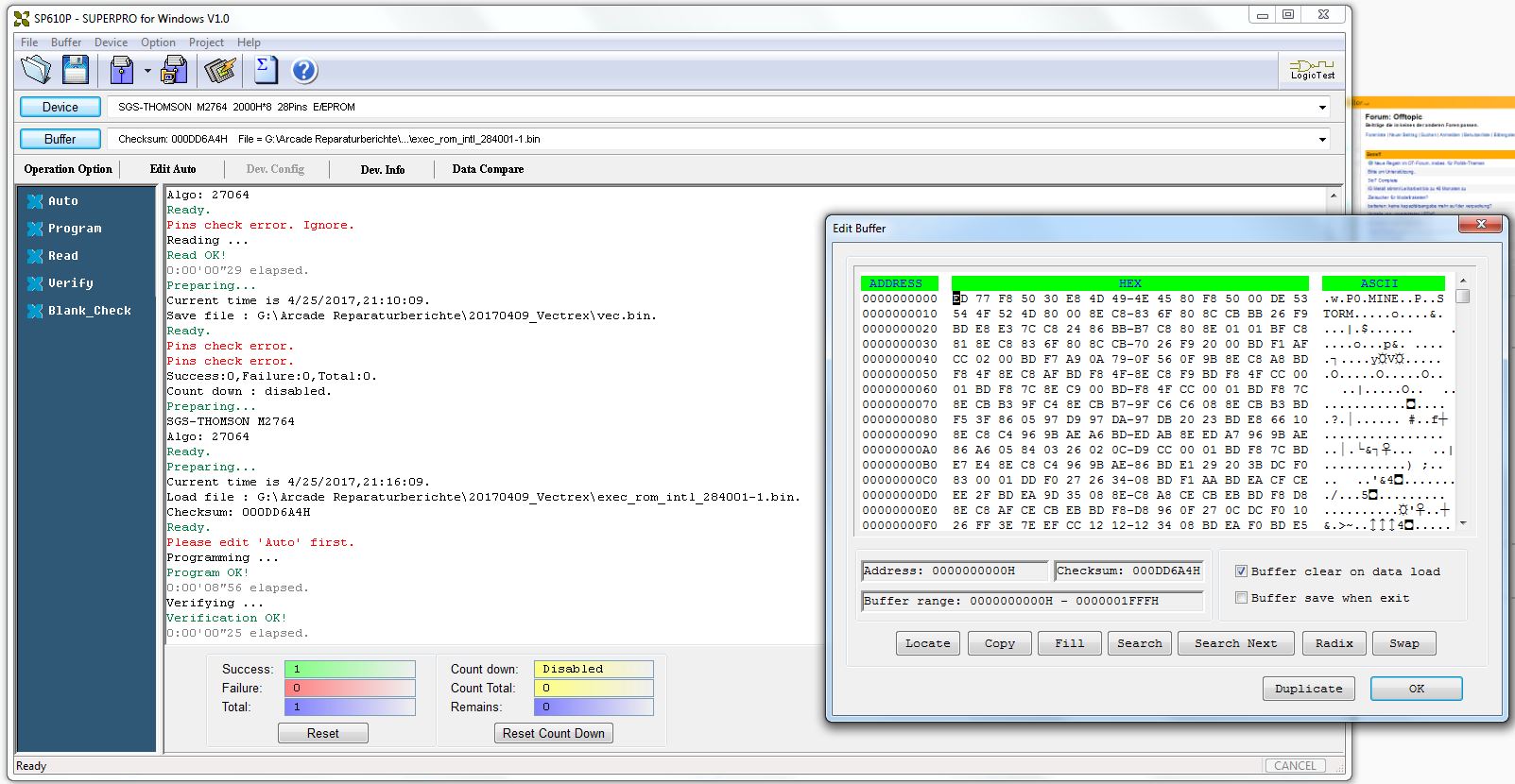 {Fehlerbeschreibung} Der Nachteil von Webseiten ist, dass verzweifelte Besitzer defekter Arcade-Hardware auf einen aufmerksam werden... So wieder mal der Besitzer einer Vectrex, die außer einem Punkt nichts weiter produzieren will... Hier mal der Patient: Der Pfeil zeigt auf den Punkt. Meine Große lernt übrigens mit. Sie ist mit auf dem Bild... ;-) Dann habe ich mir mal die Adressbusse näher angesehen, hier bei meinem funktionierenden Exemplar: ...und hier beim Patienten: Fazit: Netzteil geht, I/O geht, Prozessor scheint zu laufen, Adressbuss läuft in langweiliger Endlosschleife... Was könnte es sein? 6809 doch defekt? Programm-ROM kaputt? RAM (2114) defekt? Ich werde auf jeden Fall mal einige Teile auslöten und Sockel spendieren! An die Lötstellen der ungesockelten Bauteile kommt man gottseidank auch ohne Demontage der PCB ran. Ich sockele alle ICs, will ja nachher nicht noch mal ran. Sieht doch sauber aus. Der Lötsauger hilft sehr, die Temperaturbelastung bei der Billigplatine zu minimieren. RAM raus: Alles raus: Sockel rein: Super - am Ende hab ich alle Originalteile wieder in die Sockel gesteckt, um das Ganze noch mal auszuprobieren. Eines der RAMs hat sich so verkeilt, dass bei der erneuten Demontage ein Beinchen abgerissen ist. Im Sockel. Jetzt muss ich noch mal einen Sockel auslöten... Sowas musste ja passieren, als ob so eine Vectrex wegen der Kabel, Stecker und verschachtelten Bauweise nicht ekelig genug wäre... Hier in Pin 2: Ein guter Tip von Astro: Einzelpin heiß machen und von unten rausdrücken, parallel dazu oben mit der Pinzette packen und rausziehen. Funktioniert perfekt und der neue Sockelpin passt einwandfrei in die entsandene Lücke... Leider waren es nicht die 2114 RAMs, nächster Halt: Programm ROM. 284001 ist 2363 ist 2764... Wenn der Programmer schon sowas meldet: Datenpin nicht ansprechbar Also neu gebrannt: Und den 2764 einfach eingesetzt - ja, auf der Vectrex sind PROMs und EPROMs pinkompatibel. Auf den Cartridges nicht! Heureka! Und dann noch der übliche Kandidat - der verharzte Drehschalter: Mittels eines gefederten Schnappmechanismus werden zwei drehend gelagerte Kontakte auf zwei Anschlüsse geschoben. Die Federkraft ist gering, somit ist die Mechanik darauf angewiesen, leichtgängig zu funktionieren. Das Konstrukt ist gefettet und nach 30 Jahren hoffnungslos verharzt. Die Kontaktfahnen drehen sich immer schwerer, solange bist die Kraft nicht mehr ausreicht und einer der beiden Kontakte nicht mehr schließt. Je nachdem, welcher es ist, fällt entweder die Digitalelektronik (5V) oder die Ablenkspannung (kein Bild) aus. Daraus resultiert übrigens auch das Phänomen, dass die Vectrex erst Minuten nach dem Anschalten plötzlich angeht. Das liegt nicht an irgendwelchen schlechten Kondensatoren, wie viele meinen, sondern einzig und alleine daran, das sich die verharzten Kontaktzungen im Schneckentempo auf ihren Zielkontakt zubewegen! Das Öffenen des Schalters und die Reinigung mit Aceton / Schmierung mit Öl dauert 3 Minuten. Der Zusammenbau der Federmechanik hat wieder fast eine Stunde gedauert... ![]() |